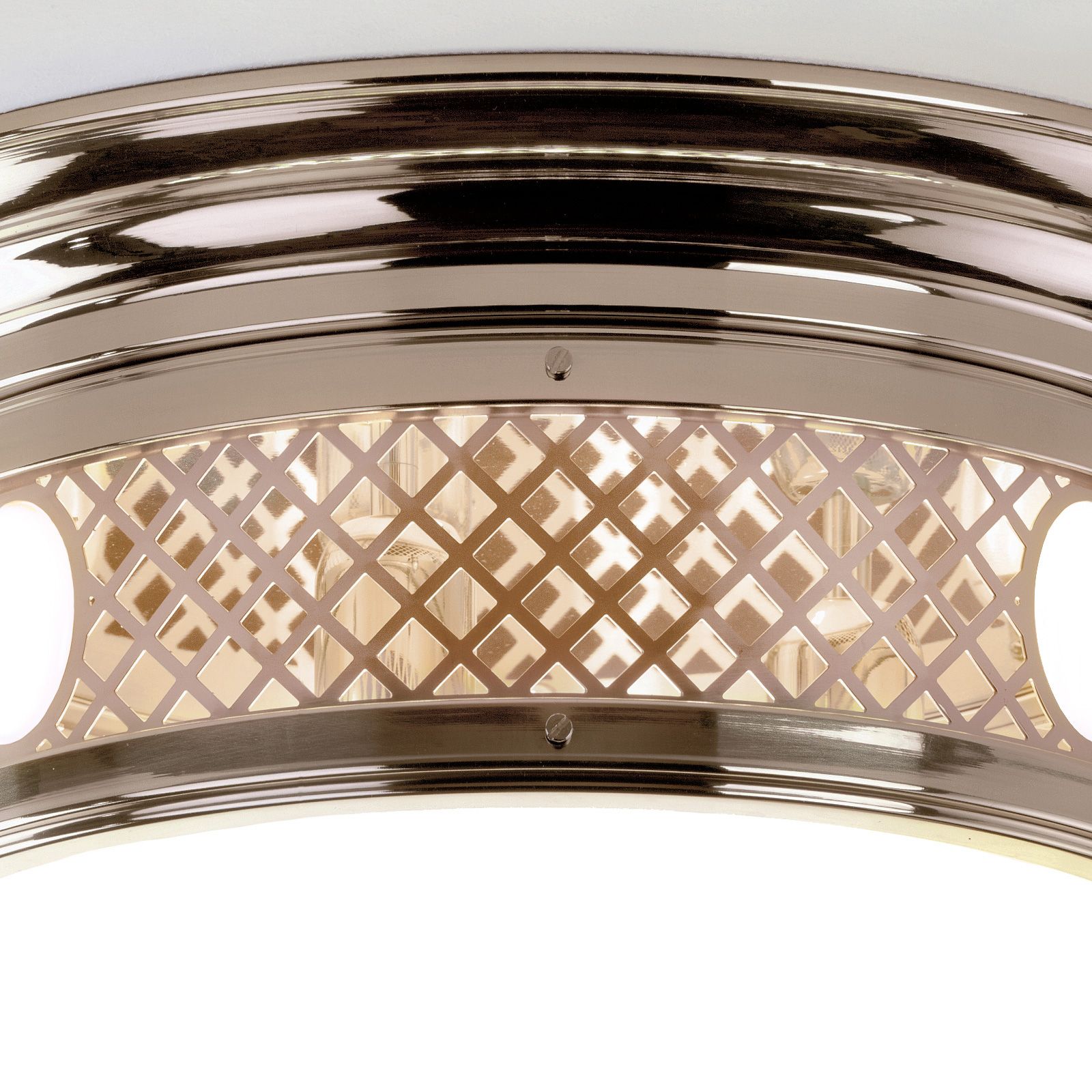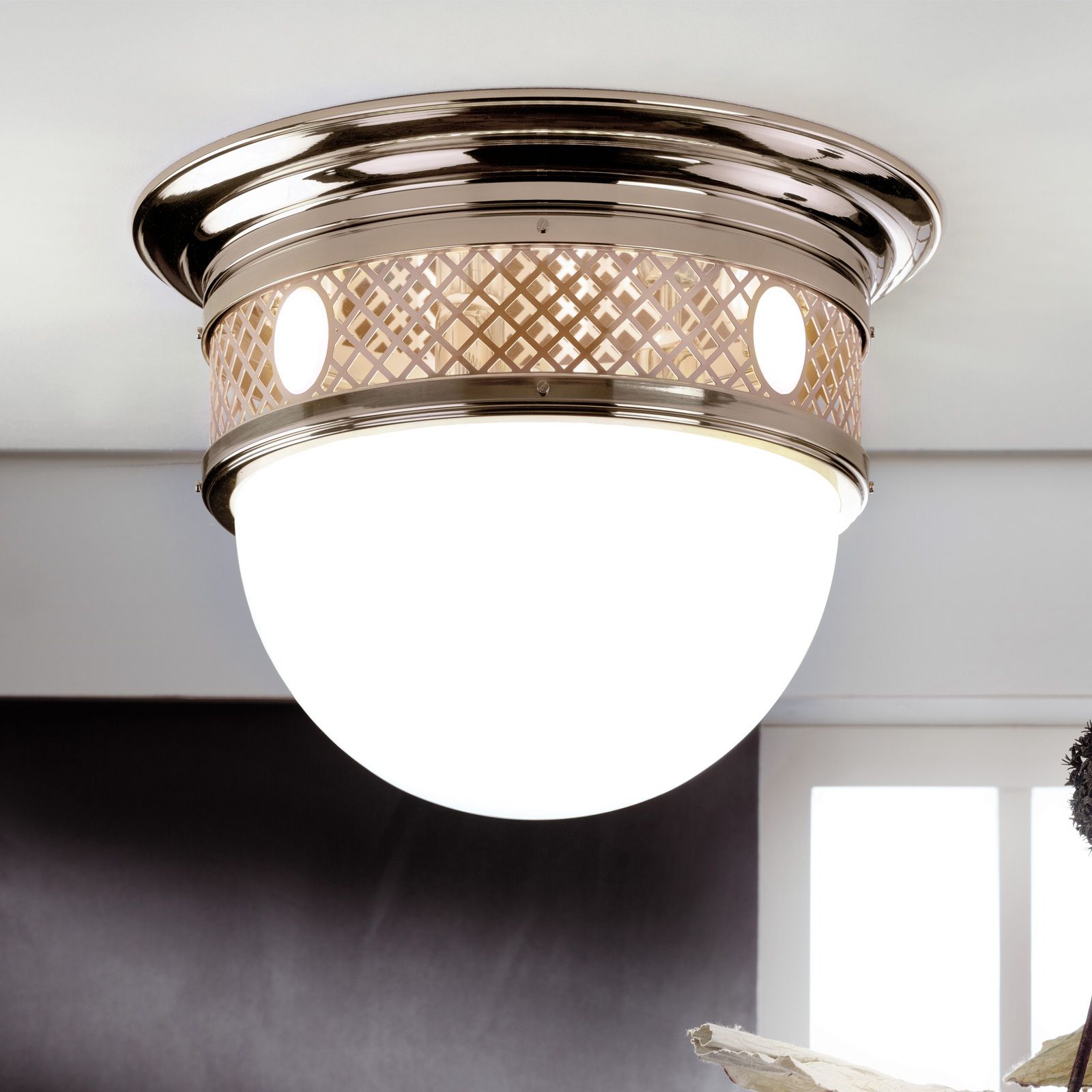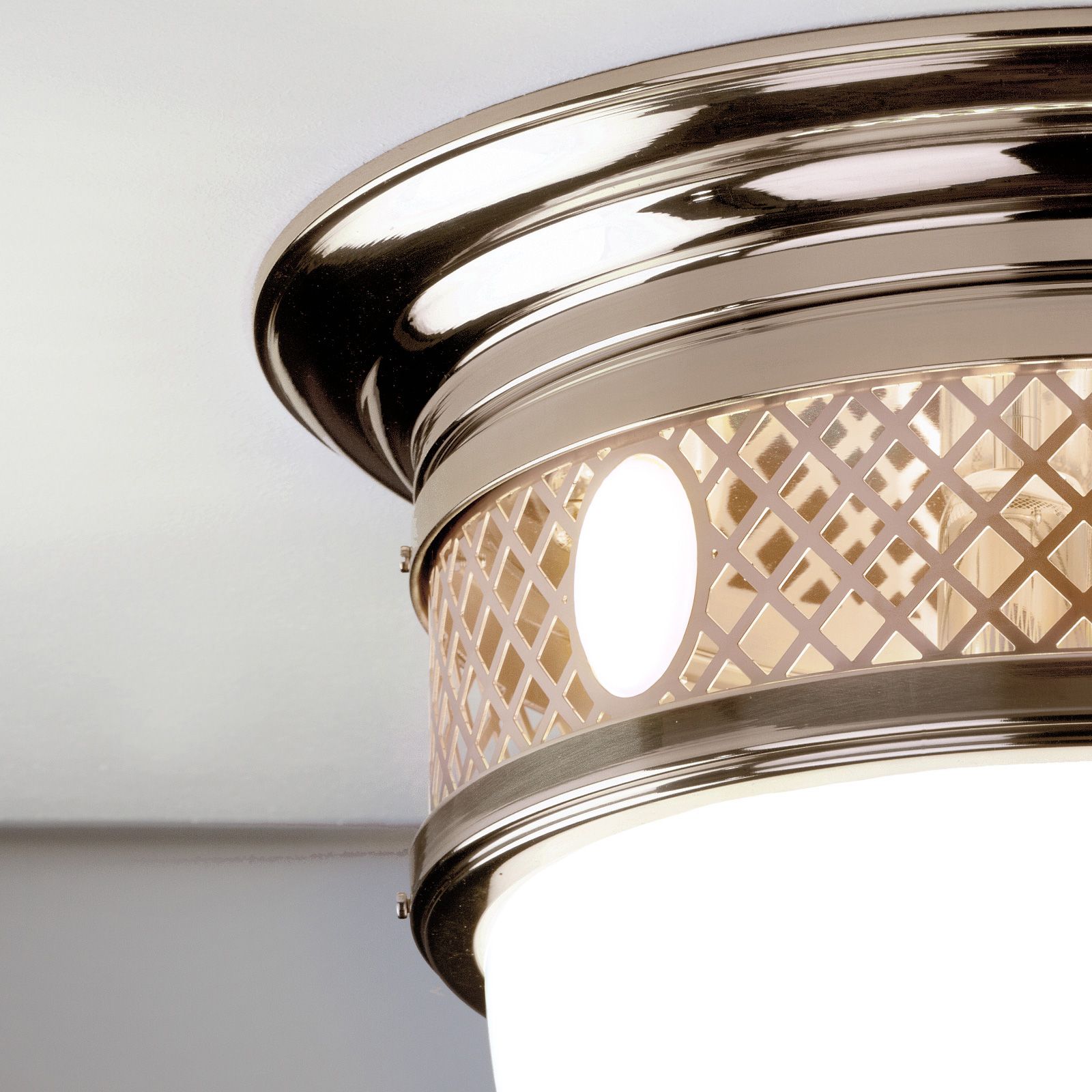 The transition from eclecticism to modernity can be seen in this ceiling light from the ALT WIEN series. The desire for ornamentation is moved aside by progressive thinking. Utility, especially industrial repetition brings forth new clear forms that flatter the eye with very few deliberately placed decorative elements. The fine lattice with oval applications fulfils this function while simultaneously creating leeway for light and illumination. The stepped, rounded profile creates a soft, elegant transition to the ceiling.