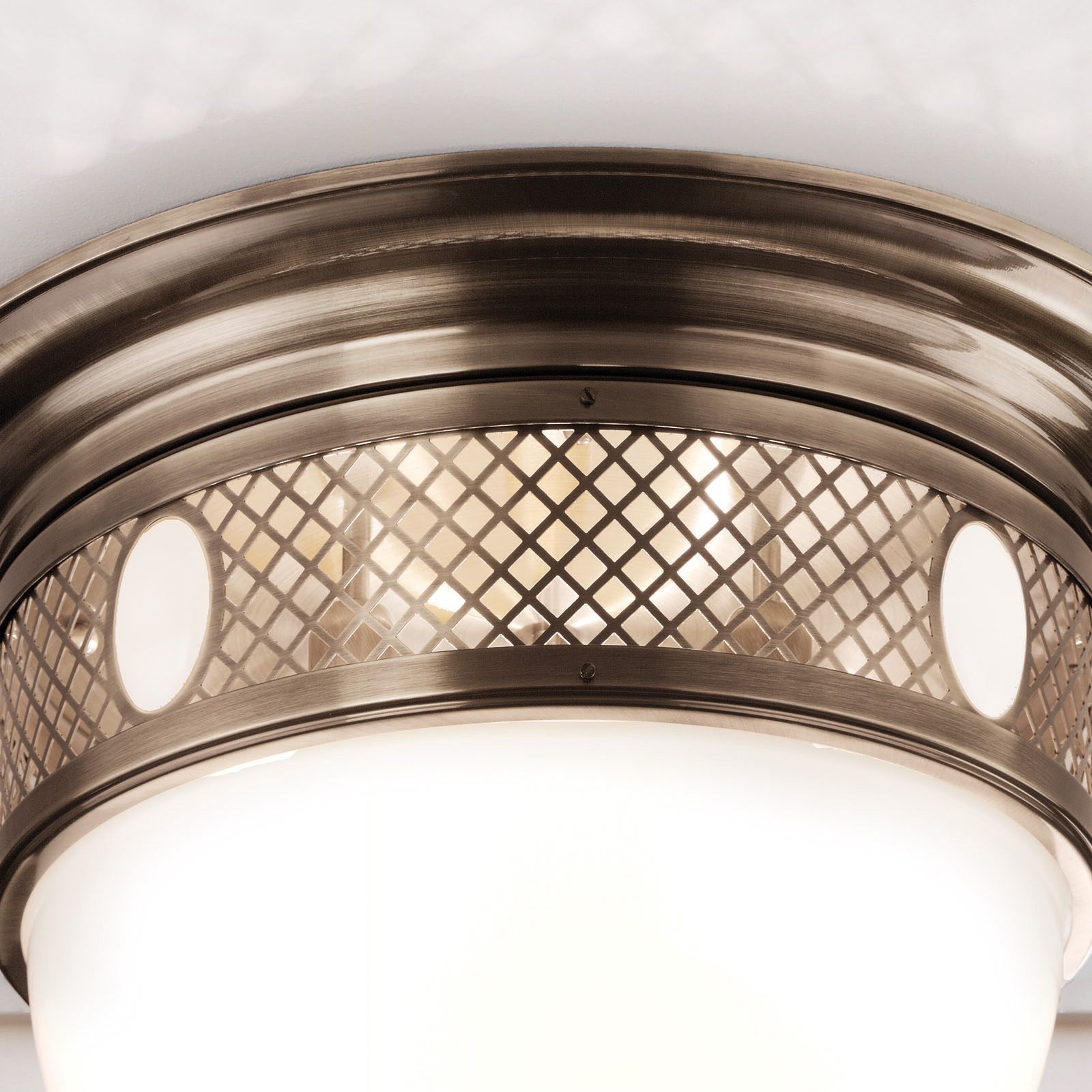 This ceiling light from the ALT WIEN series serves two purposes with its imposing diameter of 63 centimetres: On one hand, its sheer size and luminosity from nine sockets illuminates generously sized rooms. On the other hand, the light's imposing presence makes it an essential design feature. Its dominant position in the centre of any room decisively determines the room's overall mood. A simple hemisphere shines out of a stylishly designed surround. Simple oval Art Deco inserts in a fine brass grid were chosen to create sophisticated value. The ceiling light has six E27 sockets for up to 60 watts each.