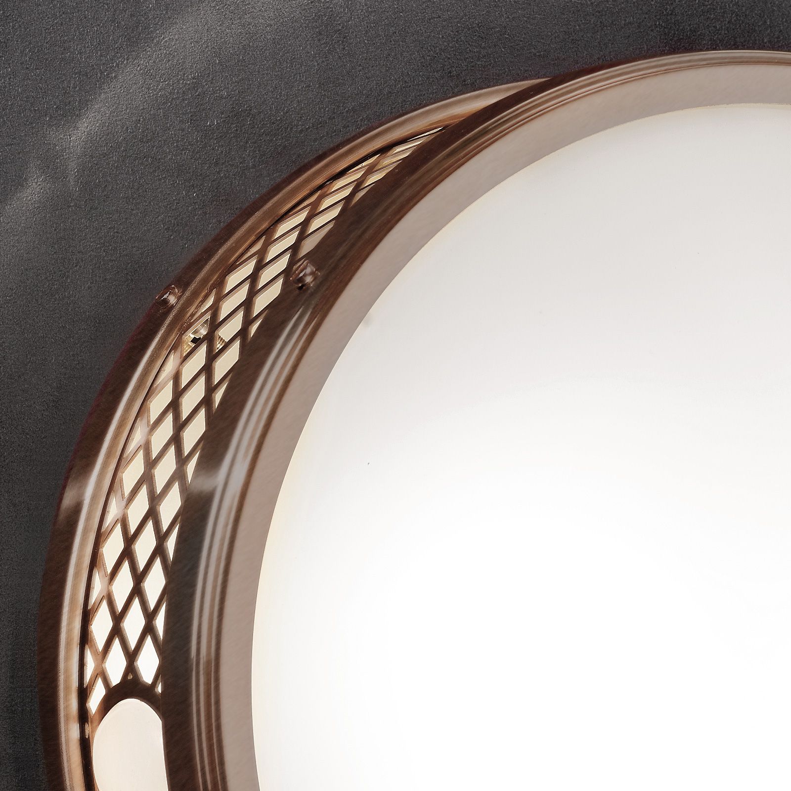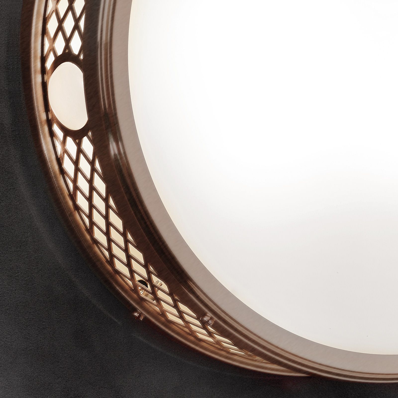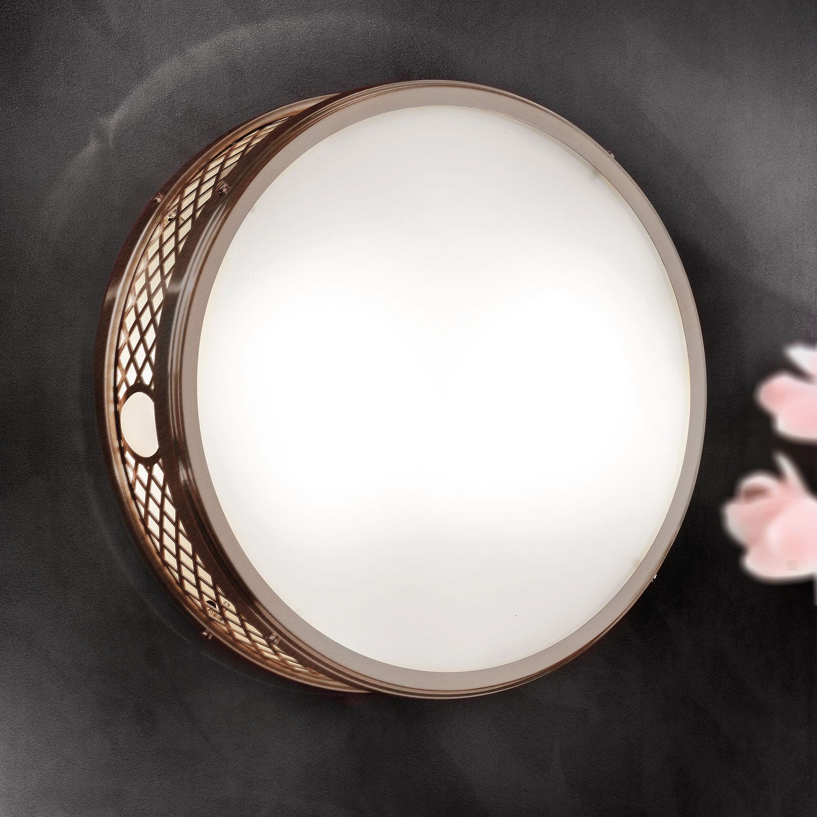 The light's design is of restrained elegance, inspired by the Vienna Secession style of Art Nouveau at the turn of 19th to 20th century. Oval applications and a fine brass grid, through which light and shadow play is cast on the ceiling, provide evenly distributed illumination. The ceiling light is equipped with two E14 sockets for up to 40 watts each.