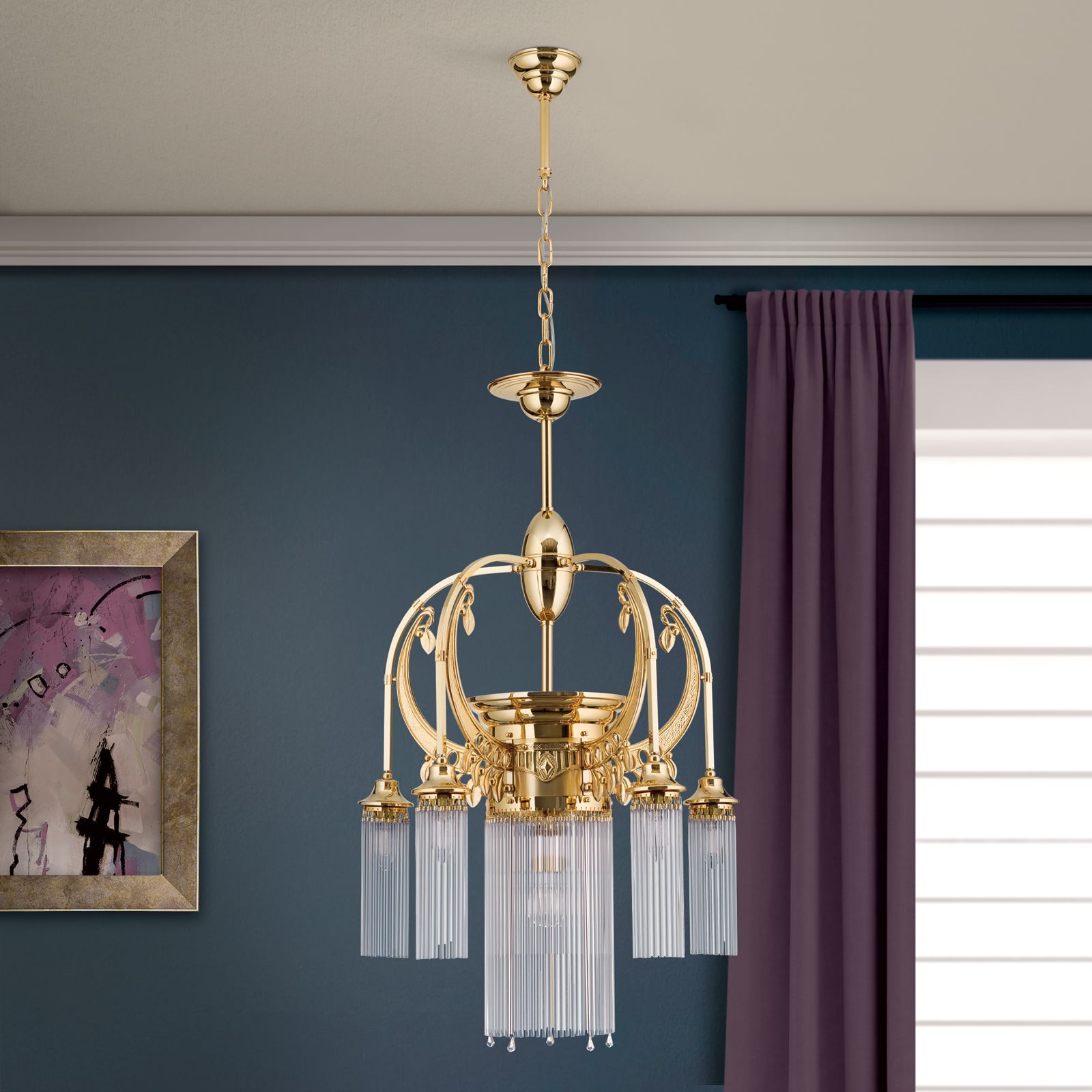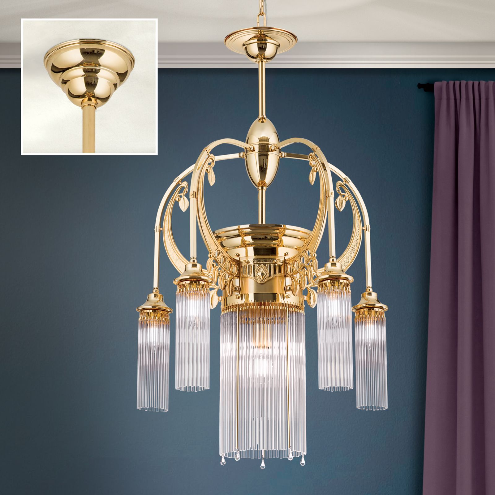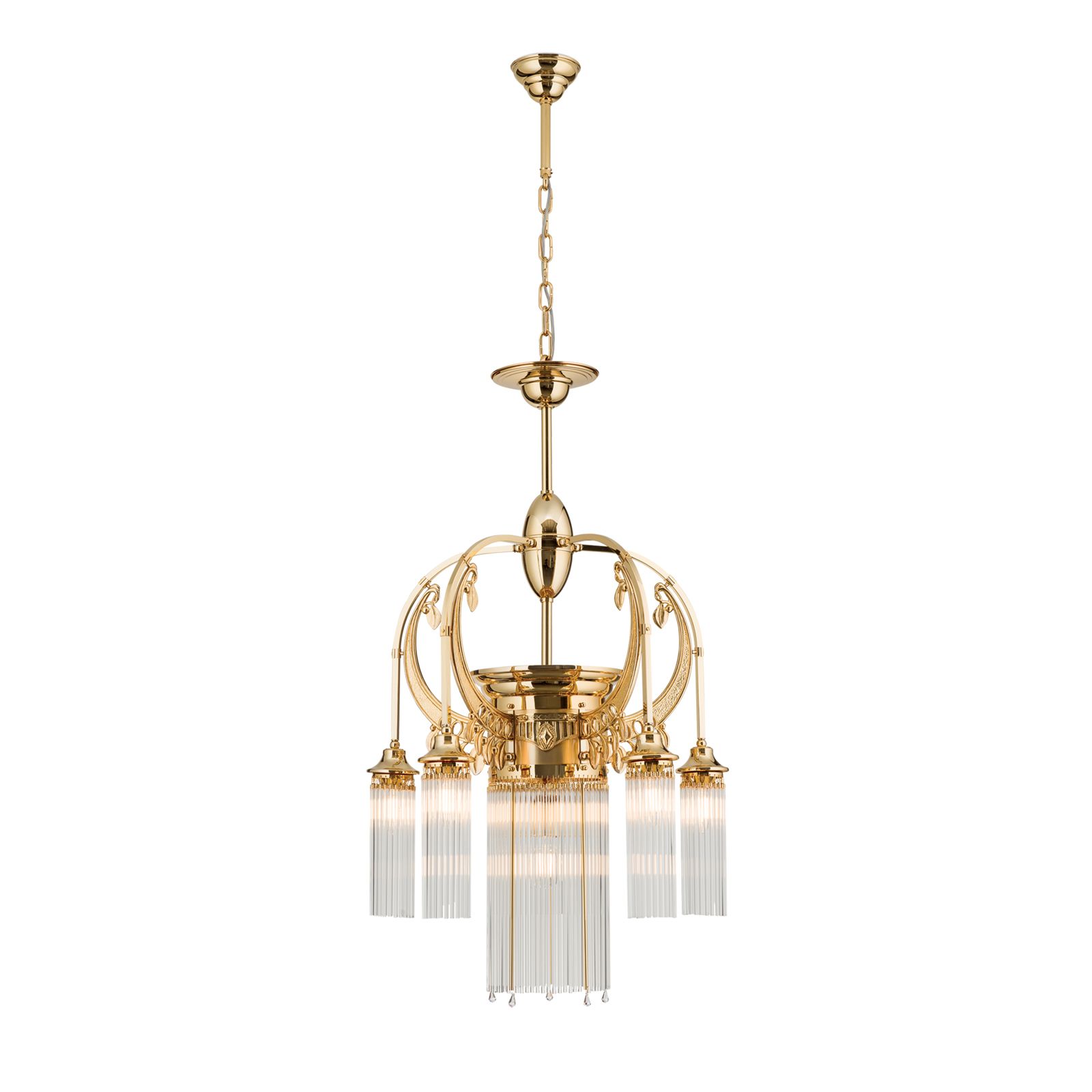 When choosing a chandelier from the ADELE series, you get handcrafted masterpieces that are in no way inferior to the originals from Vienna Secession. Blissful floral motifs entwine the central lamp in a crown-shaped procession. In keeping with the motto "Ver sacrum" - Holy Spring - the chandelier appears to be in full bloom. In the middle of living rooms, the blossoms will open up providing charming light reflected many times in rich brass ornaments - or dimmed, they will bring a mystical touch to any bedroom. The chandelier is fitted with five E14 sockets for up to 40 watts each and one E27 socket for a maximum of 60 watts.
