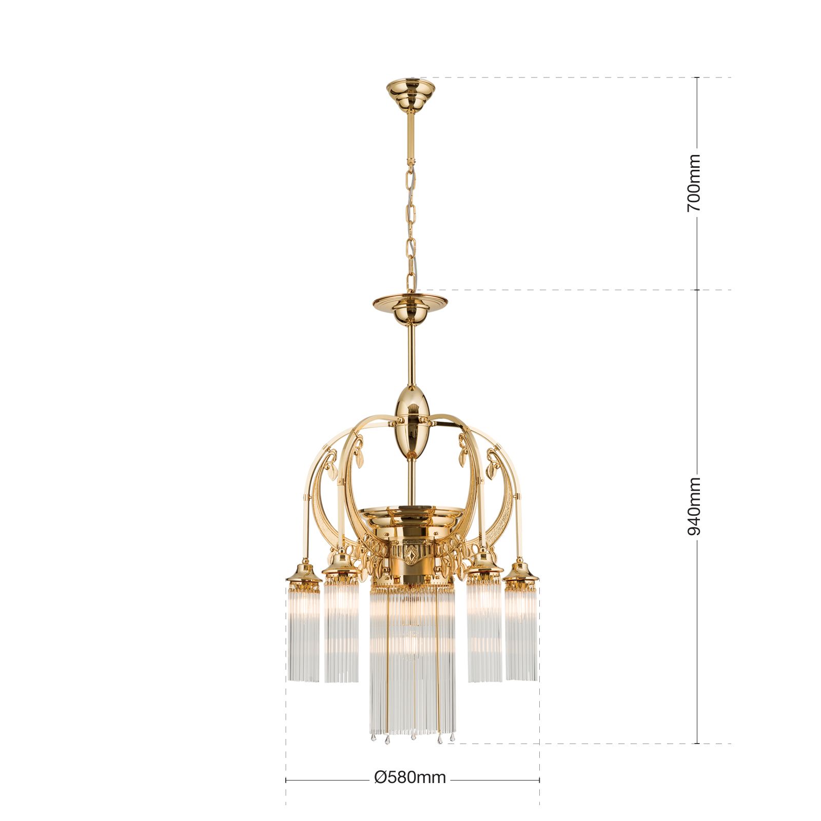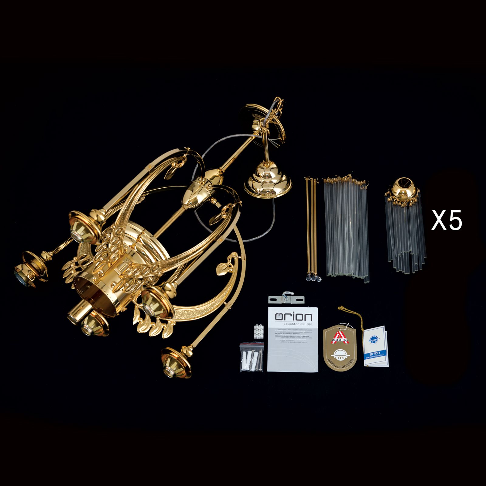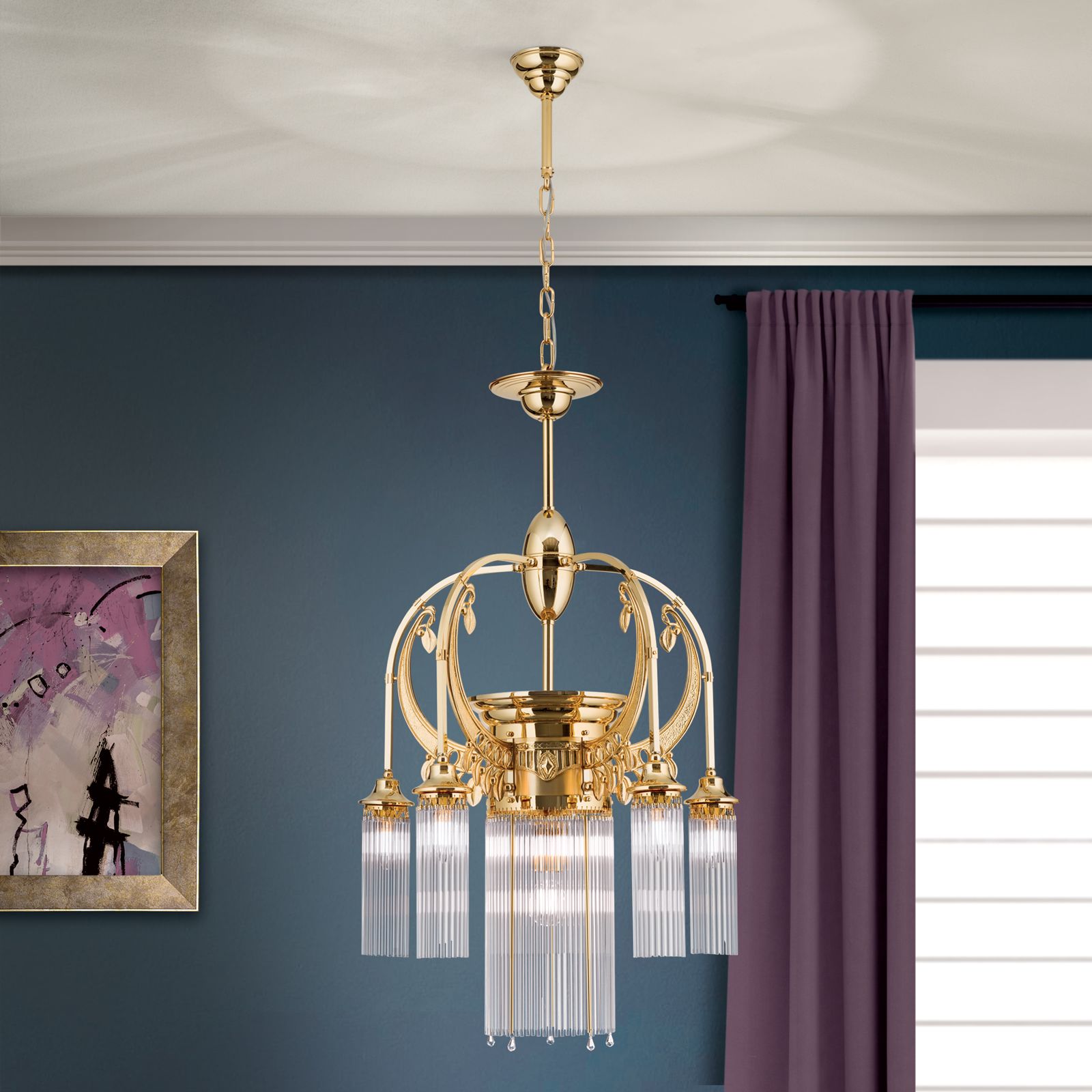 When choosing a chandelier from the ADELE series, you get handcrafted masterpieces that are in no way inferior to the originals from Vienna Secession. Blissful floral motifs entwine the central lamp in a crown-shaped procession. In keeping with the motto "Ver sacrum" - Holy Spring - the chandelier appears to be in full bloom. In the middle of living rooms, the blossoms will open up providing charming light reflected many times in rich brass ornaments - or dimmed, they will bring a mystical touch to any bedroom. The chandelier is fitted with five E14 sockets for up to 40 watts each and one E27 socket for a maximum of 60 watts.