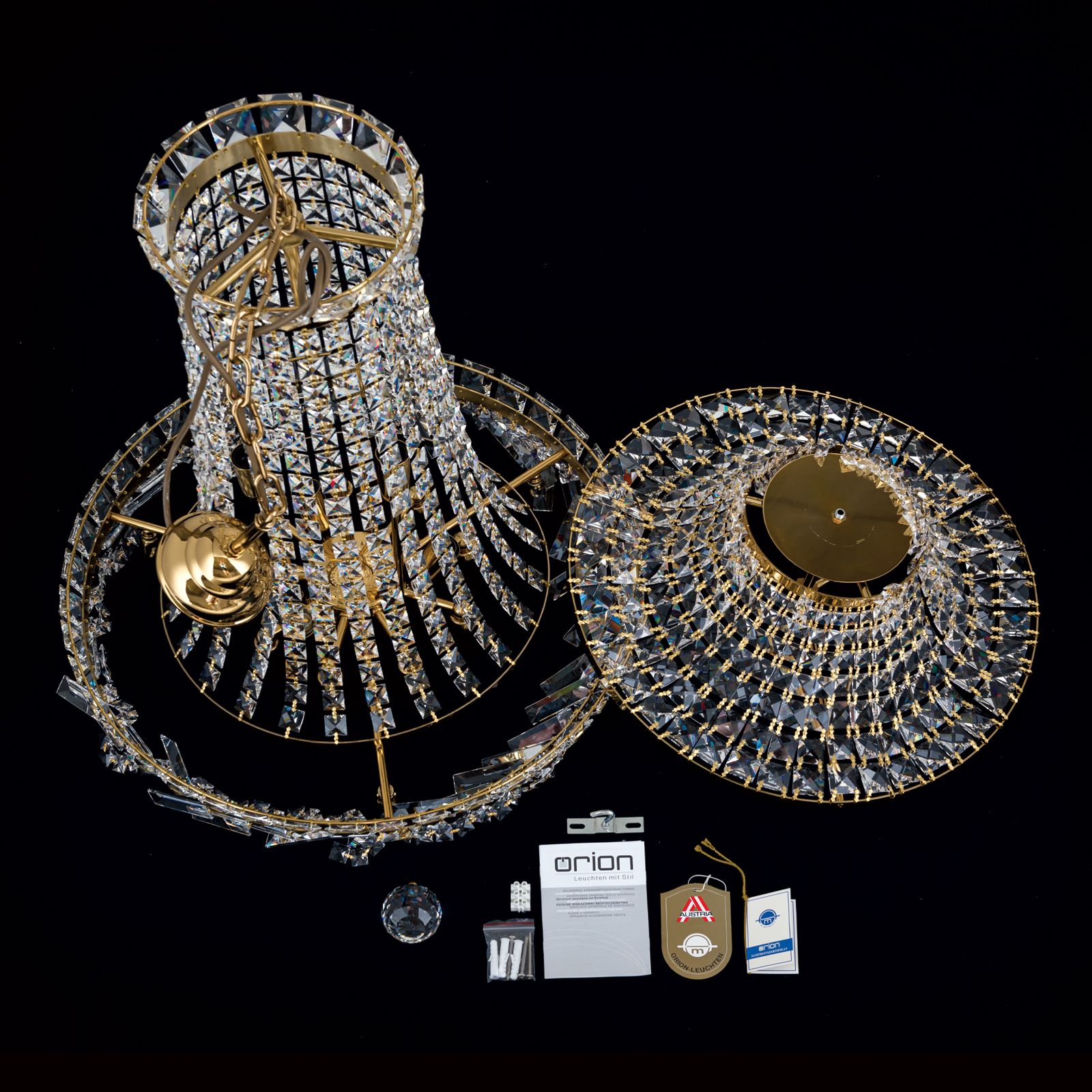 The combination of STRASS® Swarovski® crystal chandelier crystals and chrome-plated solid brass parts harmonises perfectly with light incidence creating spectacular reflections in any room. The chandelier's crystal comes in prisms and square stone cuts as well as a large crystal ball - the chandelier's grand finale. Equipped with 15 E14 sockets, it can be fitted with 40 watts maximum each.