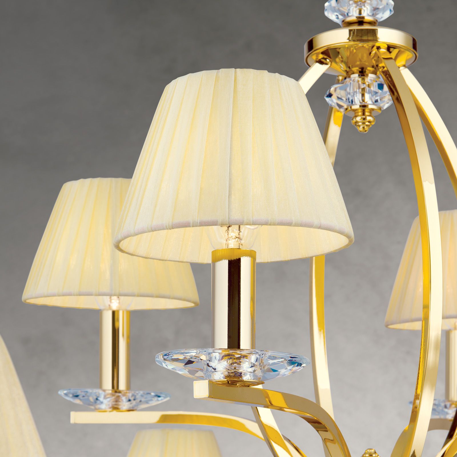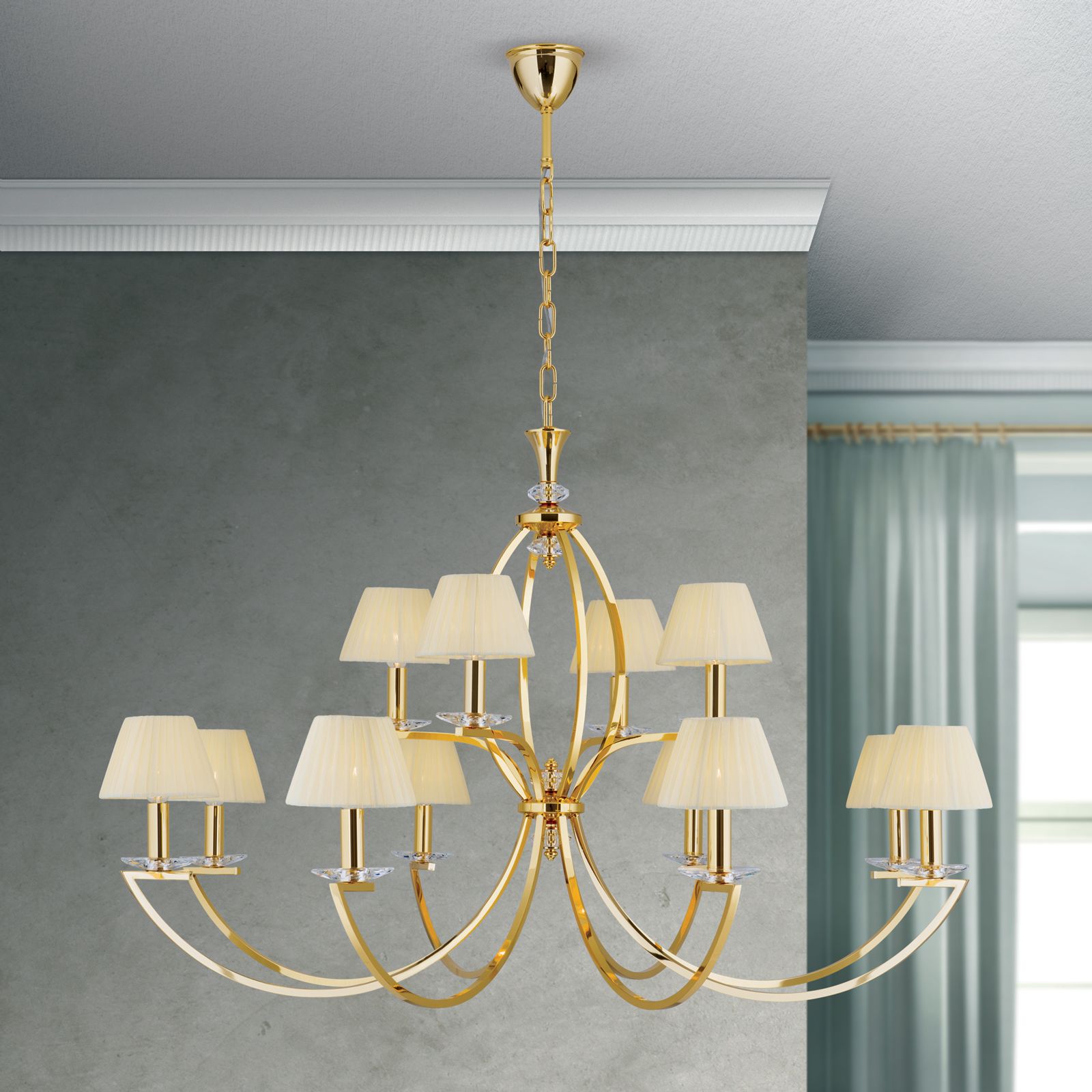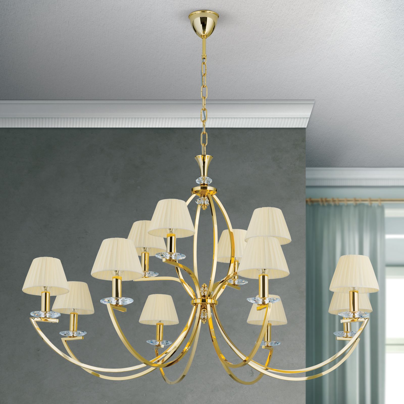 The robust solid brass frame with its nickel and 24 carat gold-plated surface finishes are true to the light's noble character. Colour-coordinated white or champagne-coloured textile shades culminate on twelve E14 sockets providing particularly pleasant light moments. Austrian handicraft underlines the high quality level.