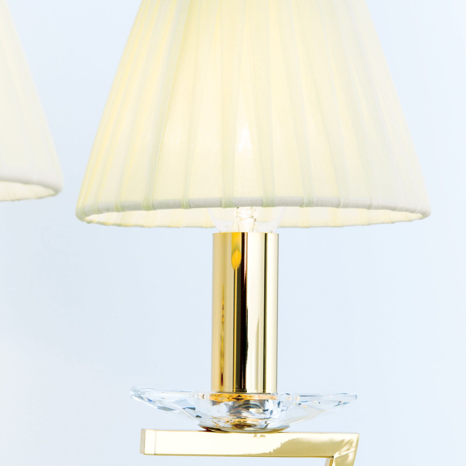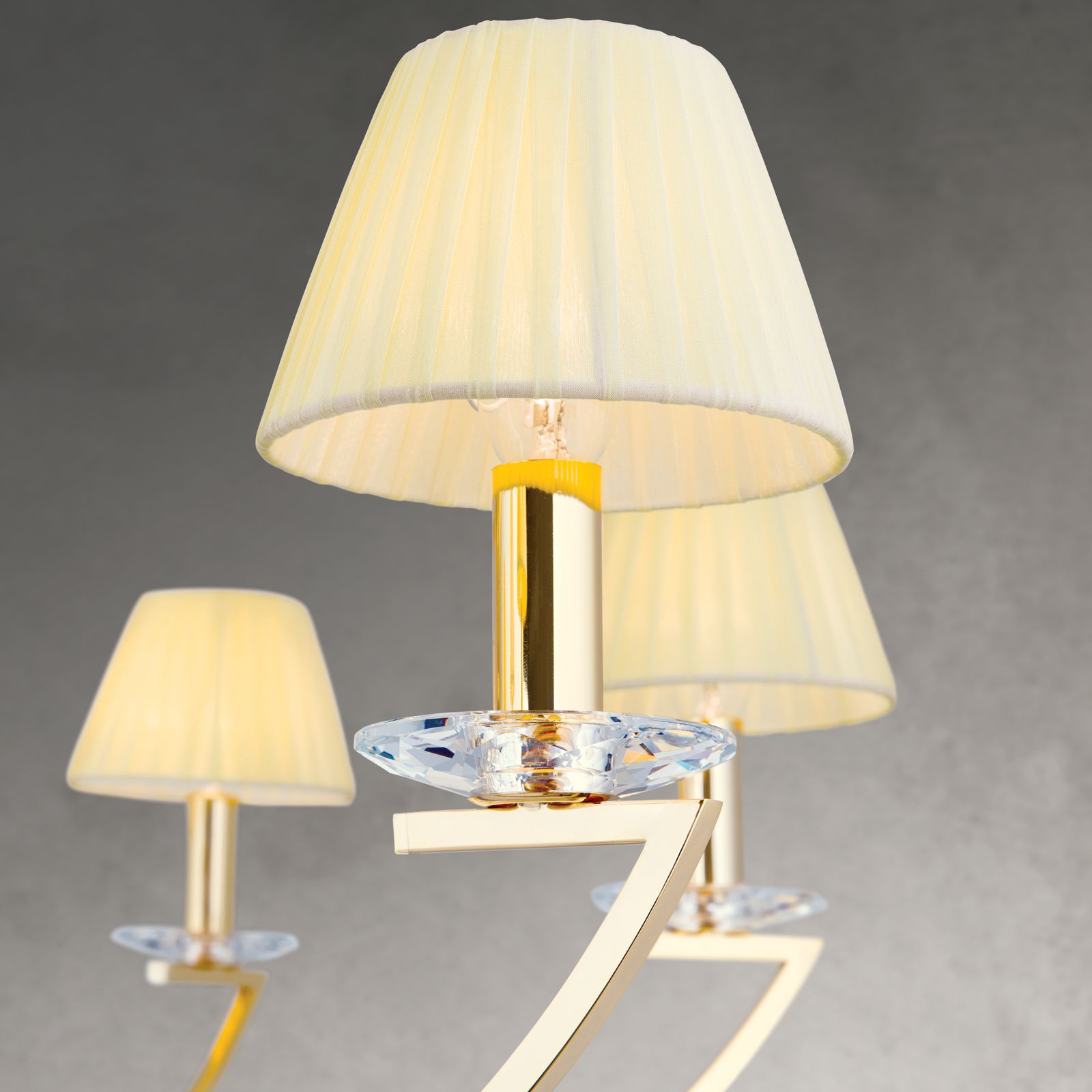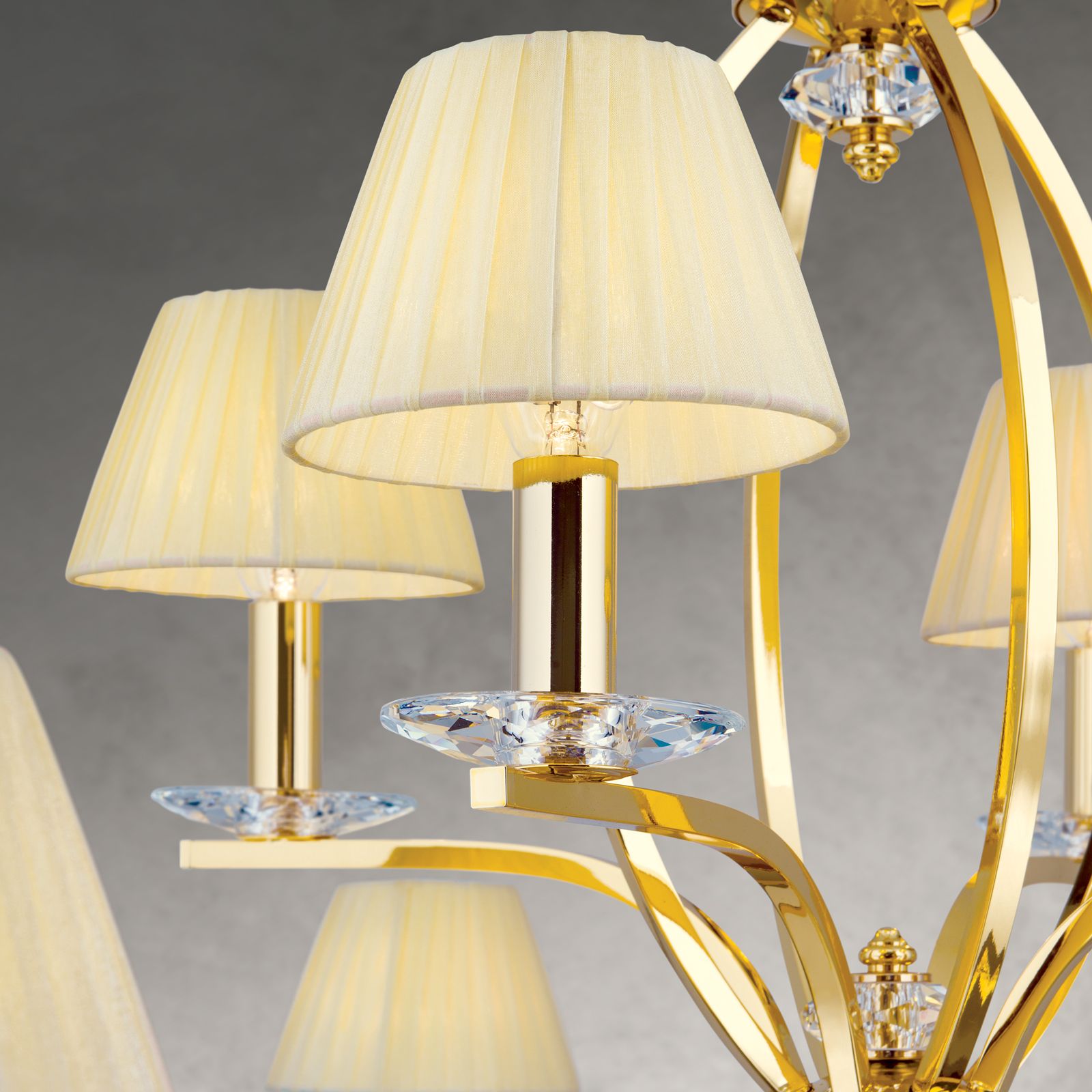 The robust solid brass frame with its nickel and 24 carat gold-plated surface finishes are true to the light's noble character. Colour-coordinated white or champagne-coloured textile shades culminate on twelve E14 sockets providing particularly pleasant light moments. Austrian handicraft underlines the high quality level.