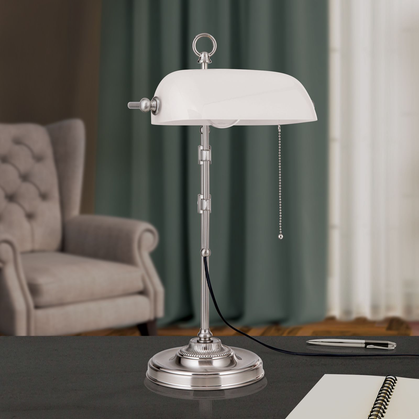 Bankers lamp HARVARD, satin with opal white glass shade, 53cm