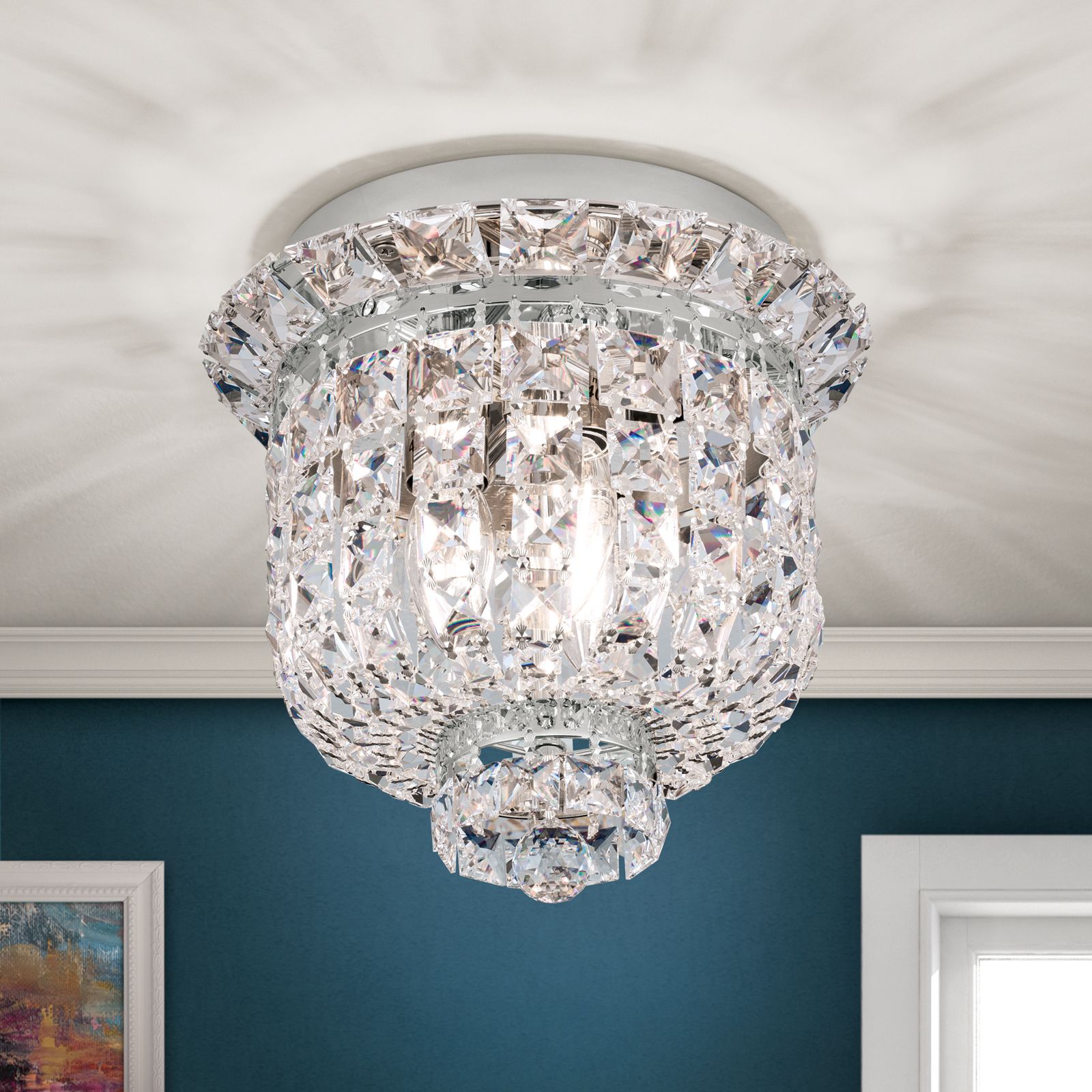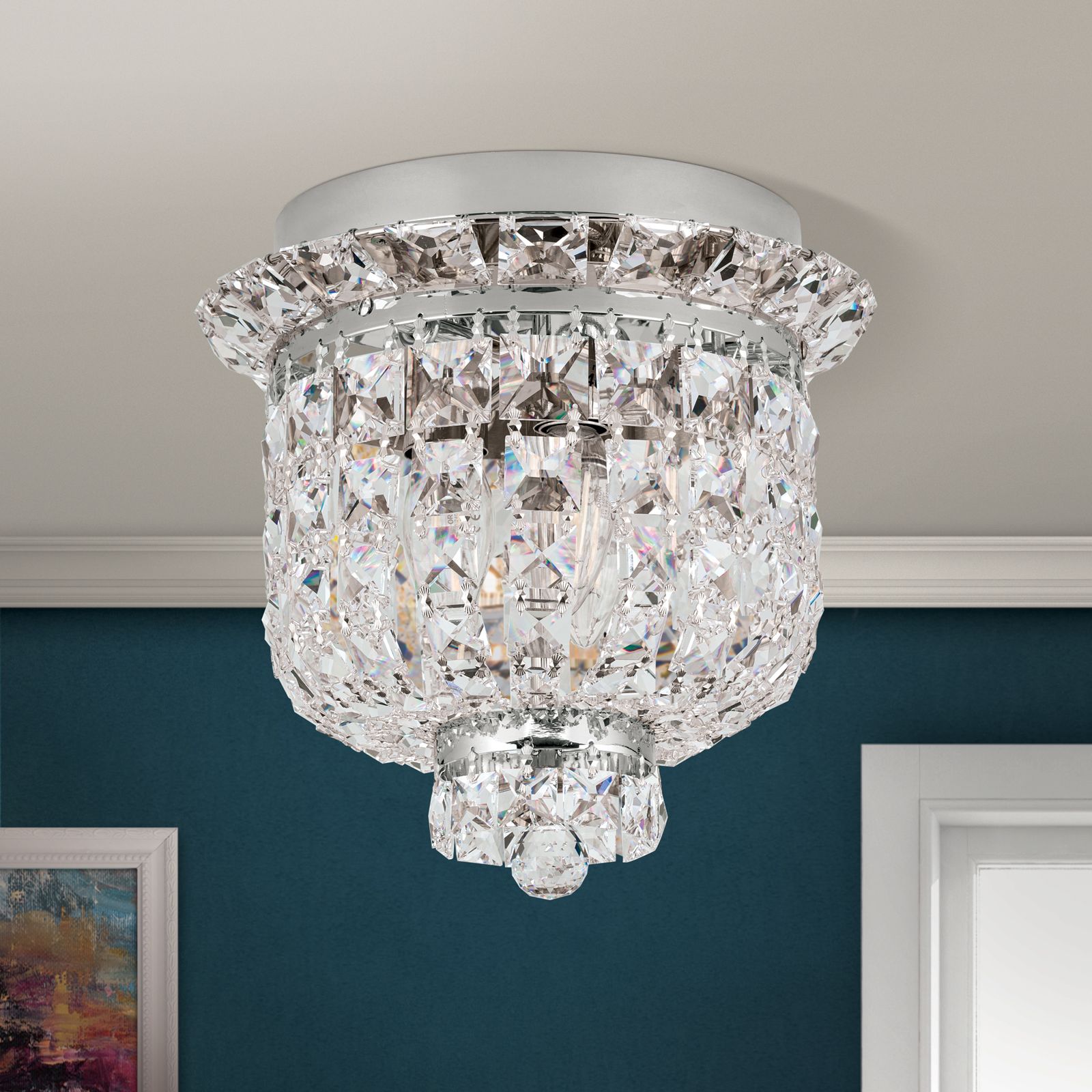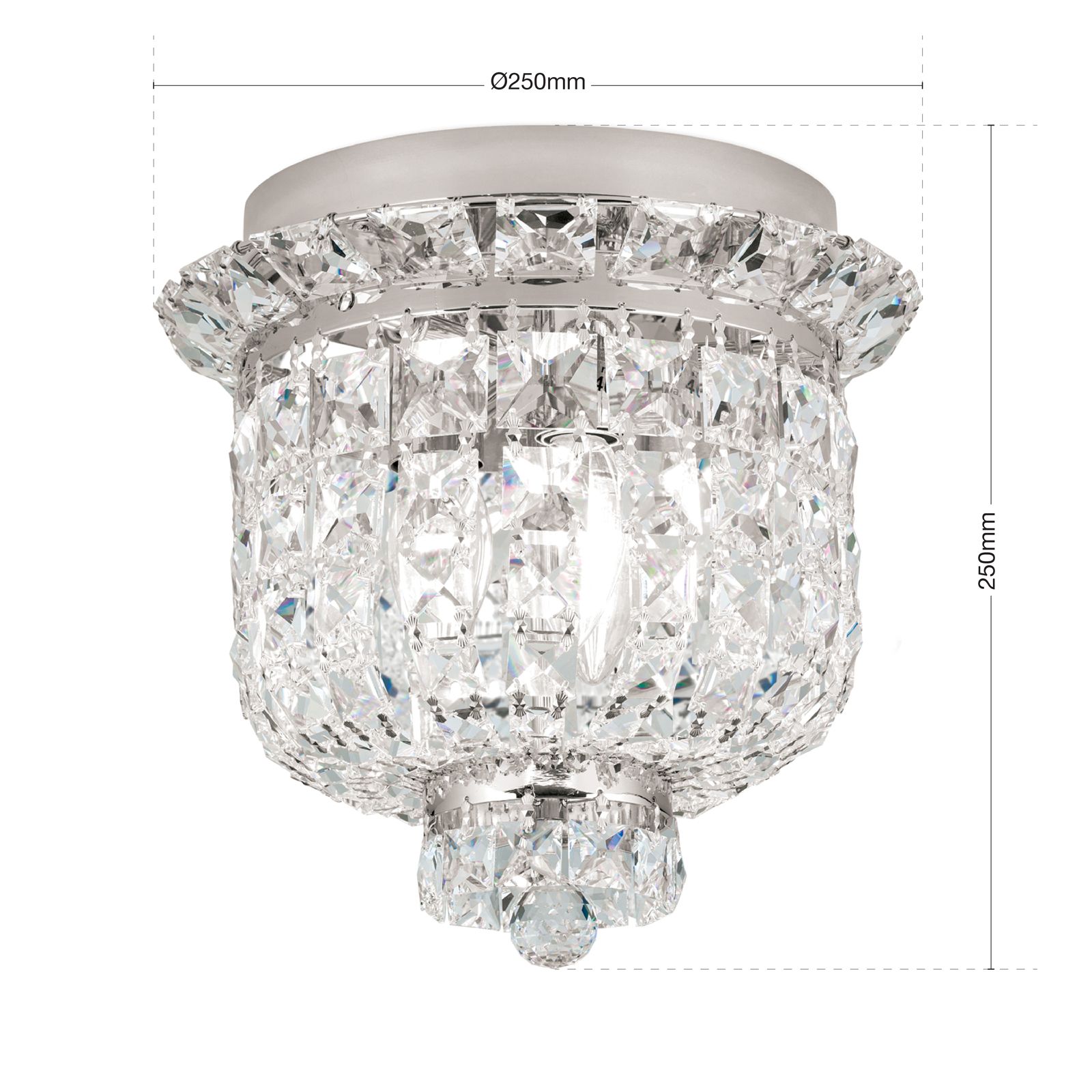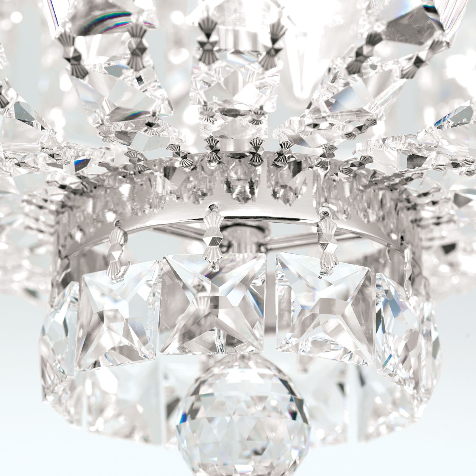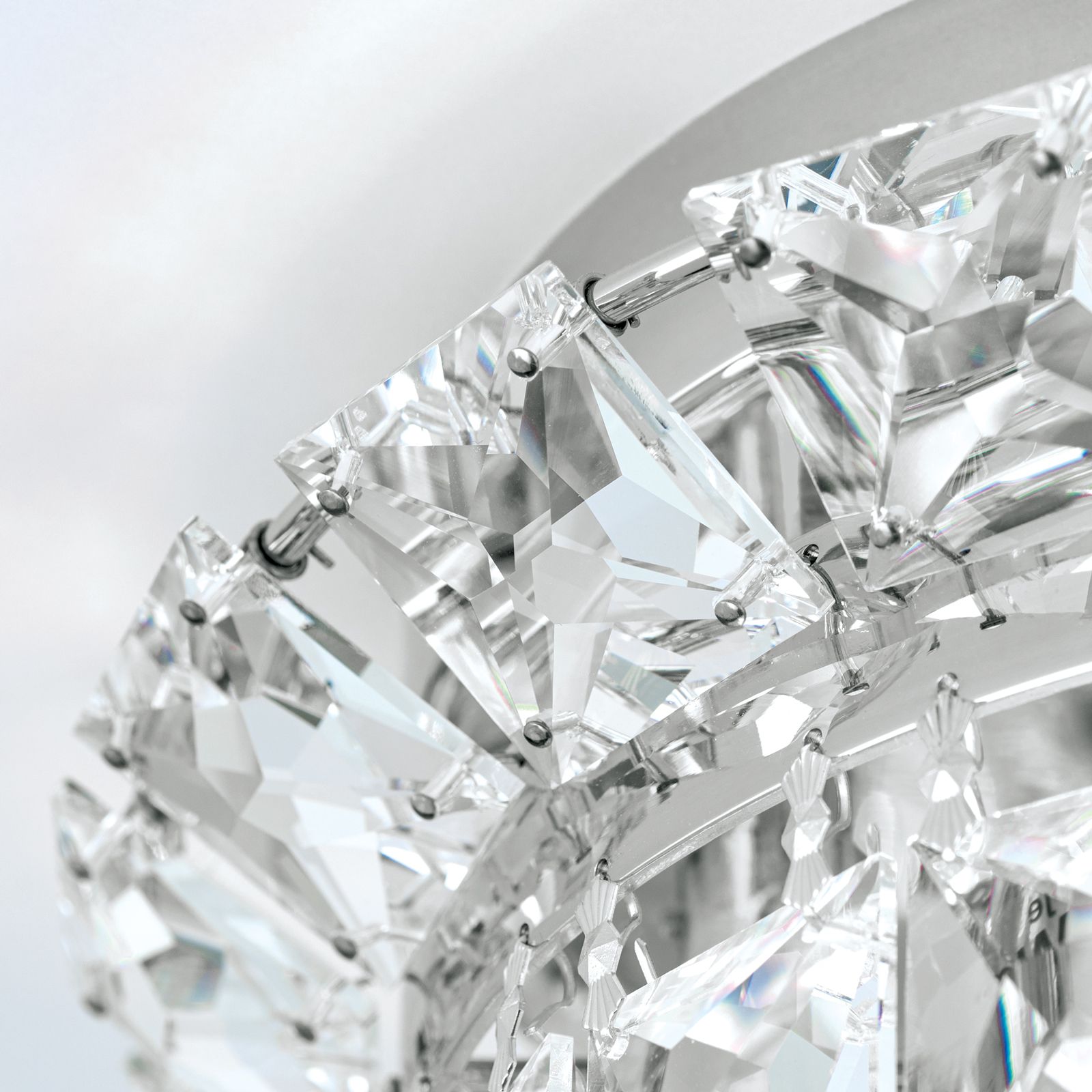 The frame is made of solid brass with chrome-plated finish thus harmonising wonderfully with the many STRASS® Swarovski® Crystal crystals. They form a kind of chalice that is complemented by two shiny rings intensifying the crystals' sparkle. The finishing touch is a round crystal ball at the bottom of the light. Equipped with 3 E14 sockets, it can be fitted with 40 watts maximum and its brightness adjusted by means of a dimmer.
