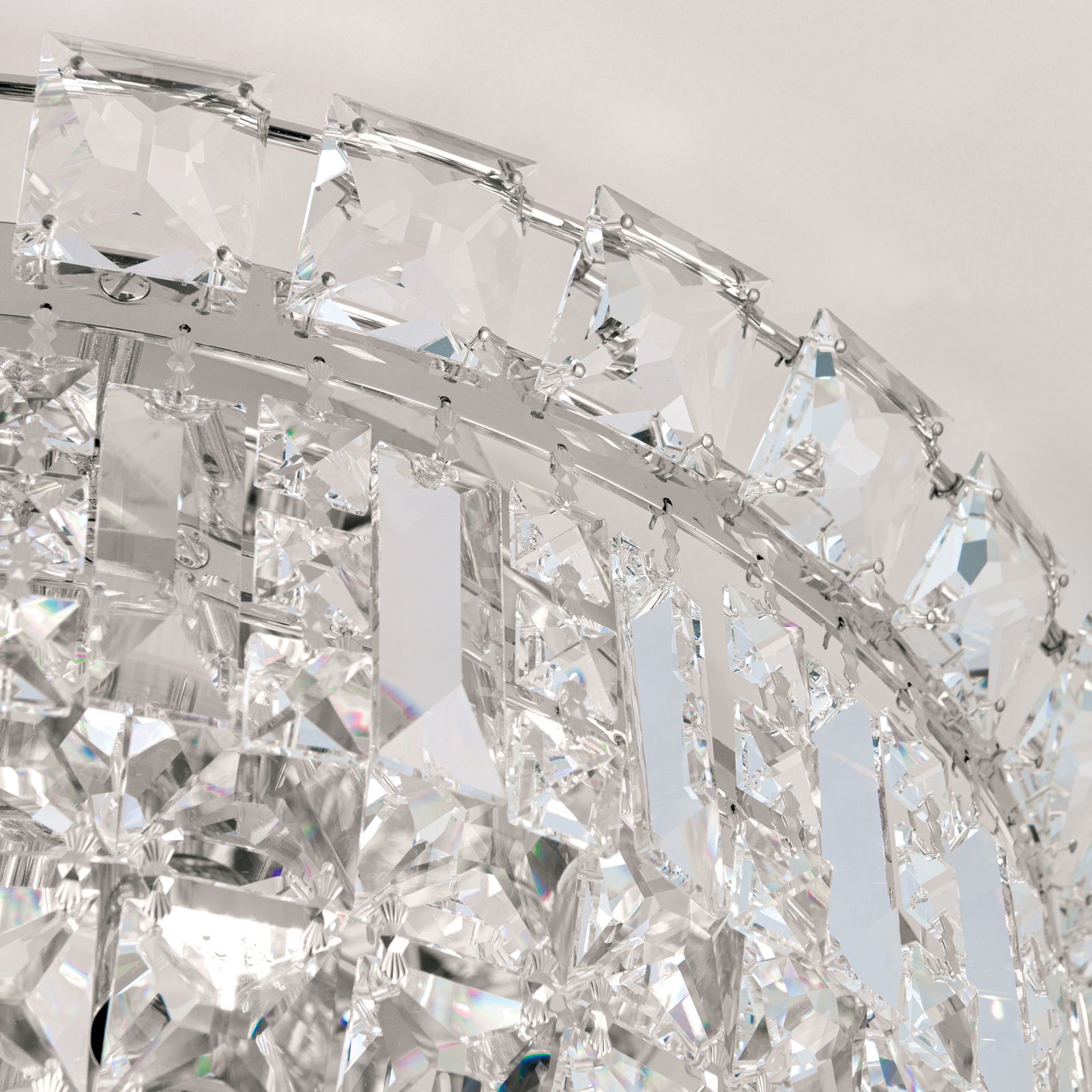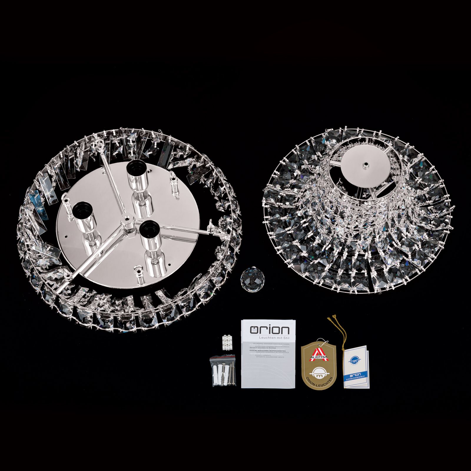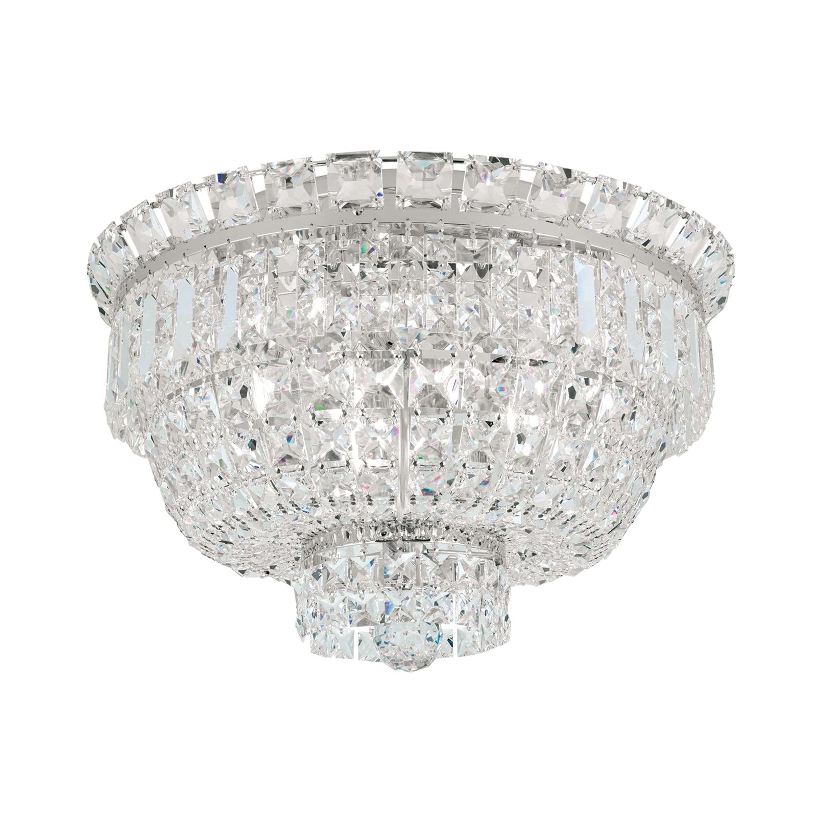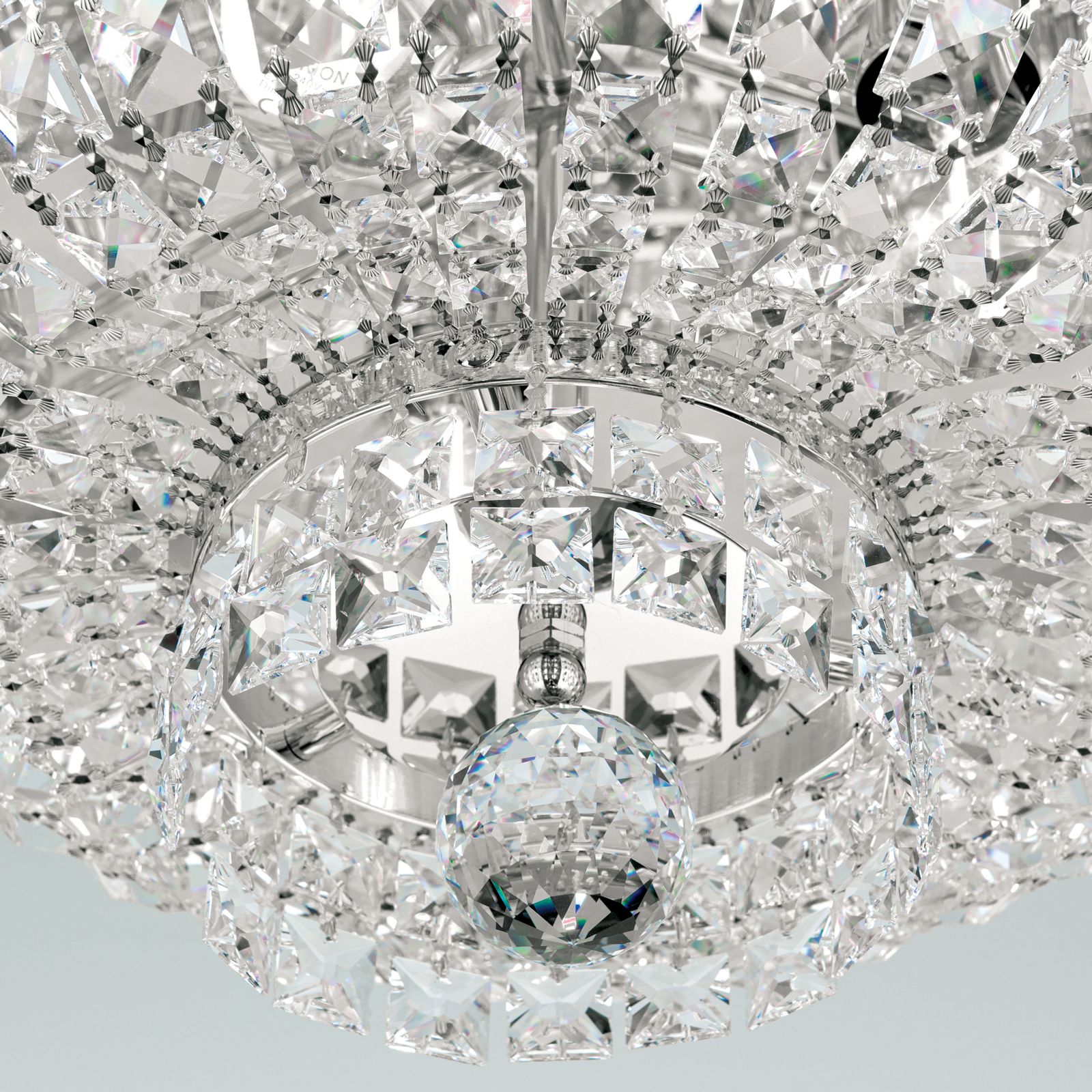 Countless prisms and square stones made of STRASS® Swarovski® Crystal crystals converge towards the centre and form a smaller crystal ring centrally carrying a shapely crystal ball. The frame is made of chromed solid brass providing additional sparkle with its shiny finish. The bulbs in 3 E27 sockets are completely hidden behind crystal chains and can be equipped with a60 watts maximum.