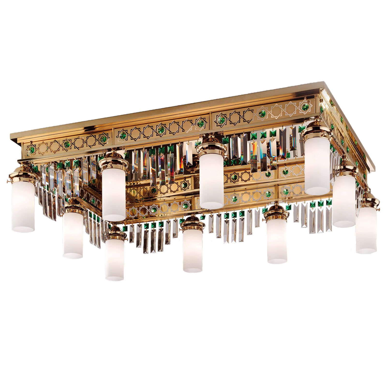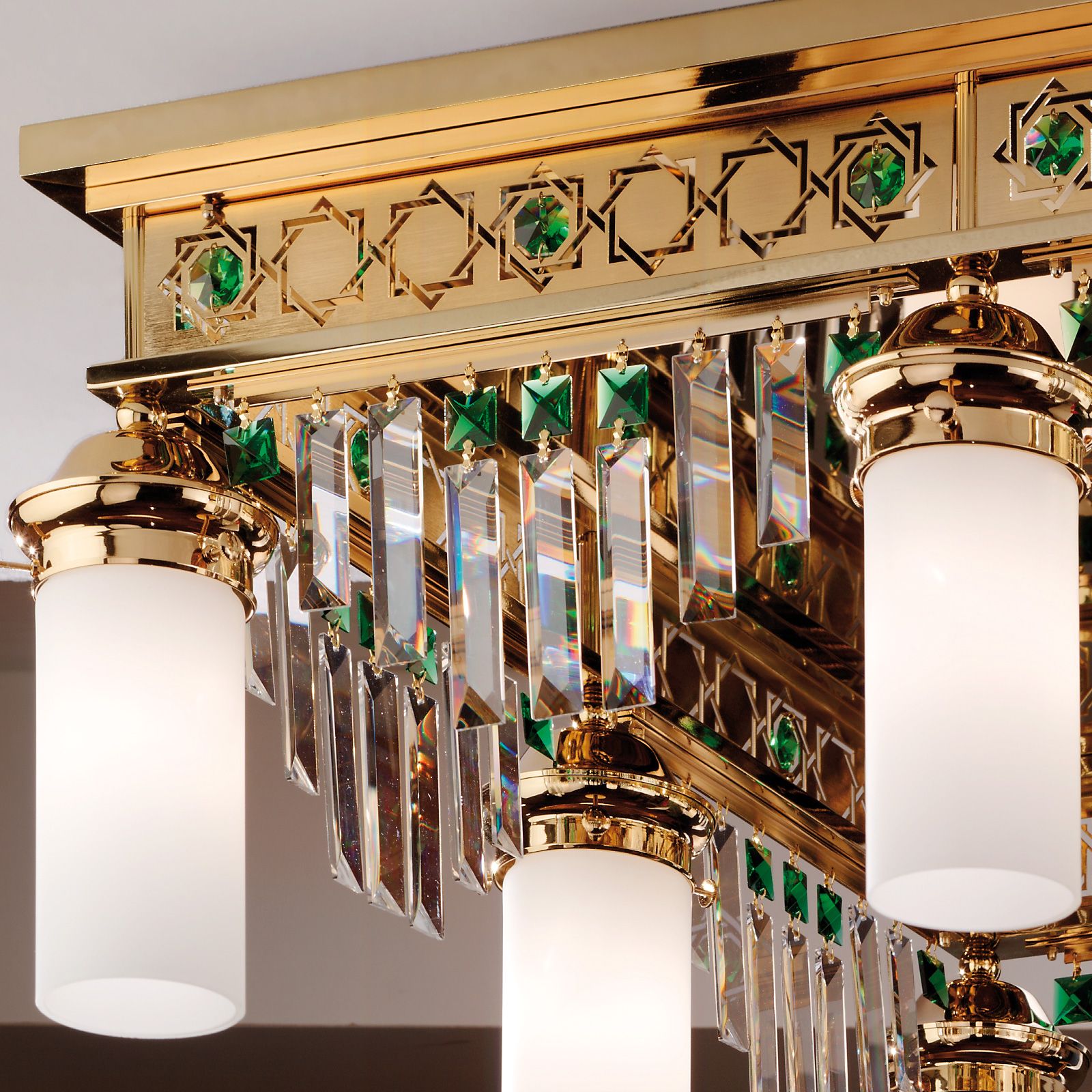 Ceiling chandelier ORIONtal, 10-flames, gold, with green crystal prisms