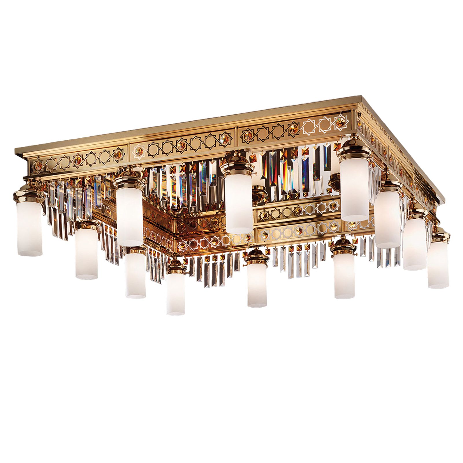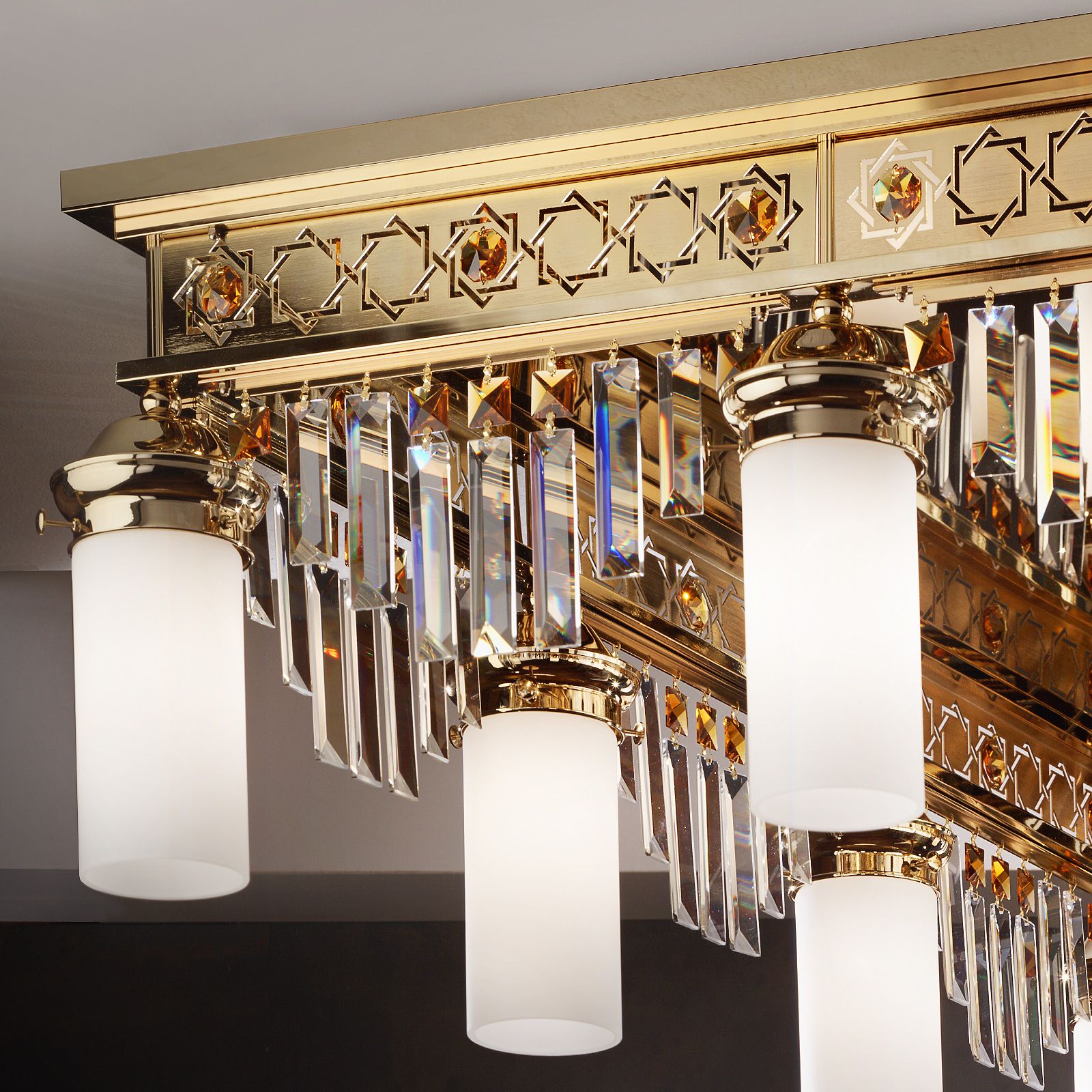 Ceiling chandelier ORIONtal, 12-flames, gold, with topaz-coloured crystal prisms