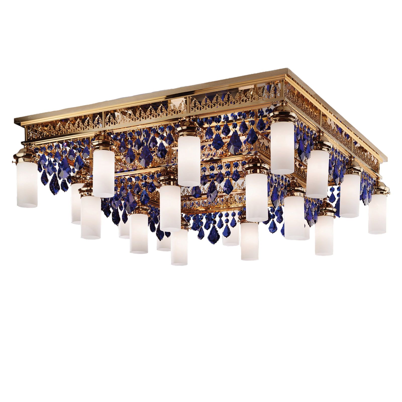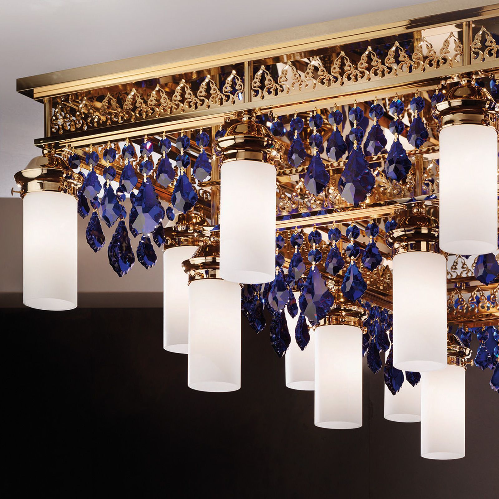 Ceiling chandelier ORIONtal, 20-flames, gold, with blue crystal pendants