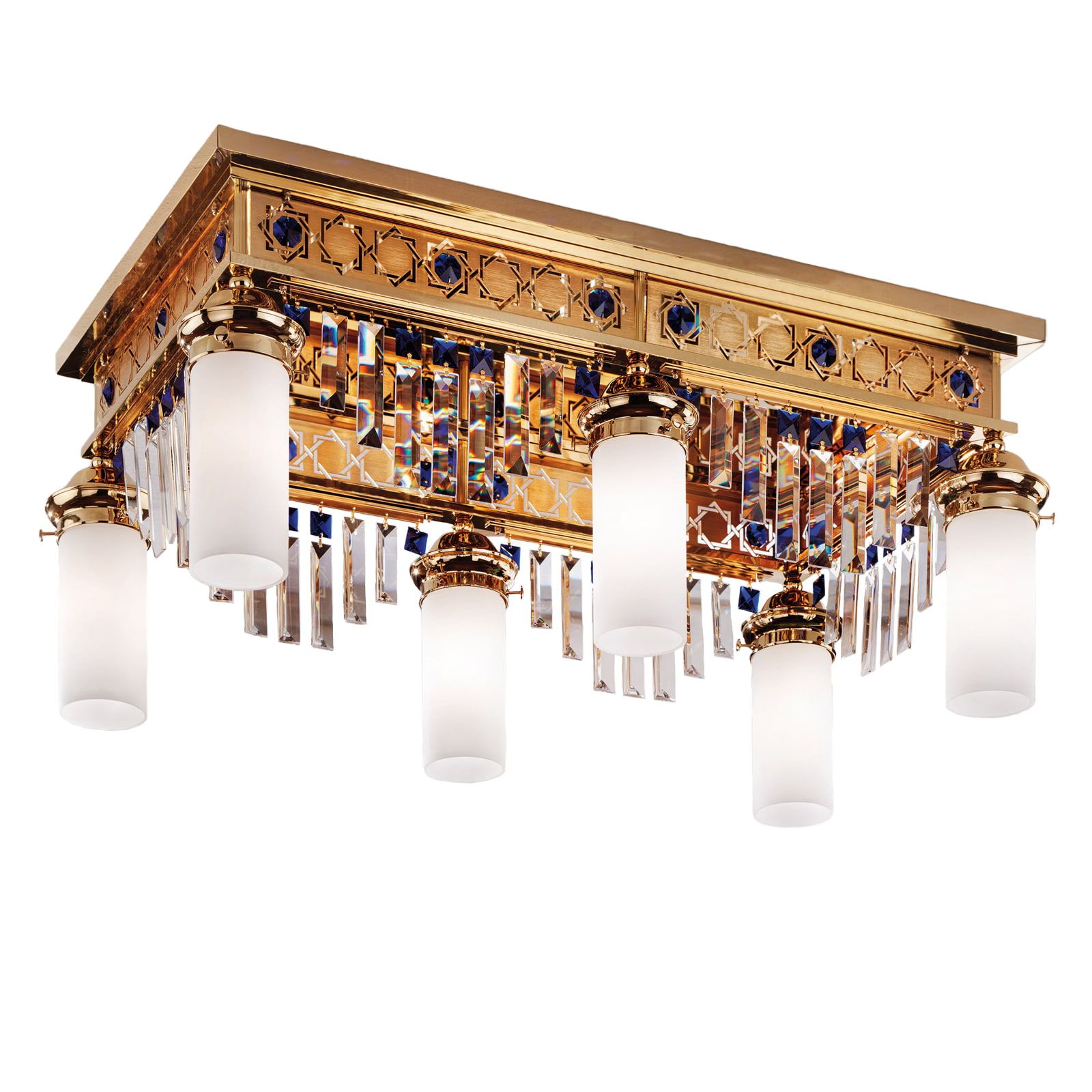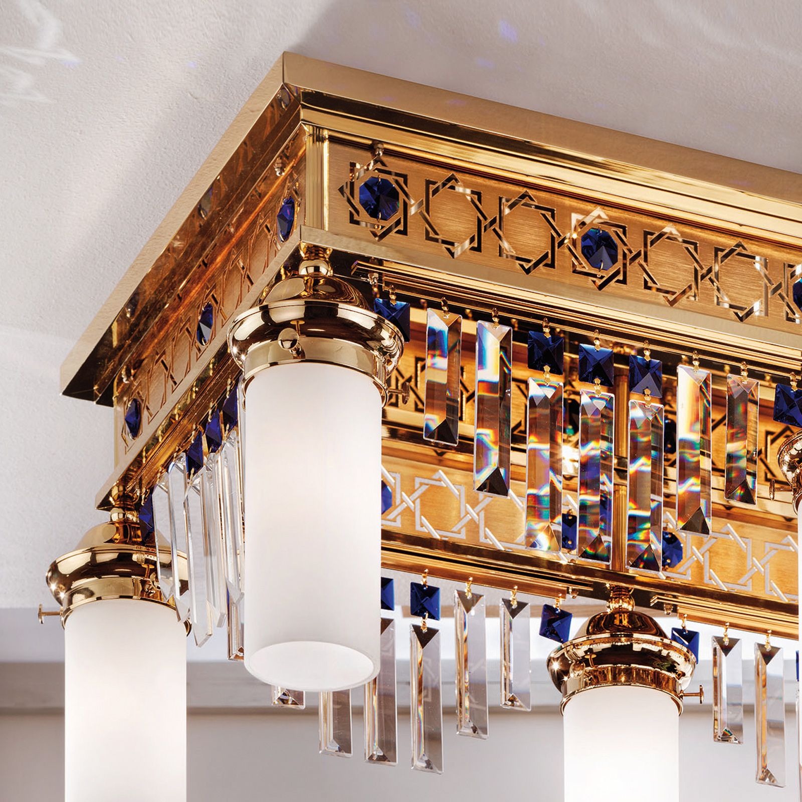Ceiling chandelier ORIONtal, 6-flames, gold, with blue crystal prisms