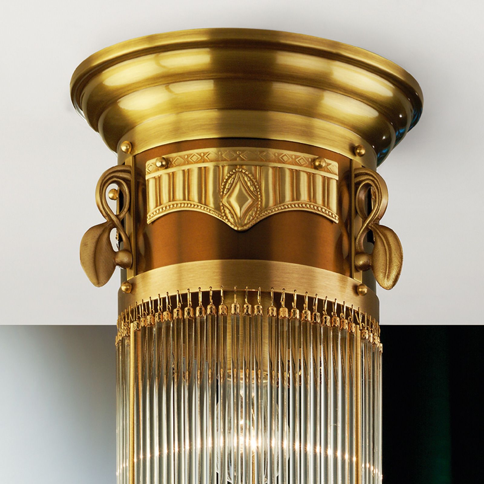 The ceiling light from the ADELE series embodies the glamour and glory of Vienna's Fin de Siècle. The transition to the Industrial Age's rigor was accompanied by a youthful, optimistic joy in beauty. The fusion of these two antagonistiv directions is evident in the high-quality craftsmanship. Ceiling light ADELE, conveys this spirit by featuring strict formal elements as well as a tendency towards exuberance. The glass rod suspension's cylindrical shape with linear ends is accompanied by antique decorative elements. One can imagine this light being installed in bedrooms, or above front desks in hotels or offices.