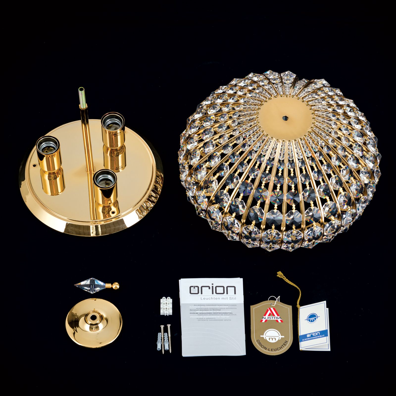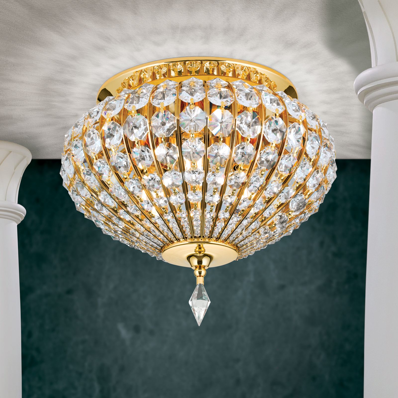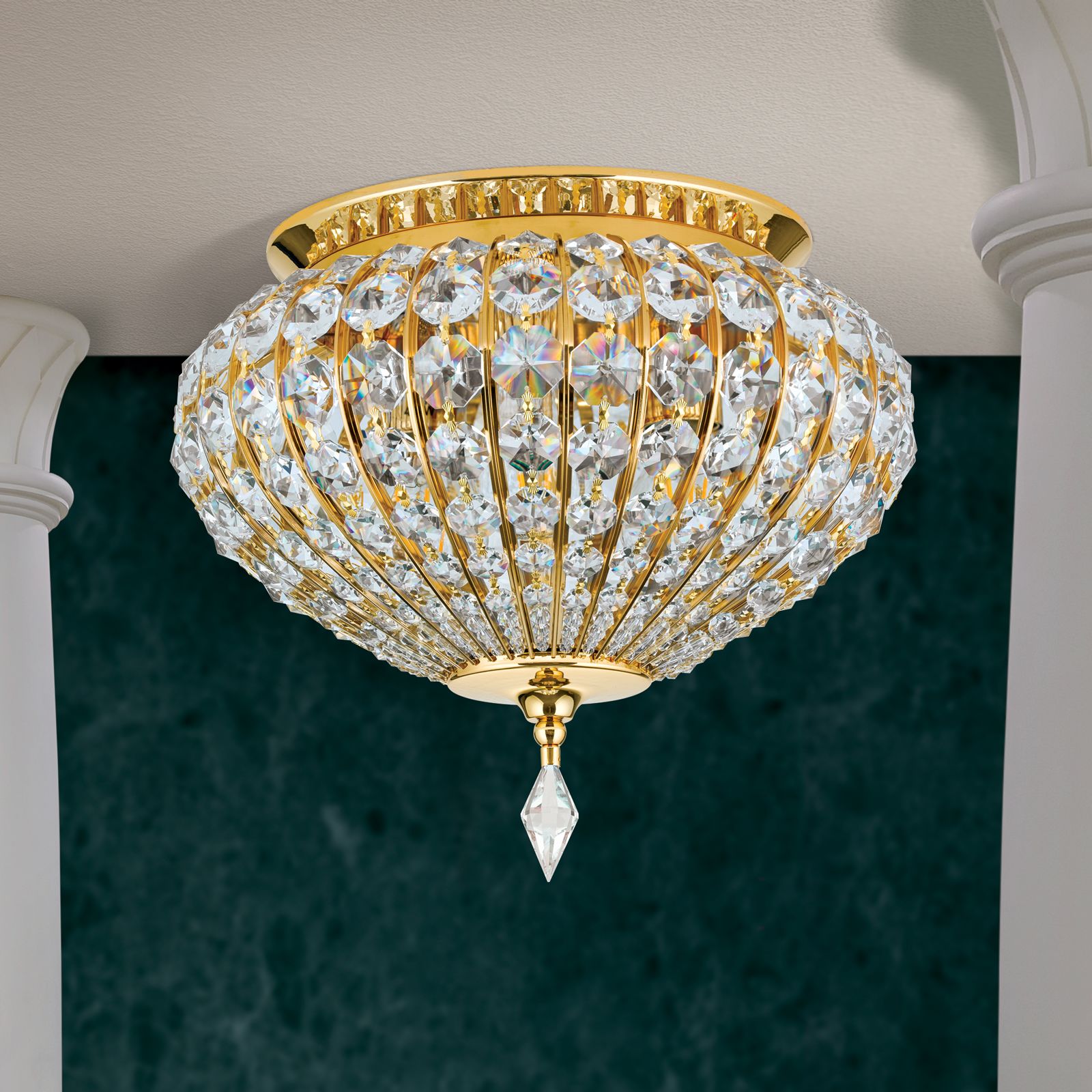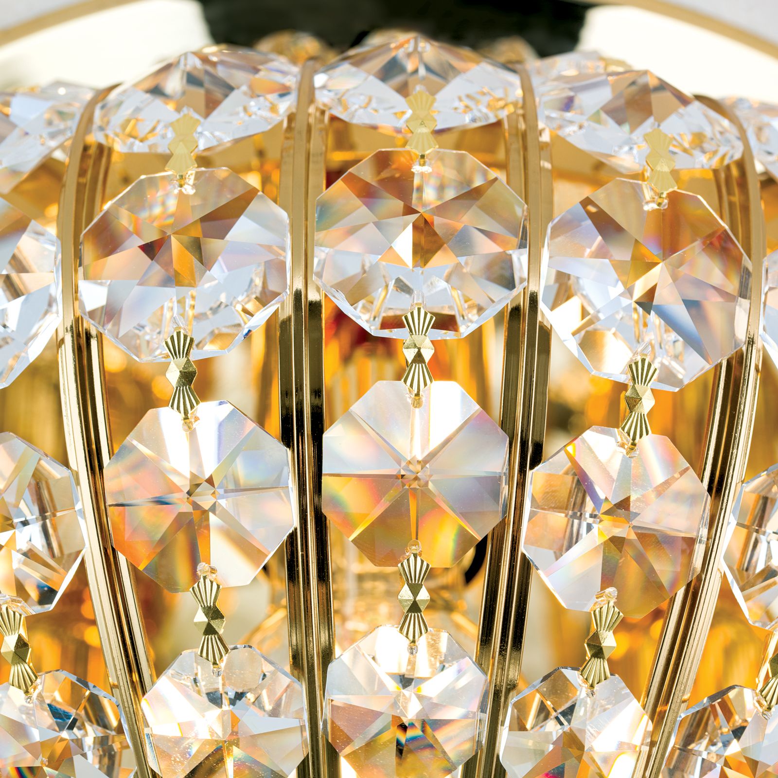Noble and classic in oriental style, ceiling light ORIENTAL showcases its high-quality materials. SCHÖLER CRYSTAL® octagons and 24 carat gold-plated solid brass parts harmonise perfectly and form a dome reminiscent of magnificent oriental buildings. The furnishing options it offers are manifold, so it can be placed in any classical interior where it will definitely be the visual climax.