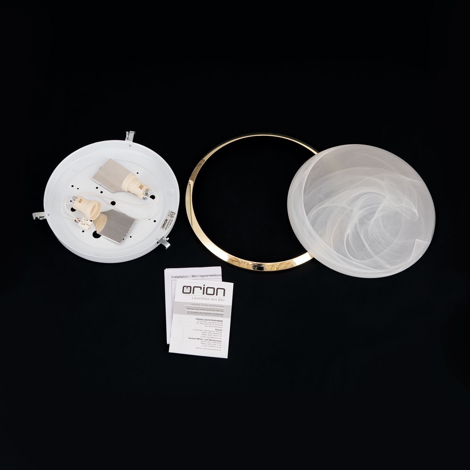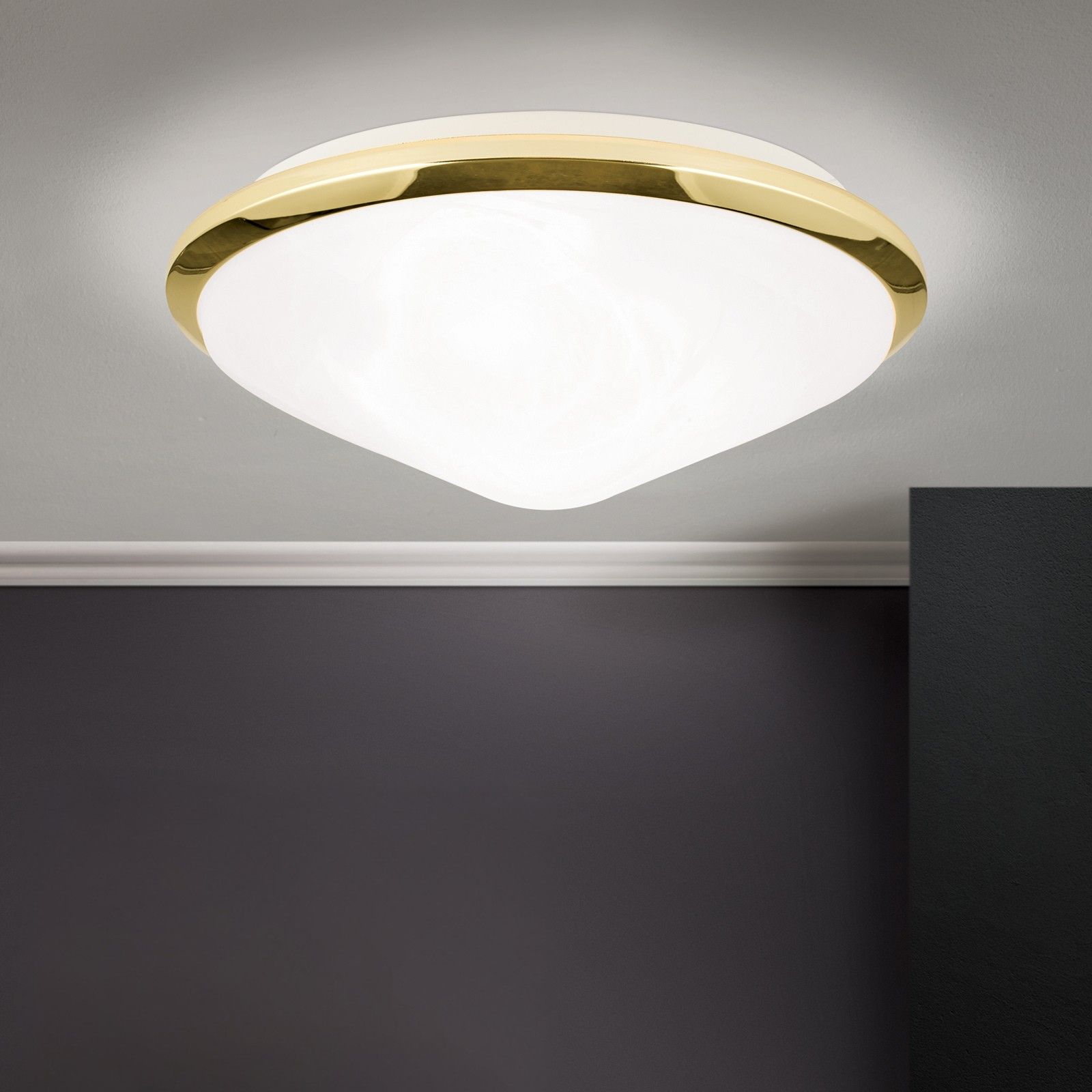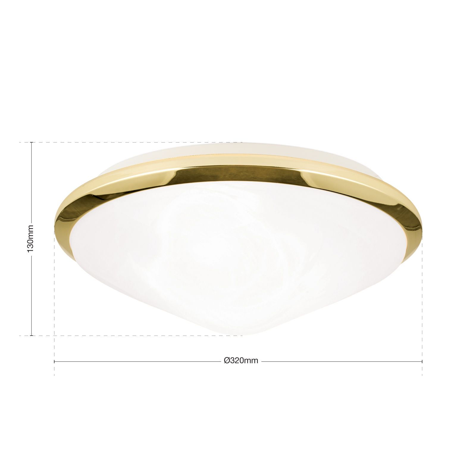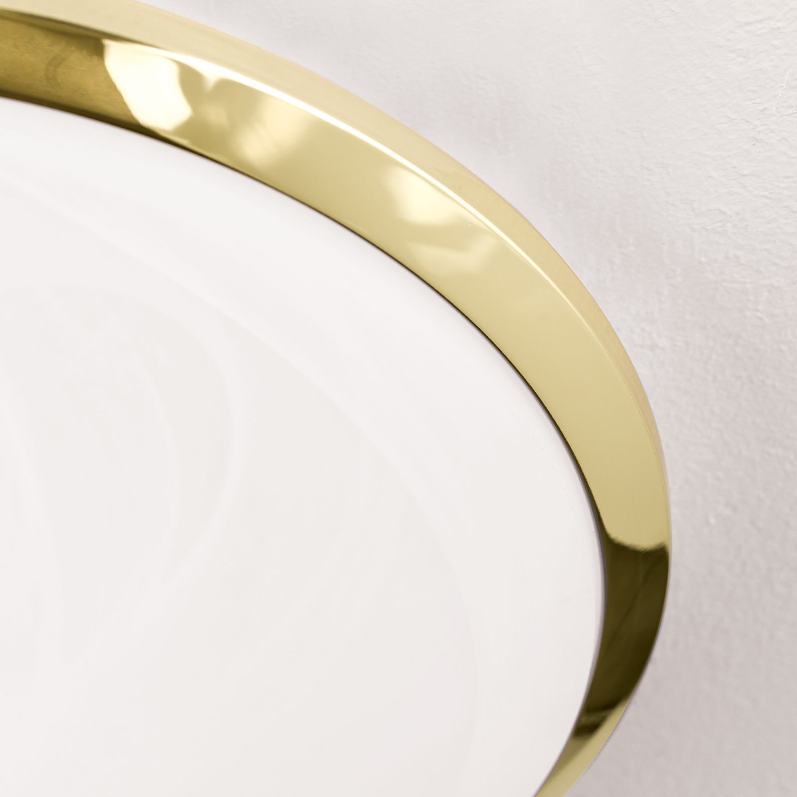 Ceiling light RIMA is a modern understated light for many uses. As basic illumination, it is perfect in living, bedrooms or dining rooms and contributes to a cosy atmosphere. The opal matt semi-circular shade made of alabaster glass is surrounded by a brass matt metal ring providing calm, atmospheric light. Its dimmability allows for easily regulating brightness adapting light intensity to each situation. Equipped with two E27 sockets, it can be fitted with 60 watts maximum. Operated with LED bulbs, it is a discreet and economical light source.