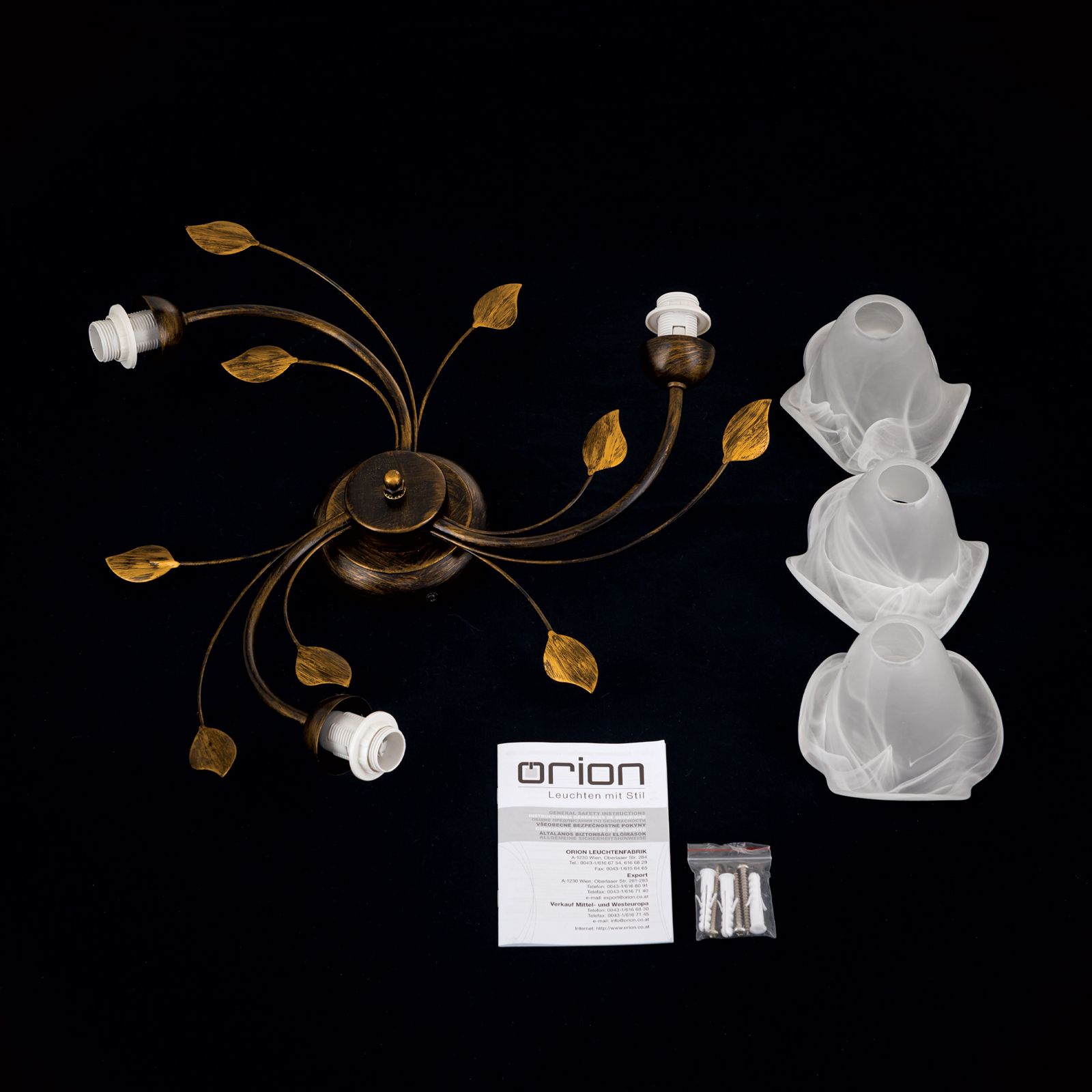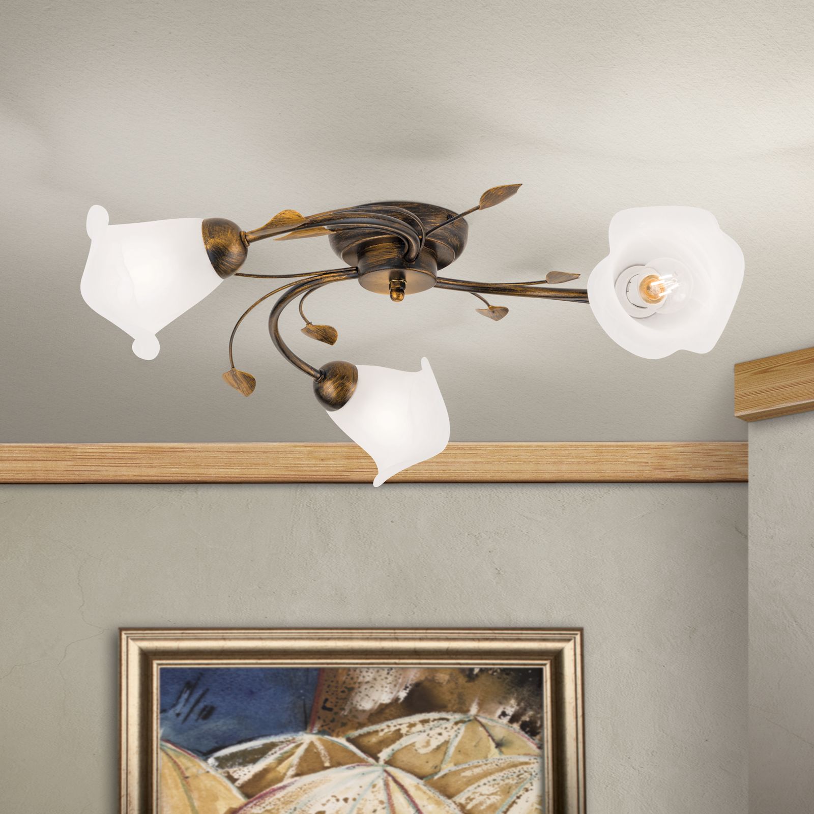 Stylishly curved, the SISI ceiling light presents itself in Florentine style and inspires lovers of Italian design. It is reminiscent of a whirl consisting of enchanting calyxes and shapely leaves. The opal matt glass shades made of alabaster glass ensure a pleasant light distribution in the room, which has a very pleasant effect on the observer. The frame is available in ivory-gold and antique. Its 3 E14 sockets can be operated with a maximum of 40 watts per socket.