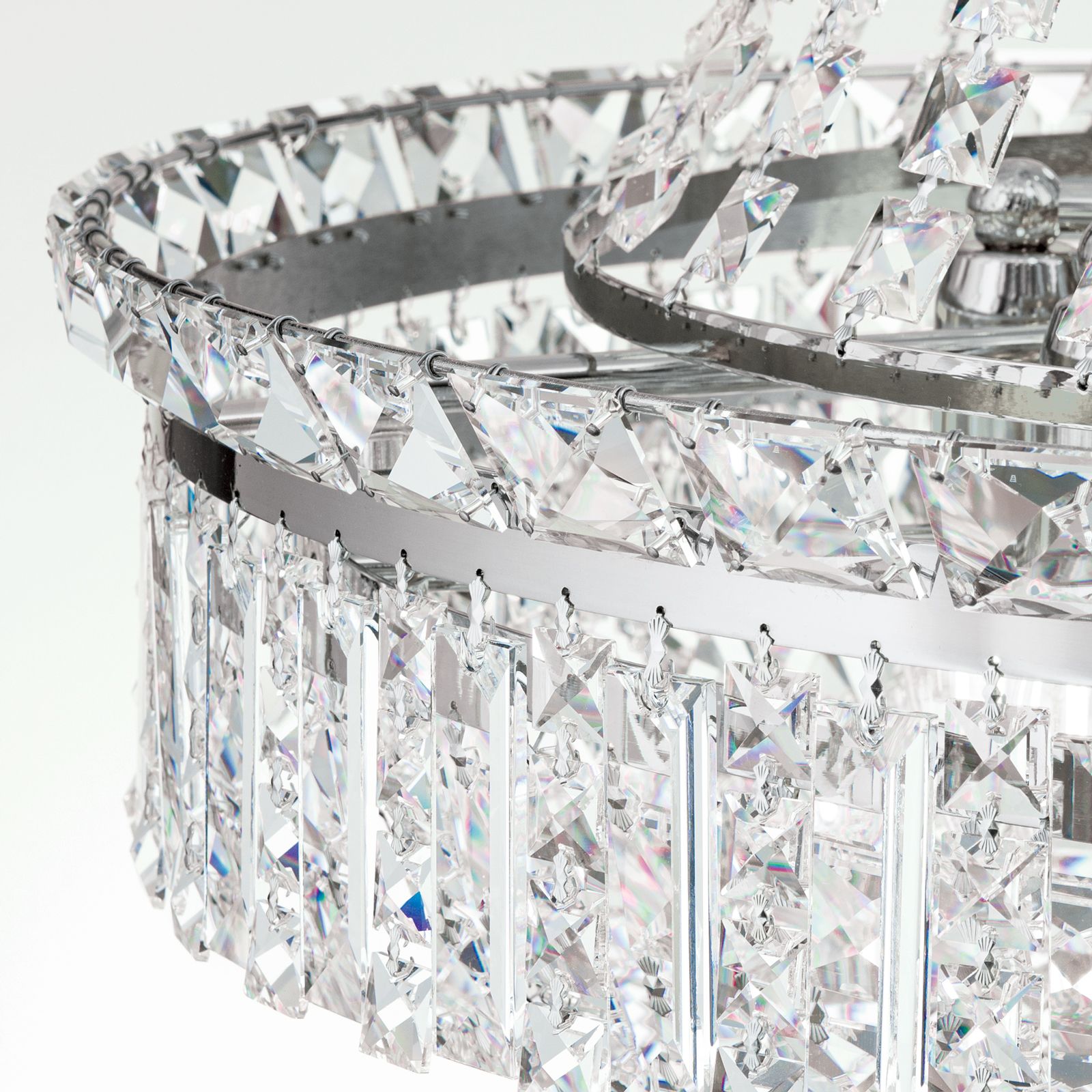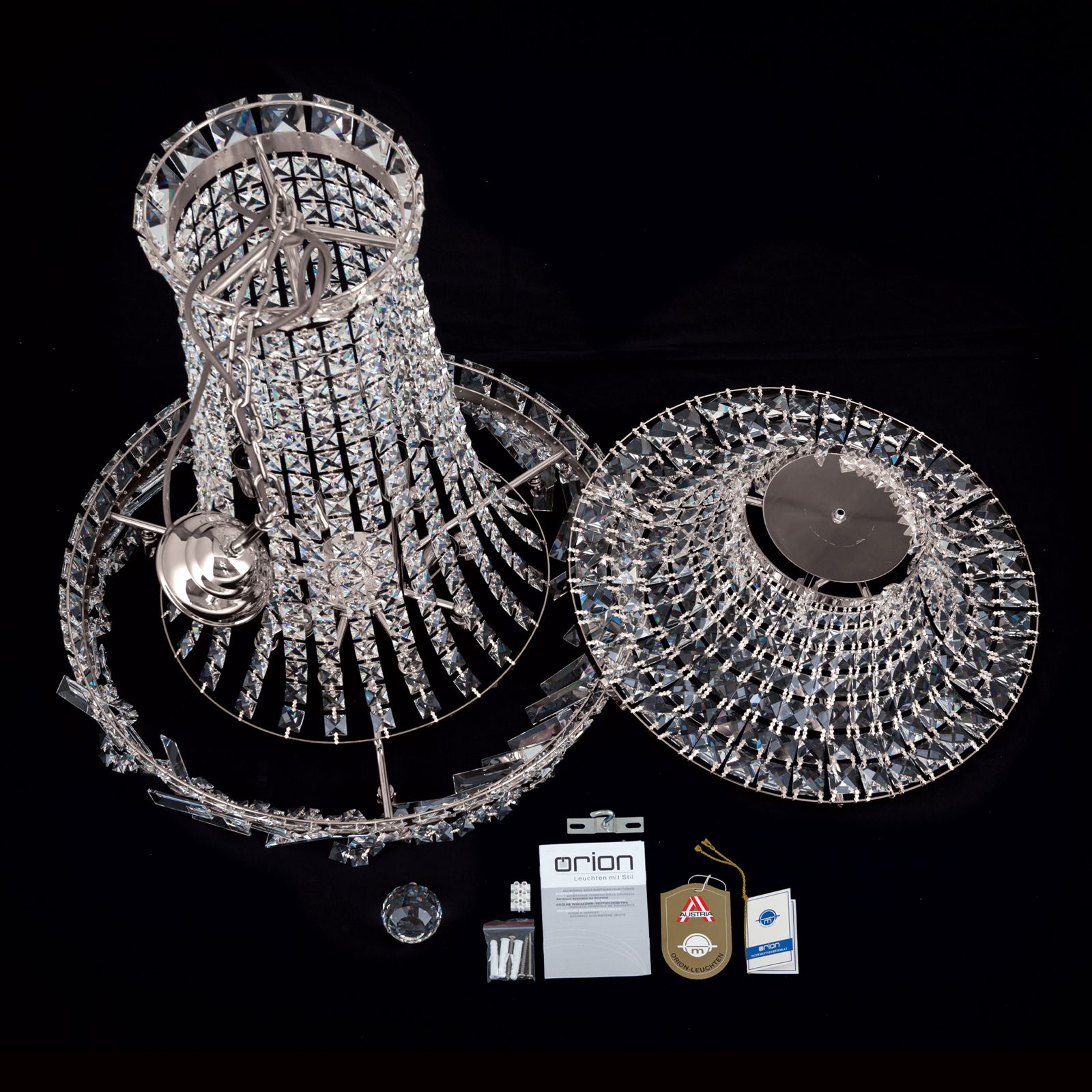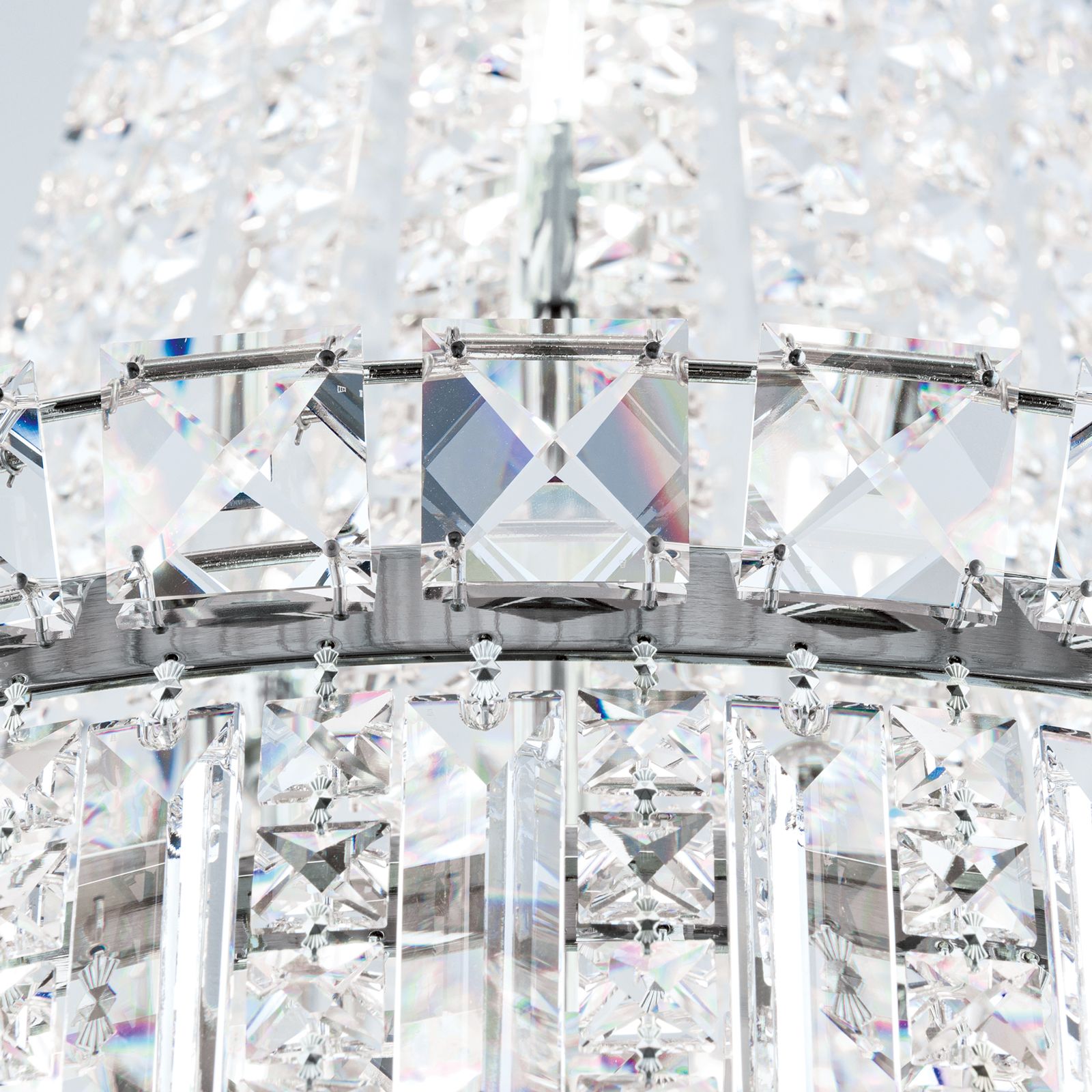 The combination of STRASS® Swarovski® crystal chandelier crystals and chrome-plated solid brass parts harmonises perfectly with light incidence creating spectacular reflections in any room. The chandelier's crystal comes in prisms and square stone cuts as well as a large crystal ball - the chandelier's grand finale. Equipped with 15 E14 sockets, it can be fitted with 40 watts maximum each.
