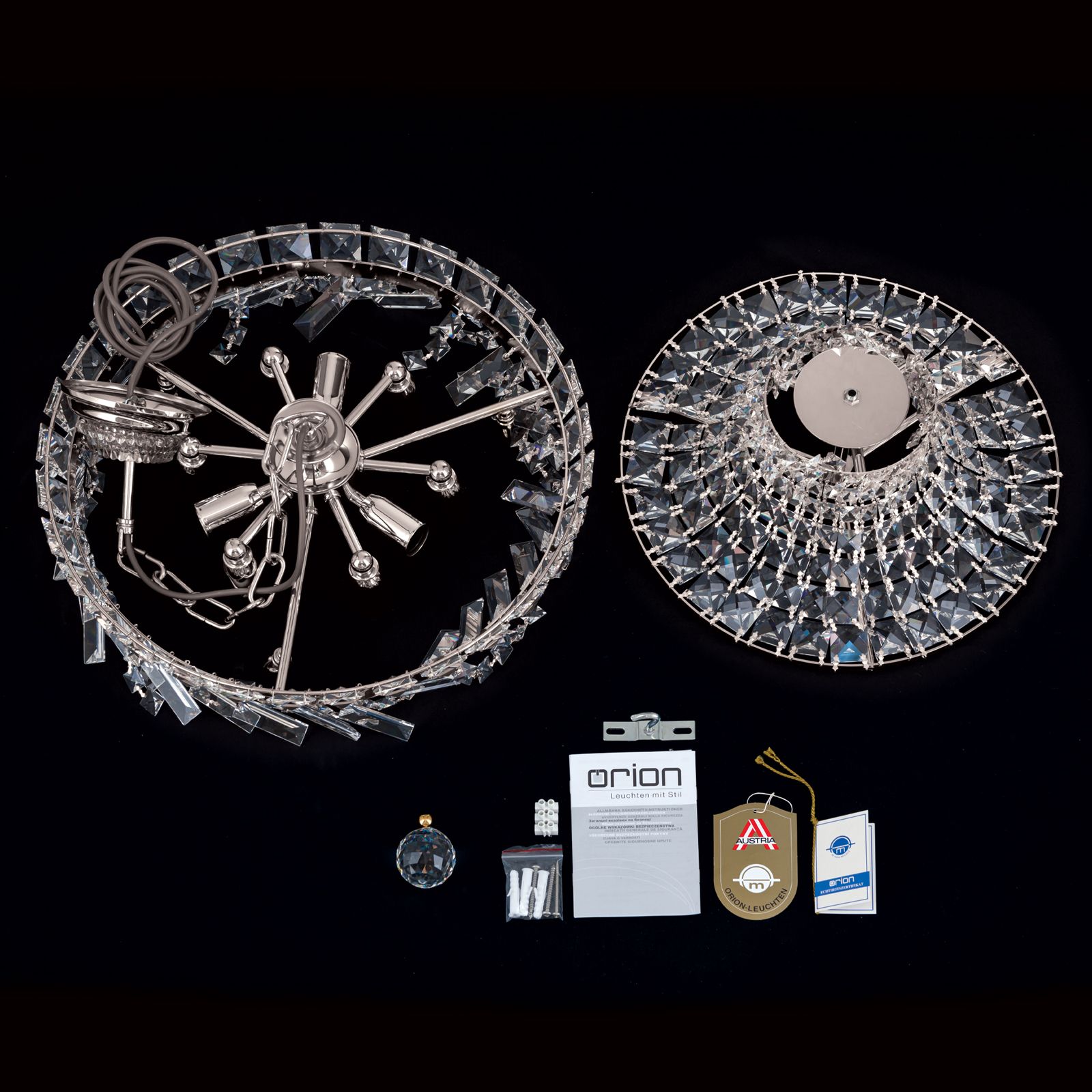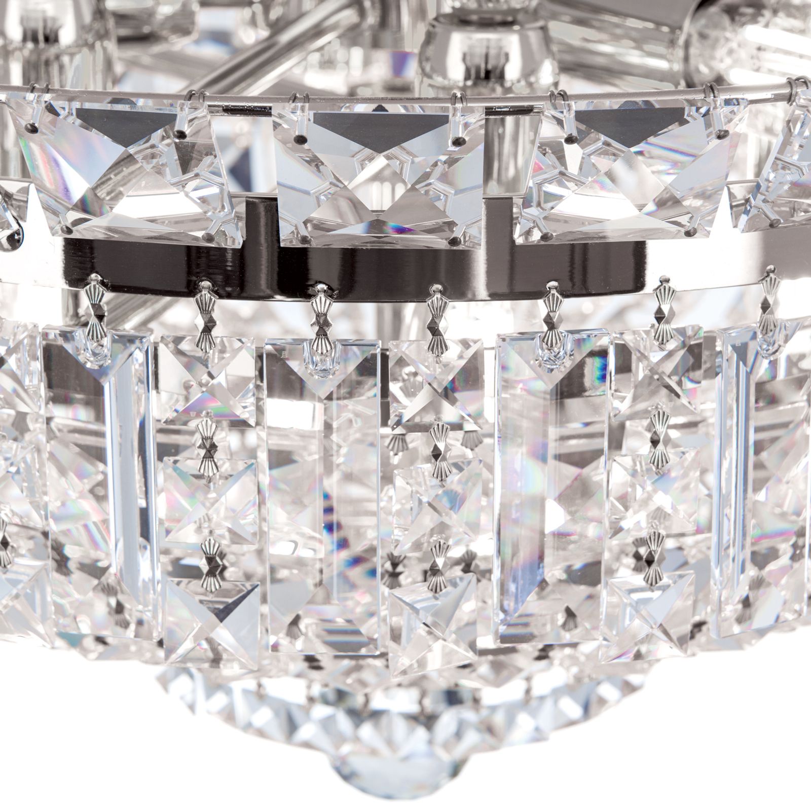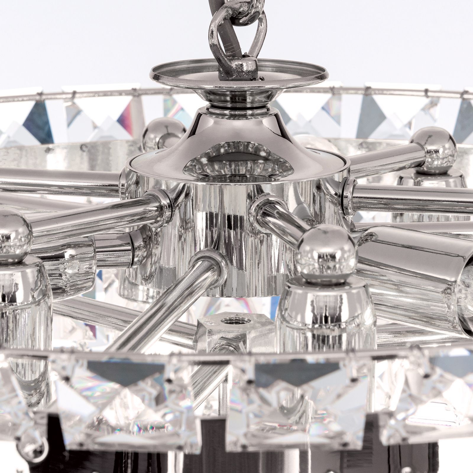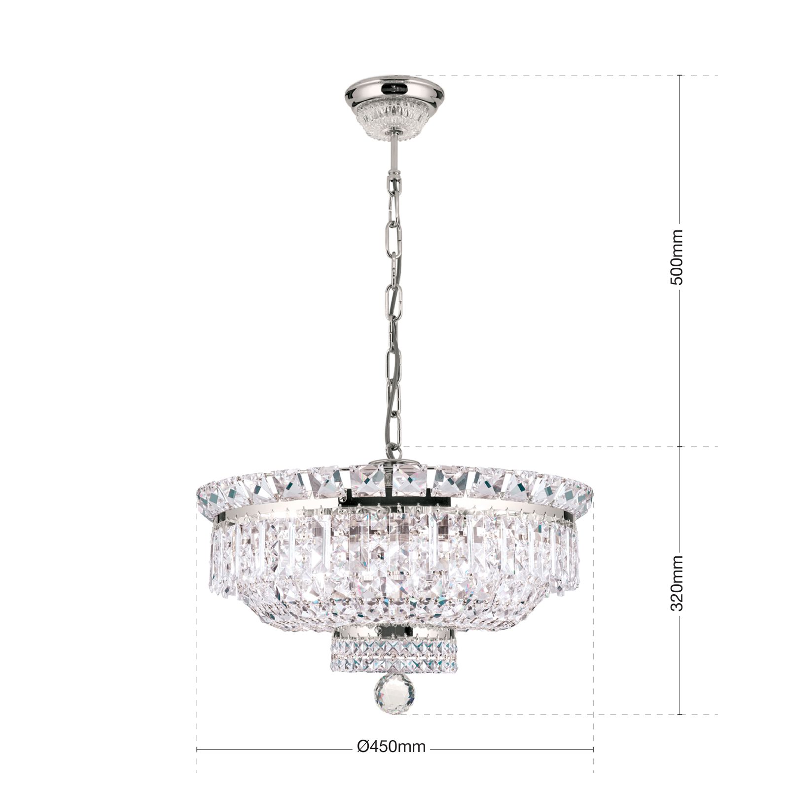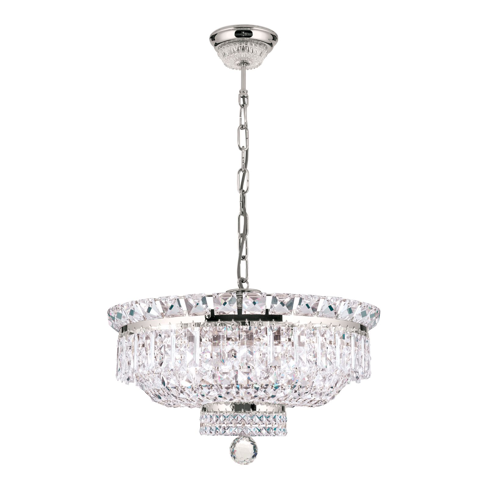 Crystal prisms and square stones adorn the shiny frame in different tiers creating beautiful reflections through light incidence. The chrome-plated finish intensifies the sparkle rounding off its appearance perfectly. The impressive crystal chandelier is topped off with a large crystal ball adding the proverbial je-ne-sais-quoi. Depending on mood, the light can be brightness adjusted with a dimmer to create the perfect ambiance. Concealed behind many crystal chains are 9 E14 sockets, that can be fitted with 40 watts maximum each.