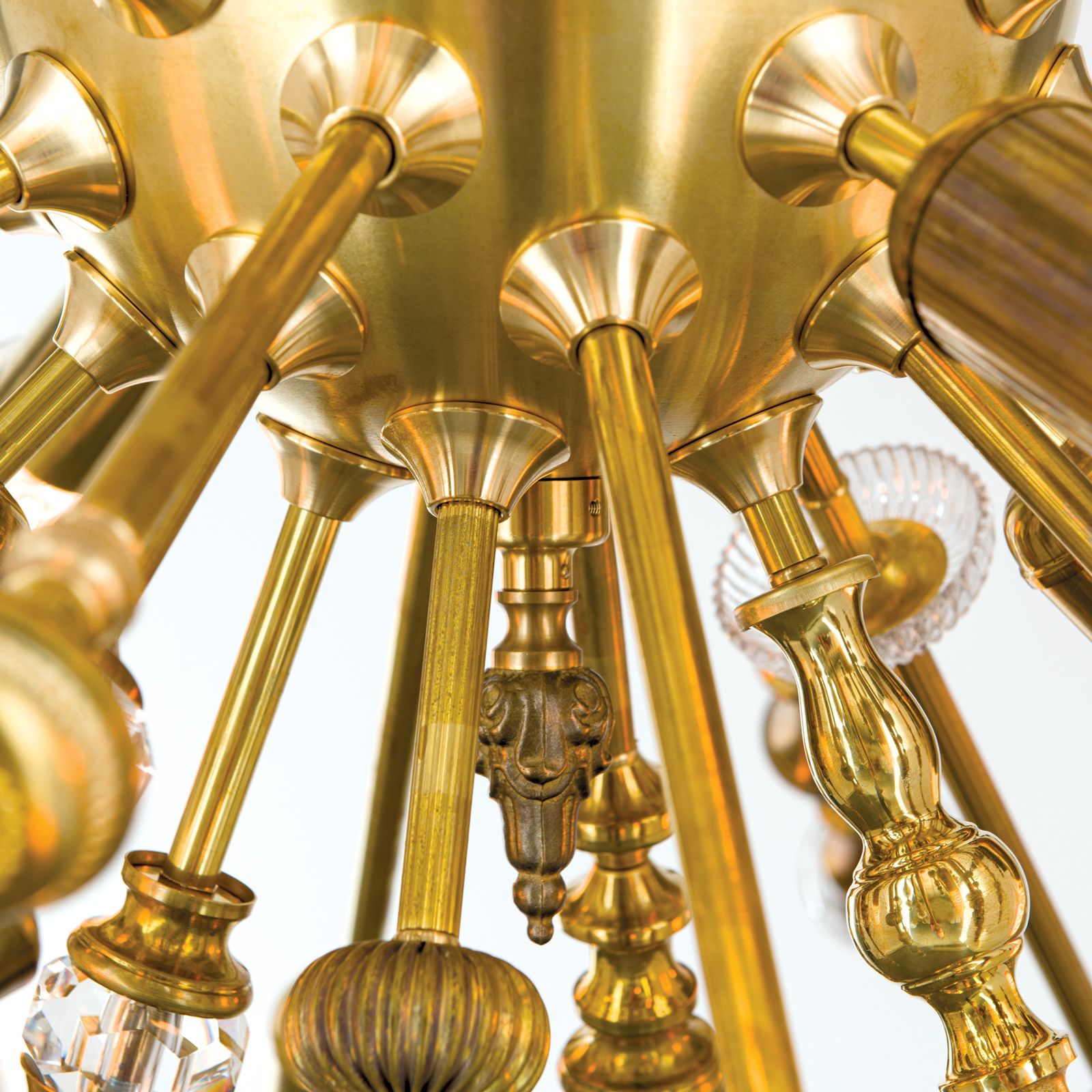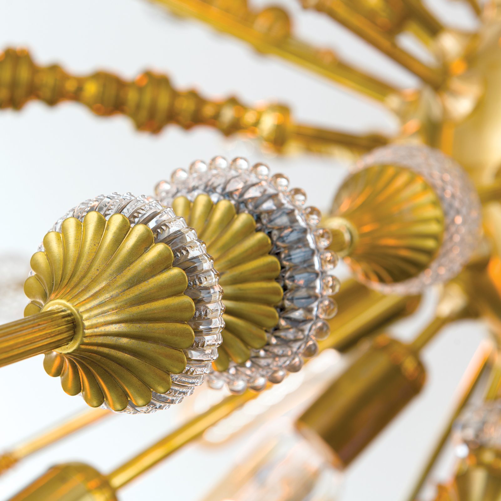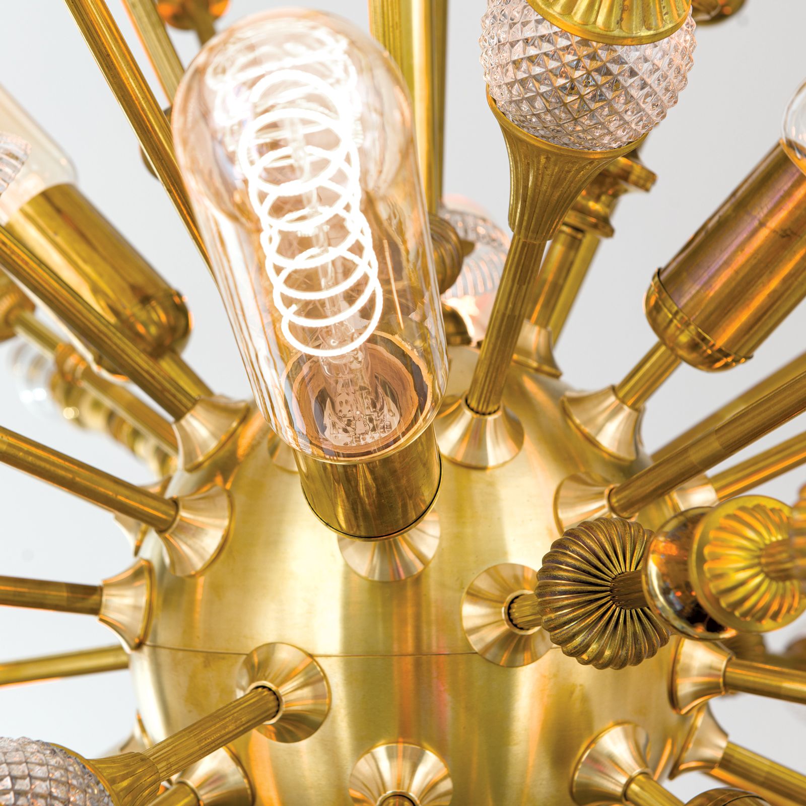 The exclusive series "Design by ORION: BAROCOCO" combines the past and the future in a spectacular way to create a completely new design. Its name is a play on words from the epochal terms of baroque and rococo. However, the original decorative elements are not formed into a traditionally constructed chandelier. Instead, they are combined into a futuristic-looking design that borrows from the iconic Space Age light designs of the mid-20th century. The light has a strong sculptural presence. Its golden brass surface captures and reflects both natural and artificial light to create the same golden warmth at any time of day or night. Finish: brilliant brass, raw brass/ gilded/ chrome-plated, patinated/ custom finish on request.