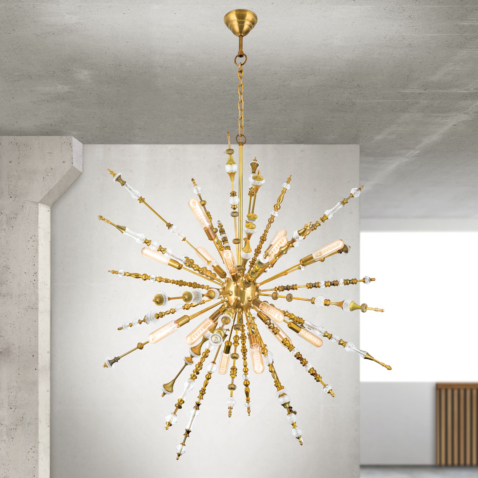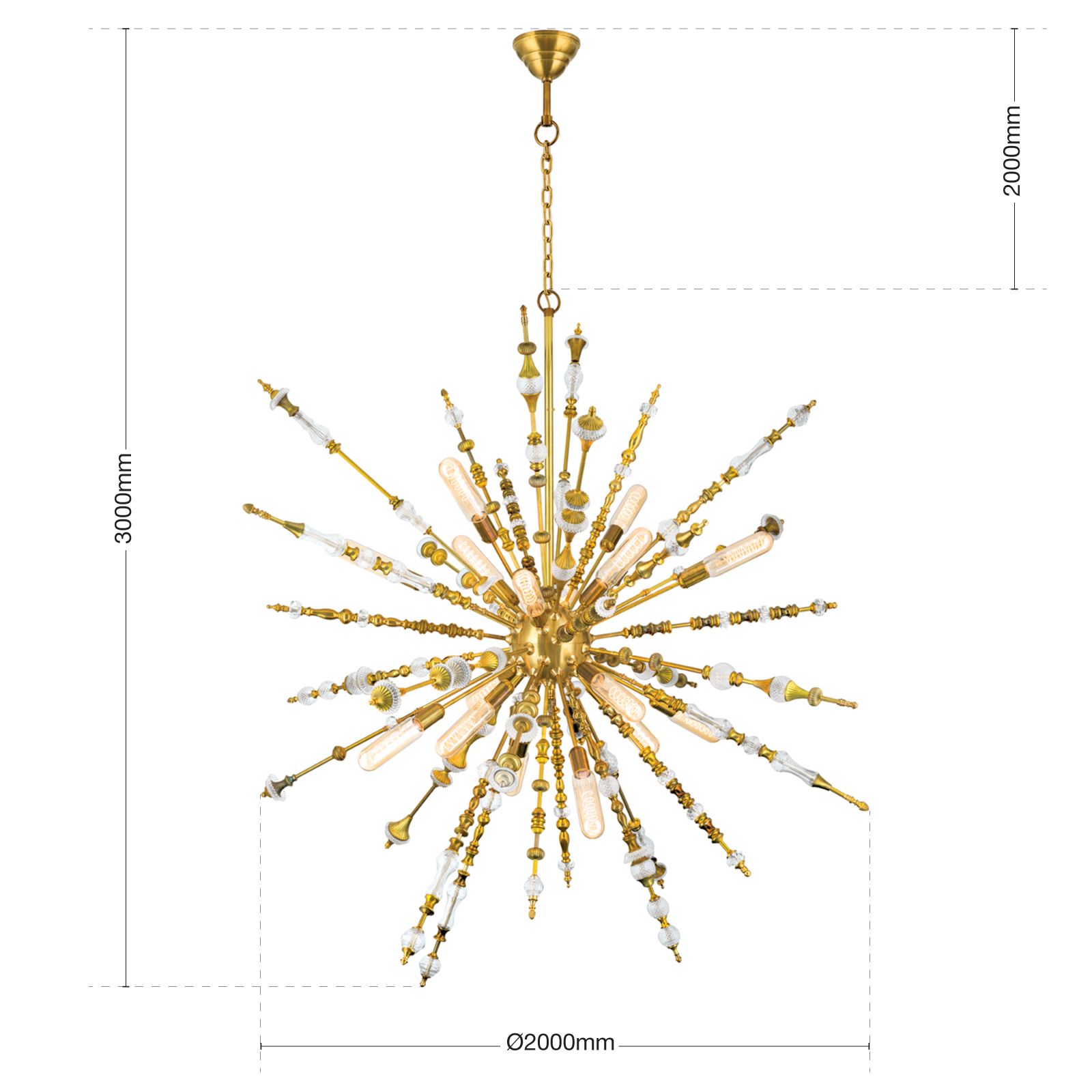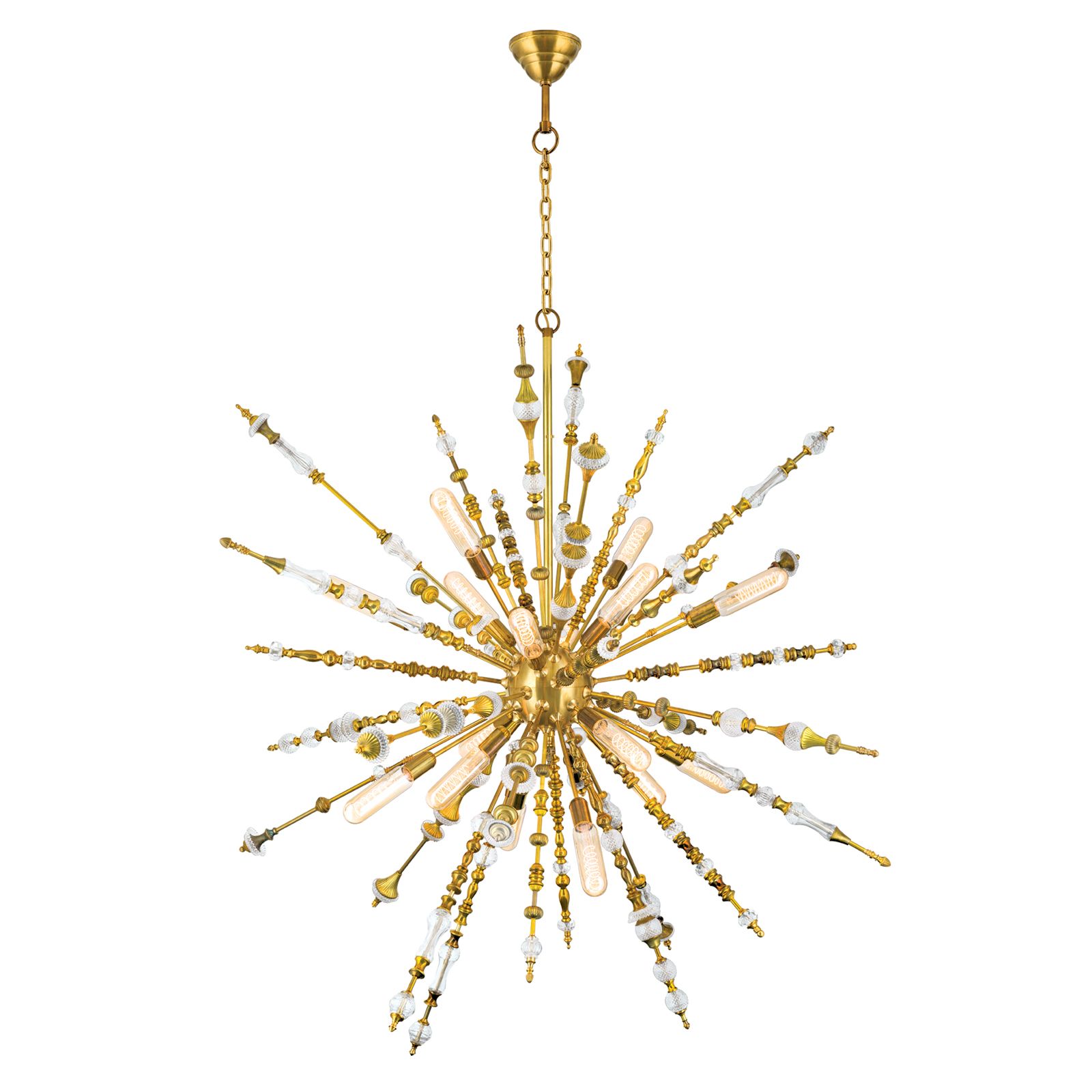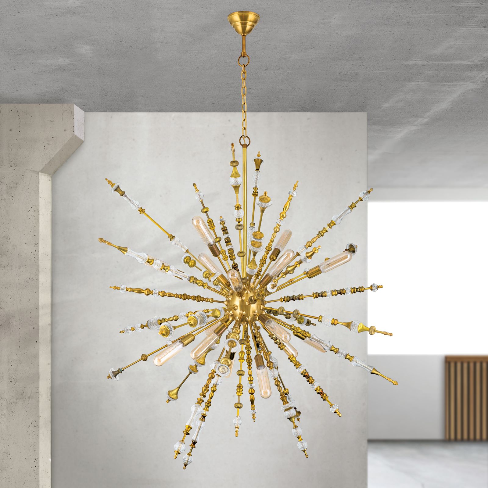 The exclusive series "Design by ORION: BAROCOCO" combines the past and the future in a spectacular way to create a completely new design. Its name is a play on words from the epochal terms of baroque and rococo. However, the original decorative elements are not formed into a traditionally constructed chandelier. Instead, they are combined into a futuristic-looking design that borrows from the iconic Space Age light designs of the mid-20th century. The light has a strong sculptural presence. Its golden brass surface captures and reflects both natural and artificial light to create the same golden warmth at any time of day or night. Finish: brilliant brass, raw brass/ gilded/ chrome-plated, patinated/ custom finish on request.