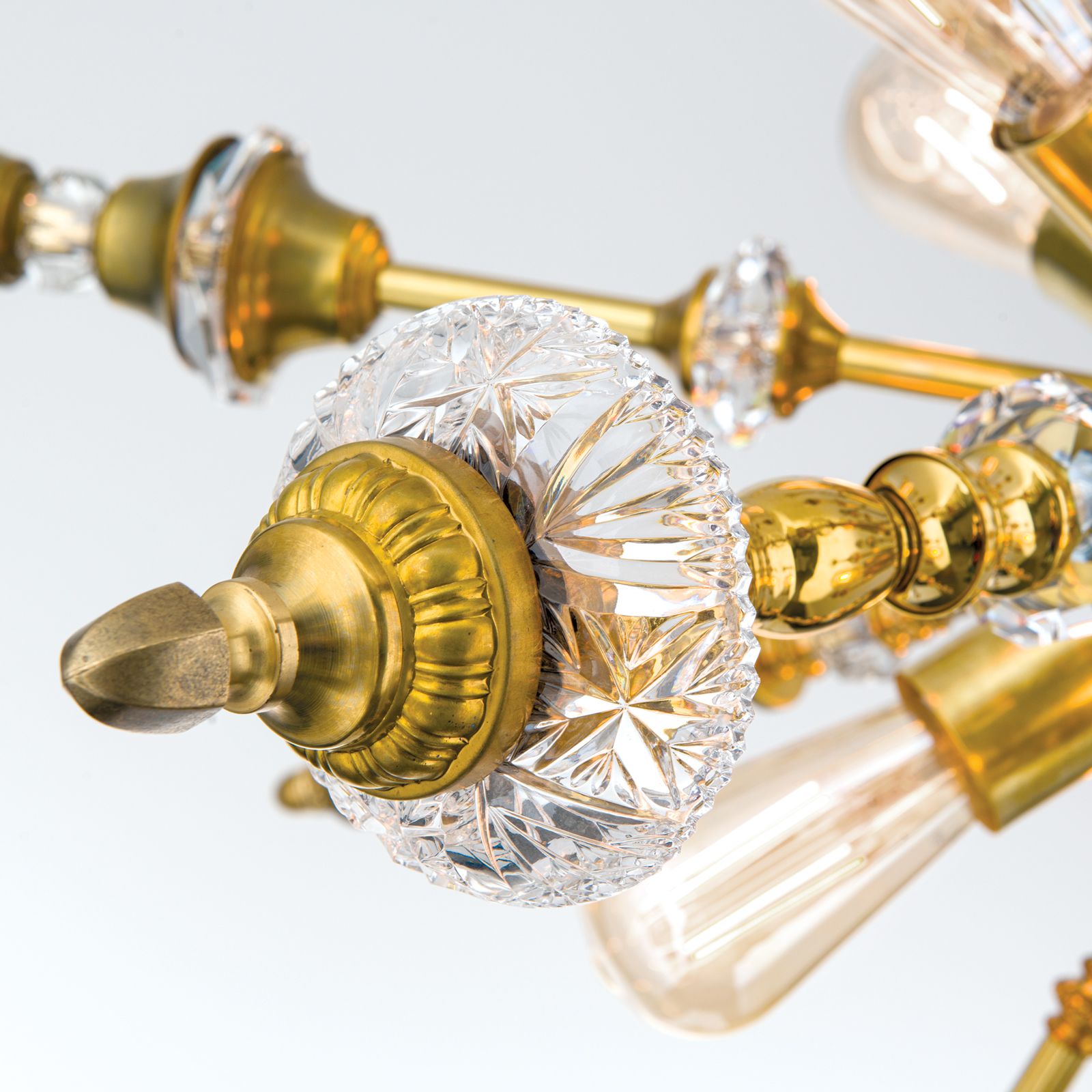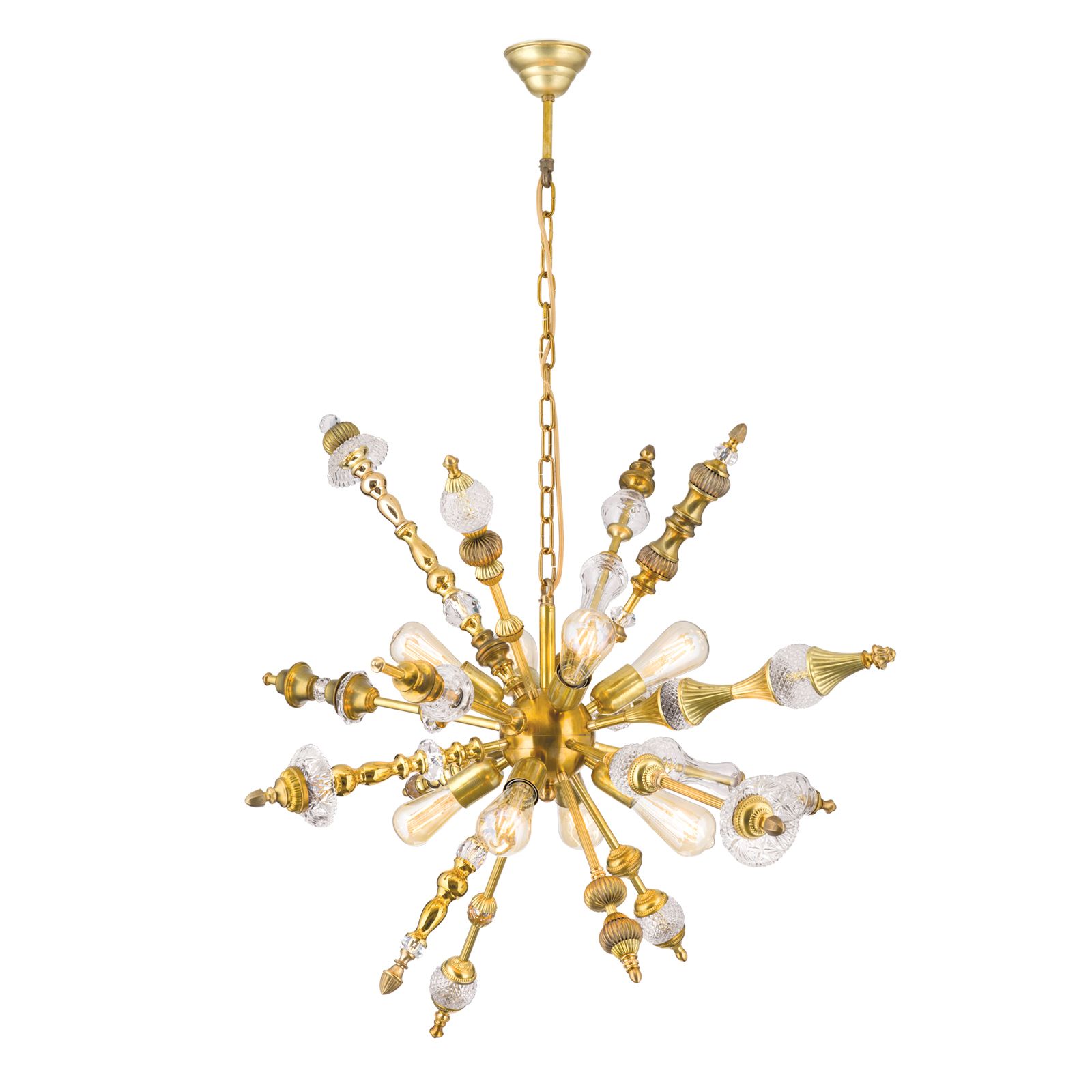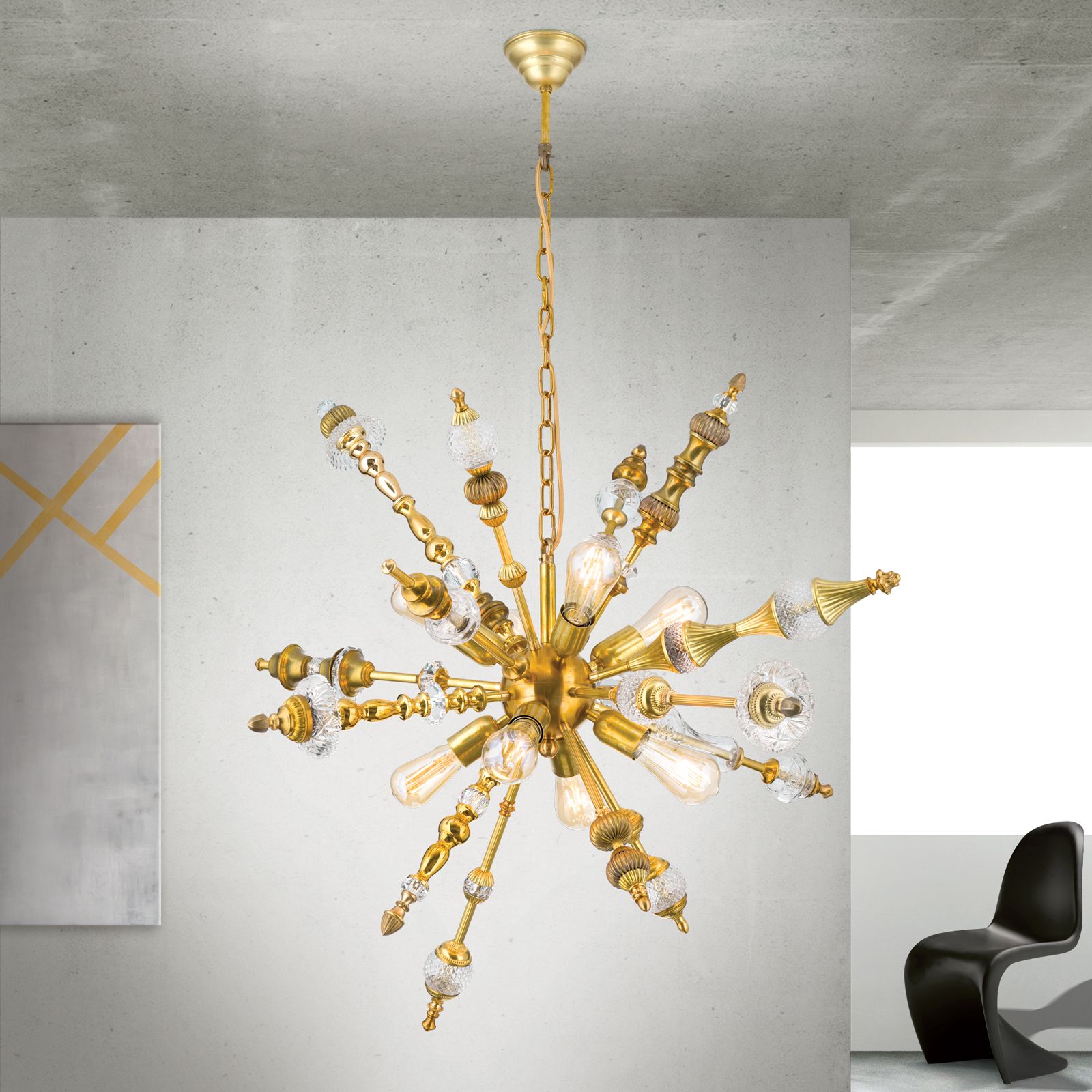 The smaller chandelier from the "Design by Orion" series BAROCOCO is a modern design that is composed of elements of baroque and rococo. Inspired by the Space Age of the Fifties and Sixties, it conveys both the nostalgic charm of the past and the vision of a futuristic future, giving BAROCOCO a special flair. It's a style that adds character and expression to your interior while recalling our historical memory. Each piece is very special and will transform your home into an oasis of well-being. The golden finish is made from brass and reflects both natural and artificial light, creating a golden warmth at any time of day or night. Finish: brilliant brass, raw brass/ gilded/ chrome-plated, patinated/ desired finish on request.