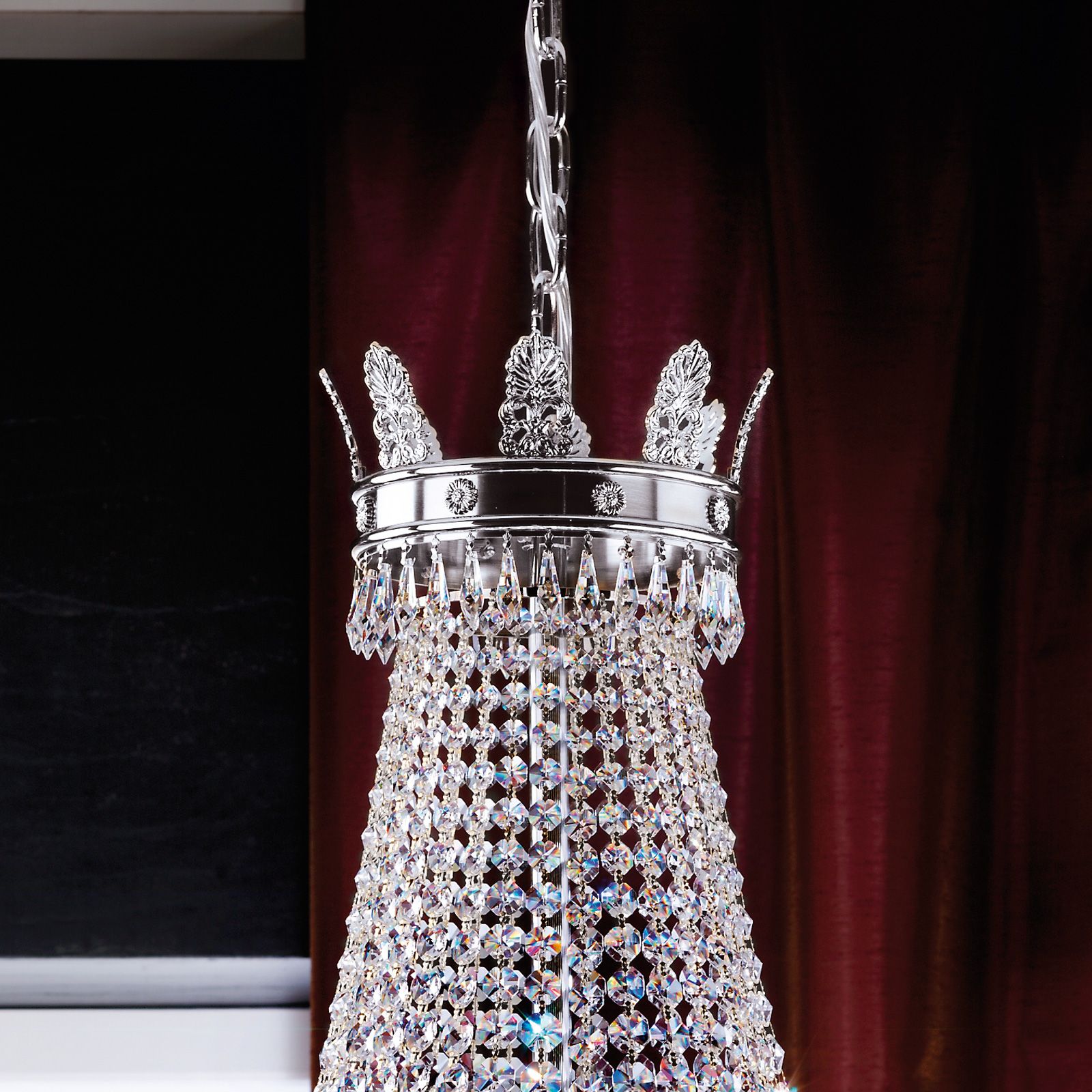 The chandelier from EMPIRE CRYSTAL series is a real gem that makes any room shine, glitter and sparkle. The combination of high-quality solid brass and clear chandelier crystal from Schöler in octagon and drop form makes it an elegant furnishing element in classical interiors as well as ideally suited for representatiional purposes. Due to its total height of 165 cm with suspension of 70 cm, it is the perfict fit for rooms with high ceilings. one of the chandelier's special details is the satin glass bowl in pattern cut, which both decorative and functional properties as it diffuses the light downwards softly and without glare.
