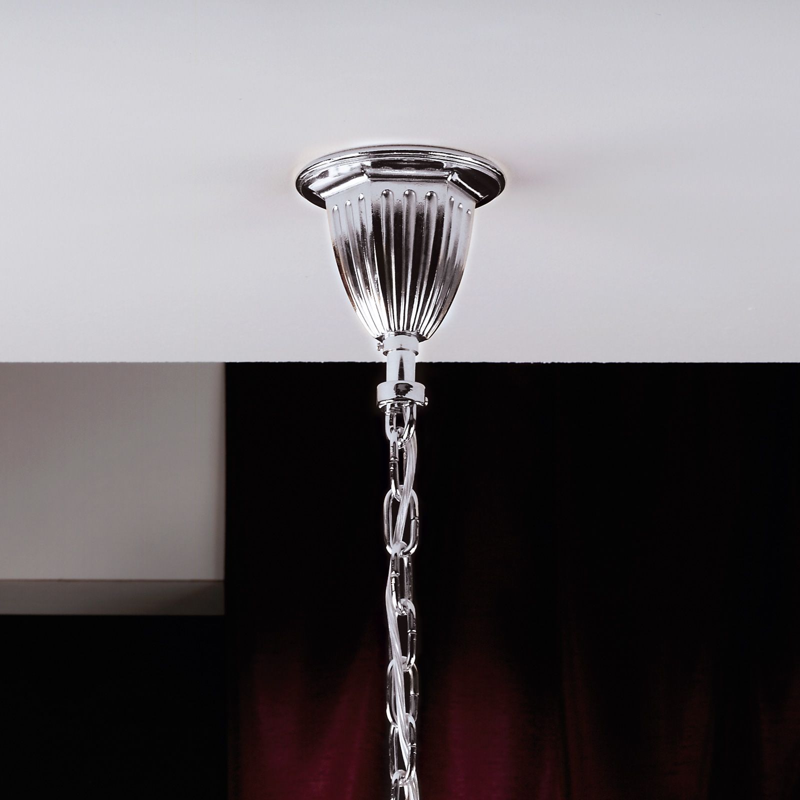The chandelier is equipped with 8 E27 sockets operated with 60 watts maximum each and 12 E14 sockets for 40 watts maximum each. By means of a dimmer, brightness can be regulated to create different lighting moods.
