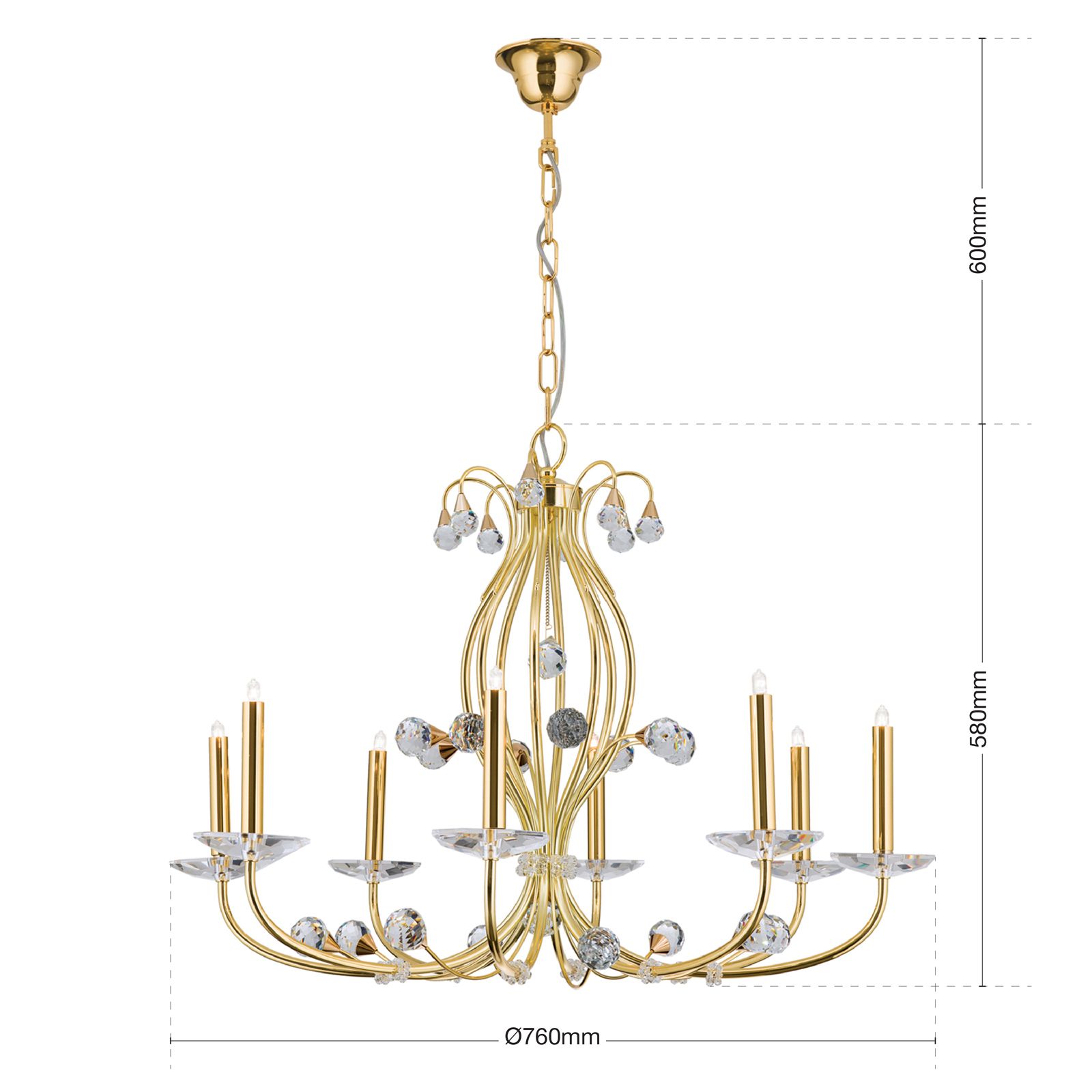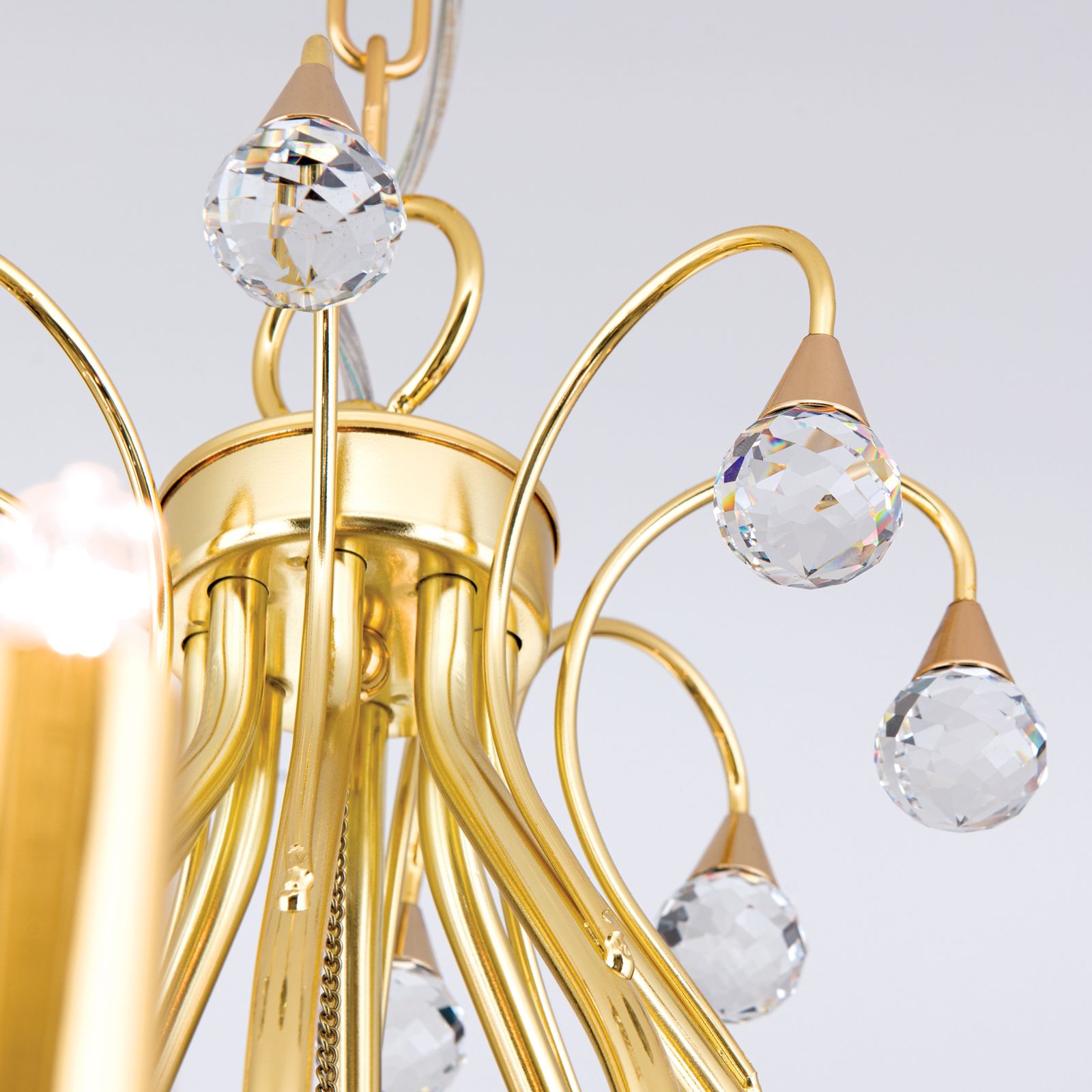 The dimmable chandelier is available in the following finishes: 24-carat gold, antique, satin.