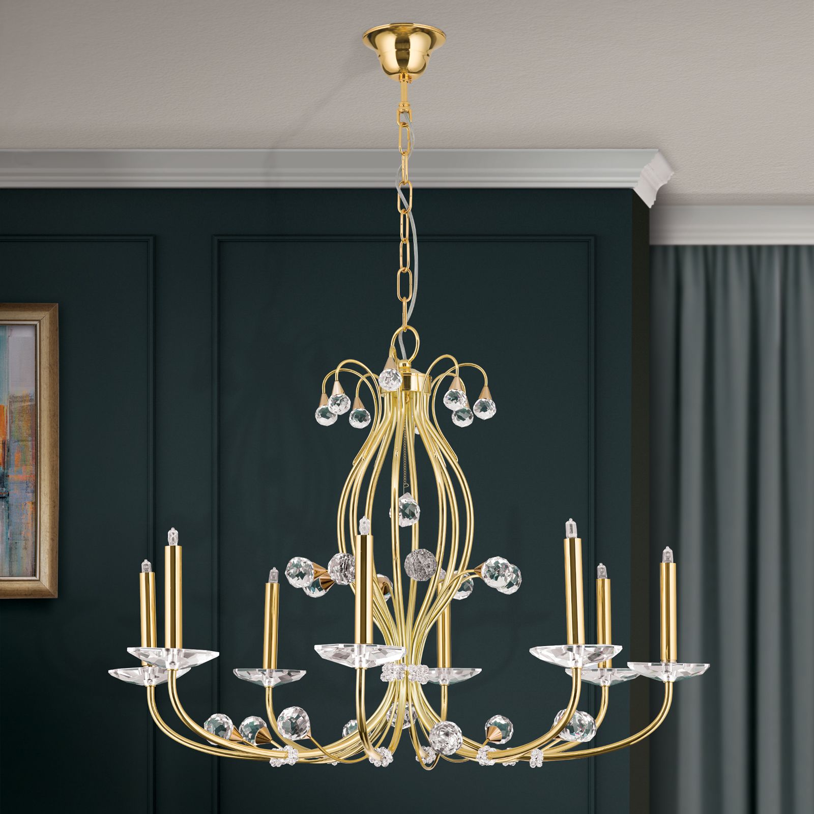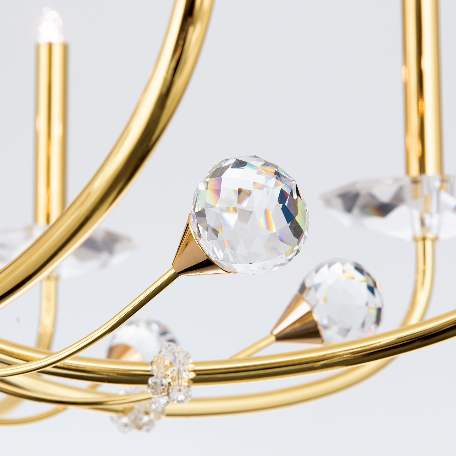 The EREMITAGE series is a homage to one of the world's most important art museums that houses art treasures from antiquity to modernity. The combination of classical design with modern forms was the design idea's foundation. Due to its simple elegance, the chandelier is highly versatile in use. Itsclear lines accentuated by crystal elements let it provide decorative and light basic illumination above dining tables or centrally in living or bedrooms. The beautifully curved frame carries 8 G9 sockets and let the deliberately placed faceted Swarovski crystal balls glitter and sparkle. The crystal bobèches provide an added certain touch.