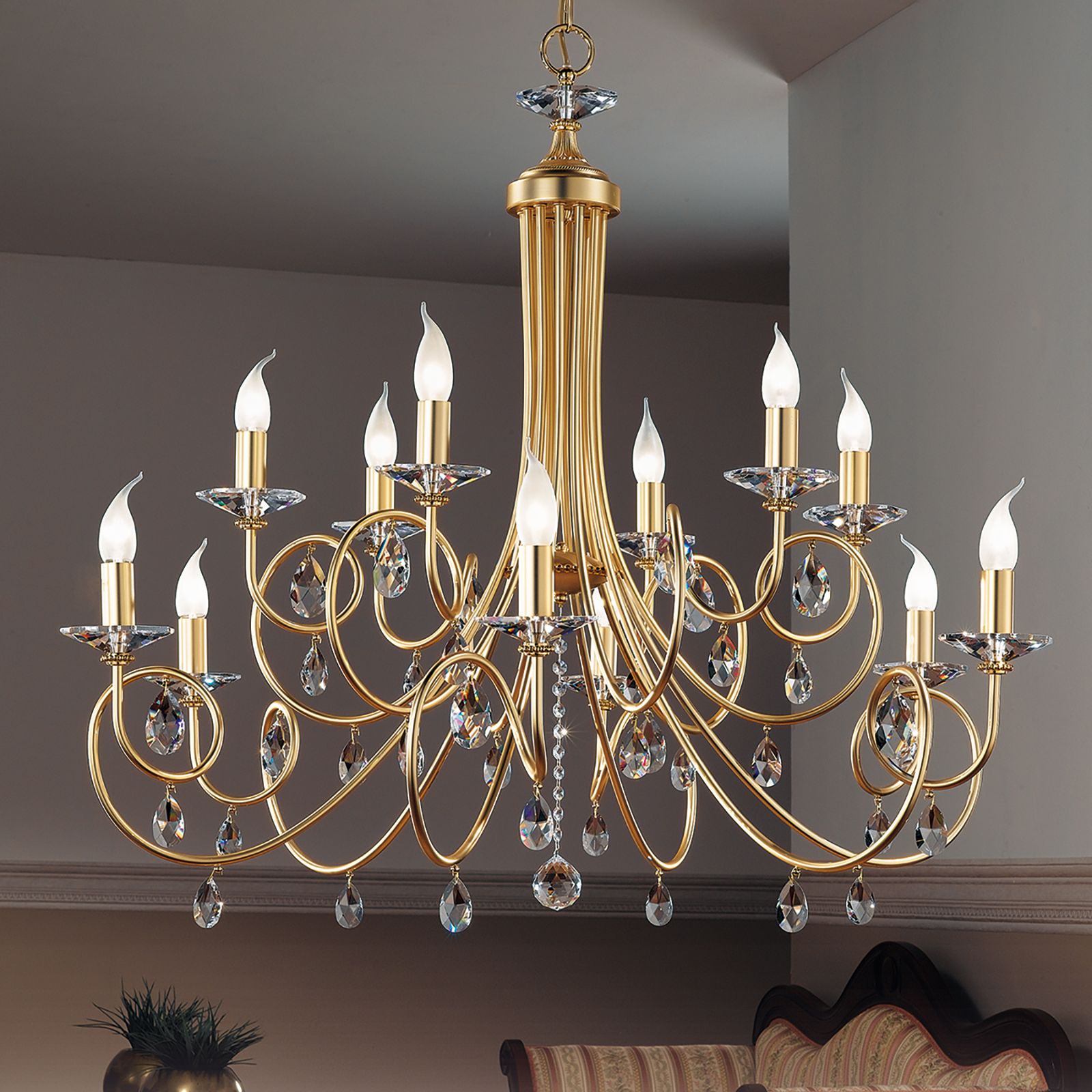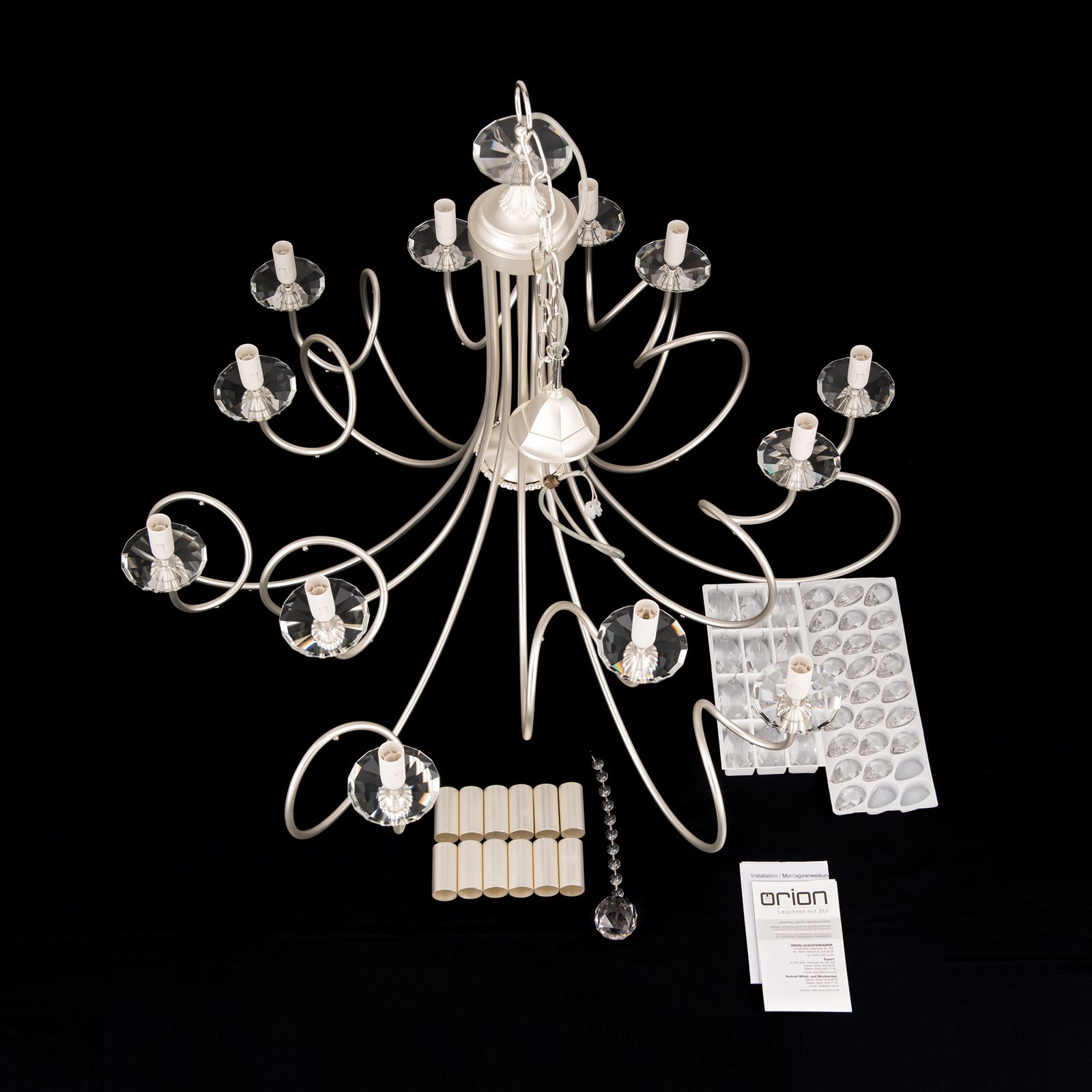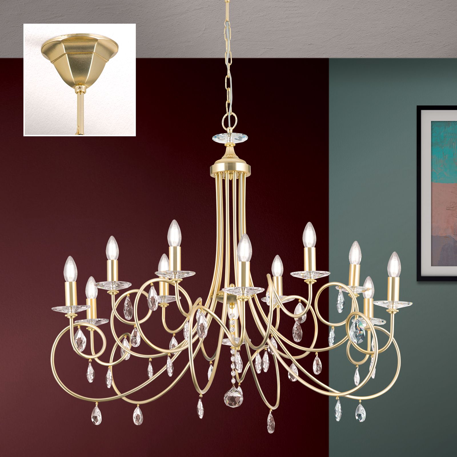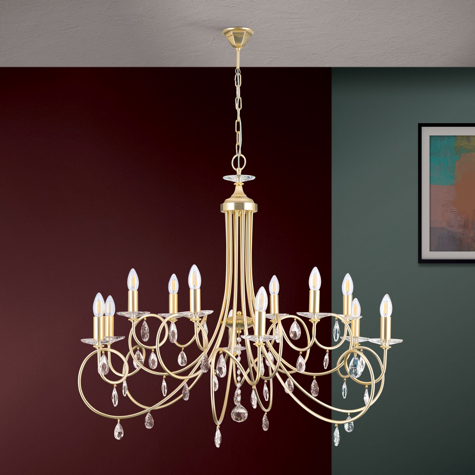 The imposing 12-lamps chandelier from the GIADA series will turn into any room's shining centre. It features a metal frame and impresses with full-cut chandelier crystal hanging from twelve curved arms. The light refracting through it creates fascinating play and reflections. It not only is a highlight when illuminated but also embodies beauty and elegance when unlit. It looks particularly good above dining or living room tables. The E14 sockets can be fitted with any bulbs (max. 40W).
