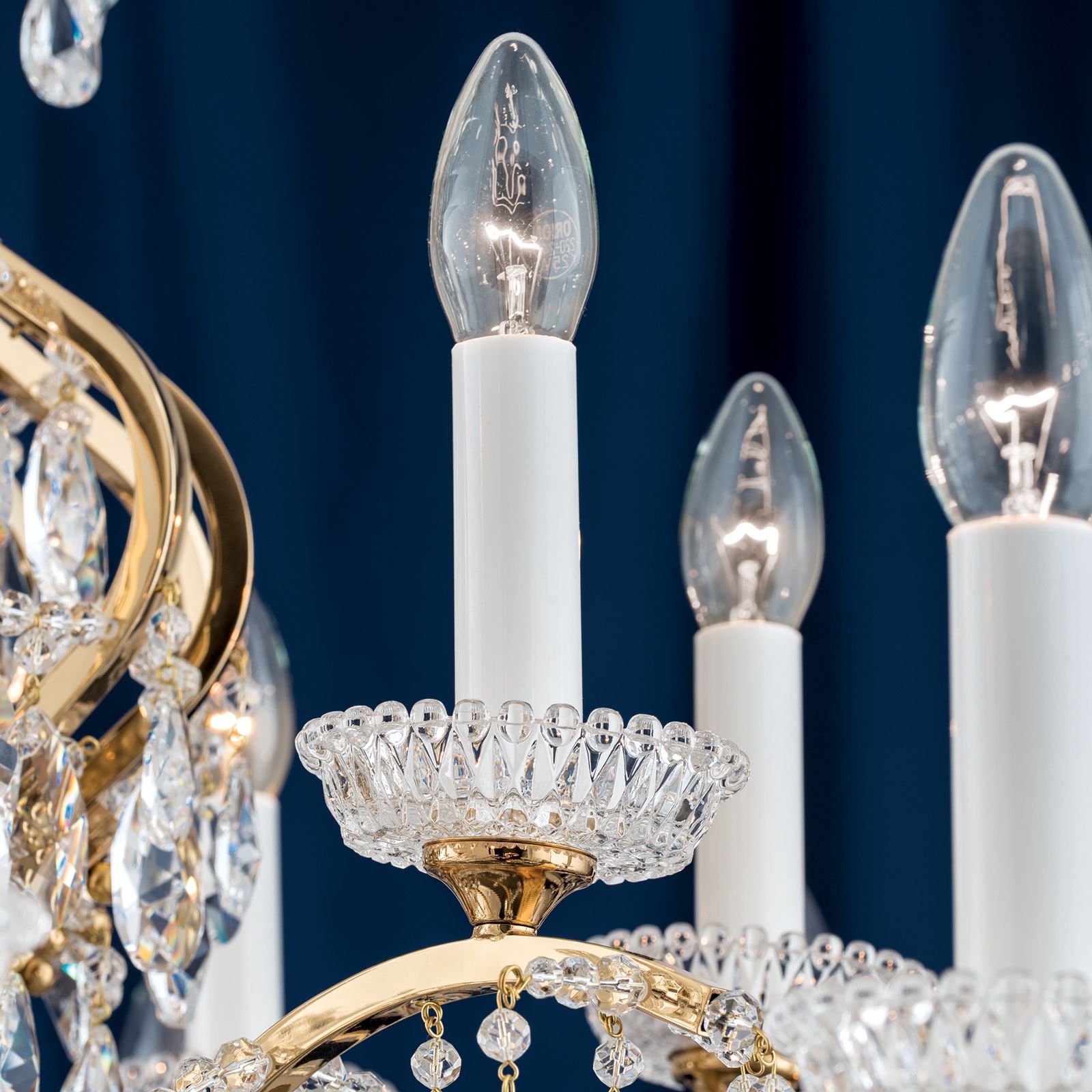The 45-flames chandelier from the HIROHITO series is without doubt the king among the royal chandeliers from this series. Four wreaths of flames widen towards the bottom and wind around the crystal-covered central column. A full brass corset, richly gold plated, supports this chandelier's colossal construction. Nosing arms in the style of Maria Theresa chandeliers carry the multi-flame light far into the room. At the bottom, a sparkling sea of myriads of crystals presents itself to the observer. The light effect is overwhelming due to the sheer quantity of lights. The countless shining and reflecting bodies enrich this experience with endless light refractions in all colours of the rainbow.