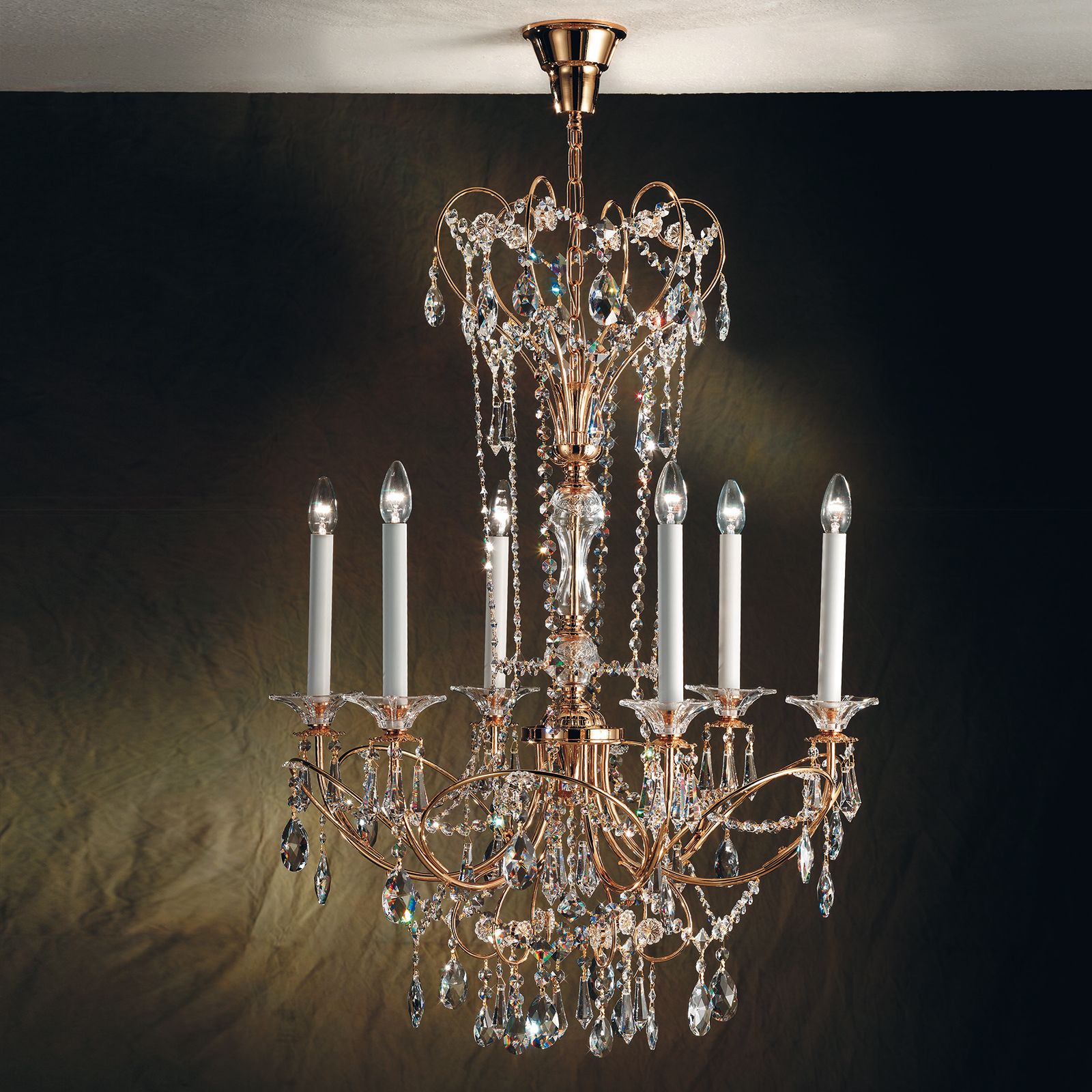 The 6-flames chandelier is the ideal choice when lightness and representative elegance are required. Reception rooms, entrance areas or salons with classical furnishings offer a suitable setting as well as modern interiors where it becomes a contrasting eye-catcher.
