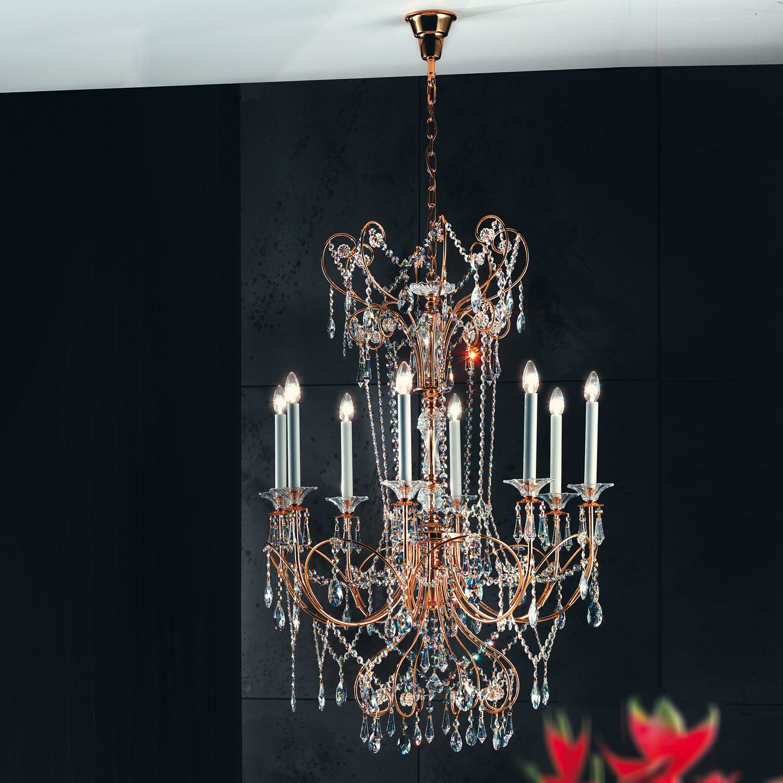 The chandelier owes its graceful and exclusive effect to its design and excellent workmanship. The filigree frame is made of solid brass and finished with 24-carat gold - a chrome-plated version is also available as an alternative. These are joined by high-quality crystals from Swarovski in numerous shapes such as quails, drops, pearls and rosettes. These are spun into a delicate, brilliantly sparkling net that encircles the rods and culminates in a crown pendant.