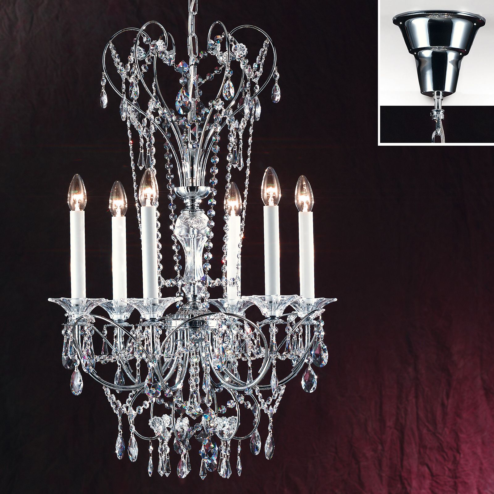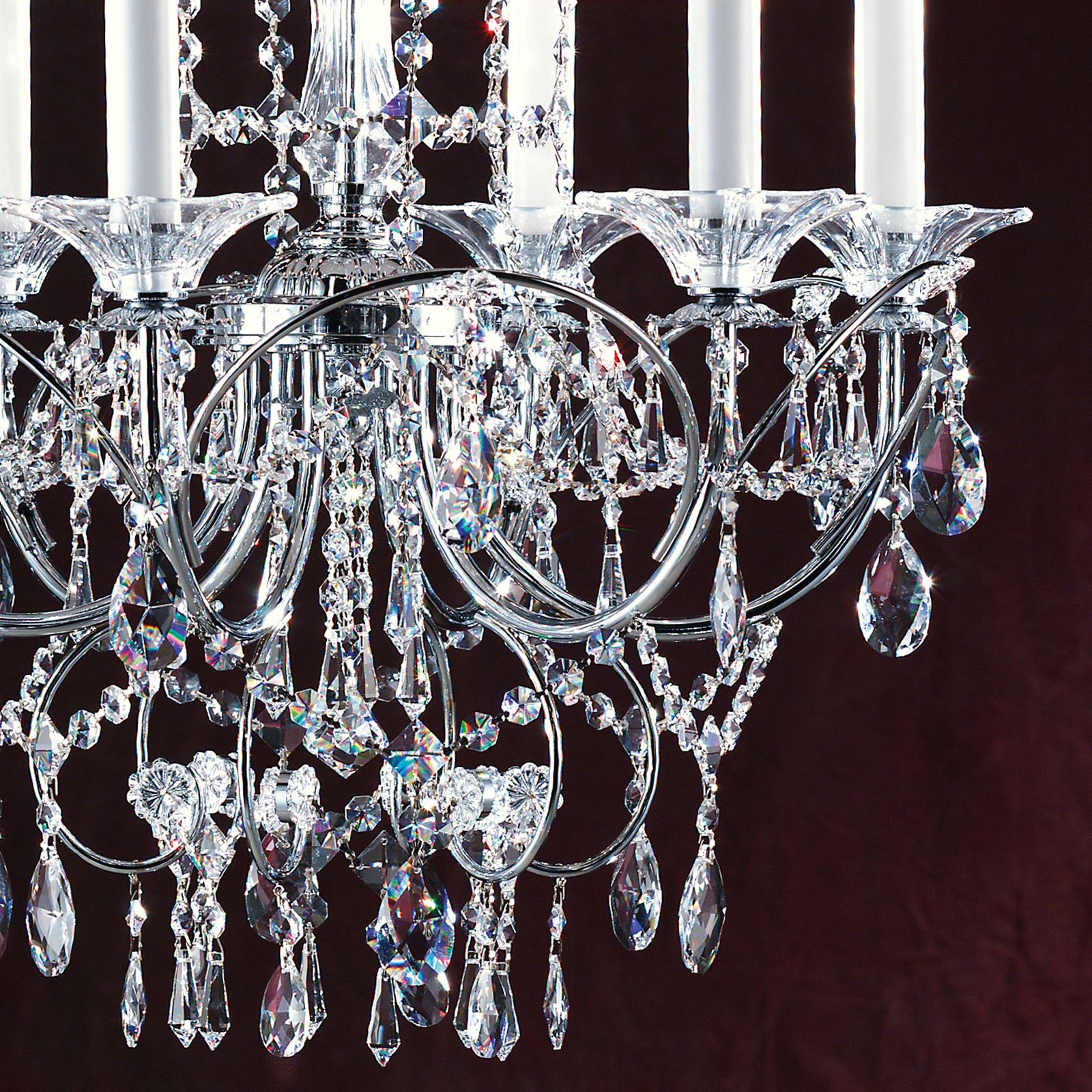 The filigree frame is made of brass with a chrome finish, but is also available in 24-carat gold plating. The precious chandelier crystal is made of SPECTRA® Swarovski® Crystal. Prisms, quails, pearls, square stones and rosettes are combined to create a delicate crystal chandelier.