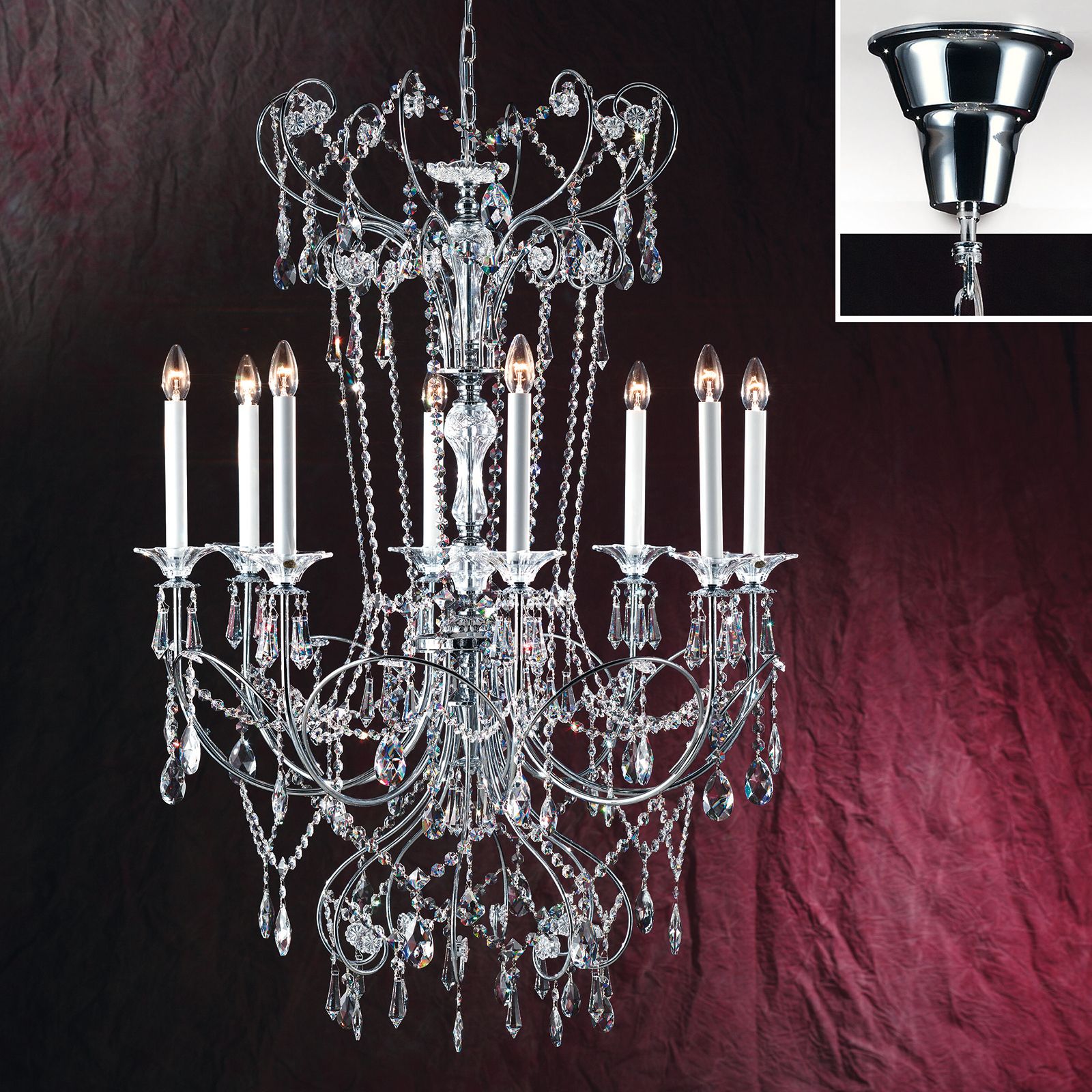 The chandelier owes its graceful and exclusive effect to its design and excellent workmanship. The filigree frame is made of solid brass and finished with 24-carat gold - a chrome-plated version is also available as an alternative. These are joined by high-quality crystals from Swarovski in numerous shapes such as quails, drops, pearls and rosettes. These are spun into a delicate, brilliantly sparkling net that encircles the rods and culminates in a crown pendant.
