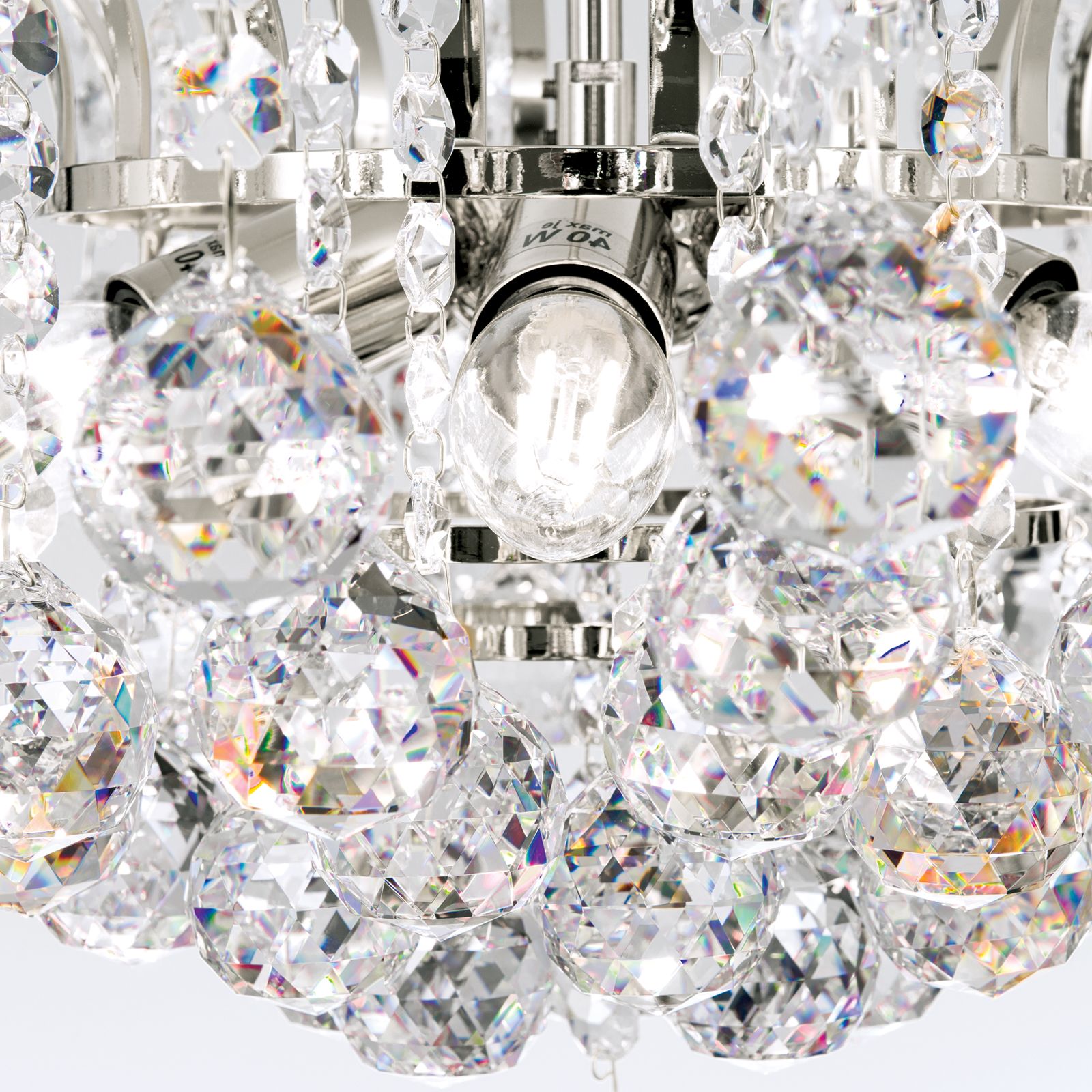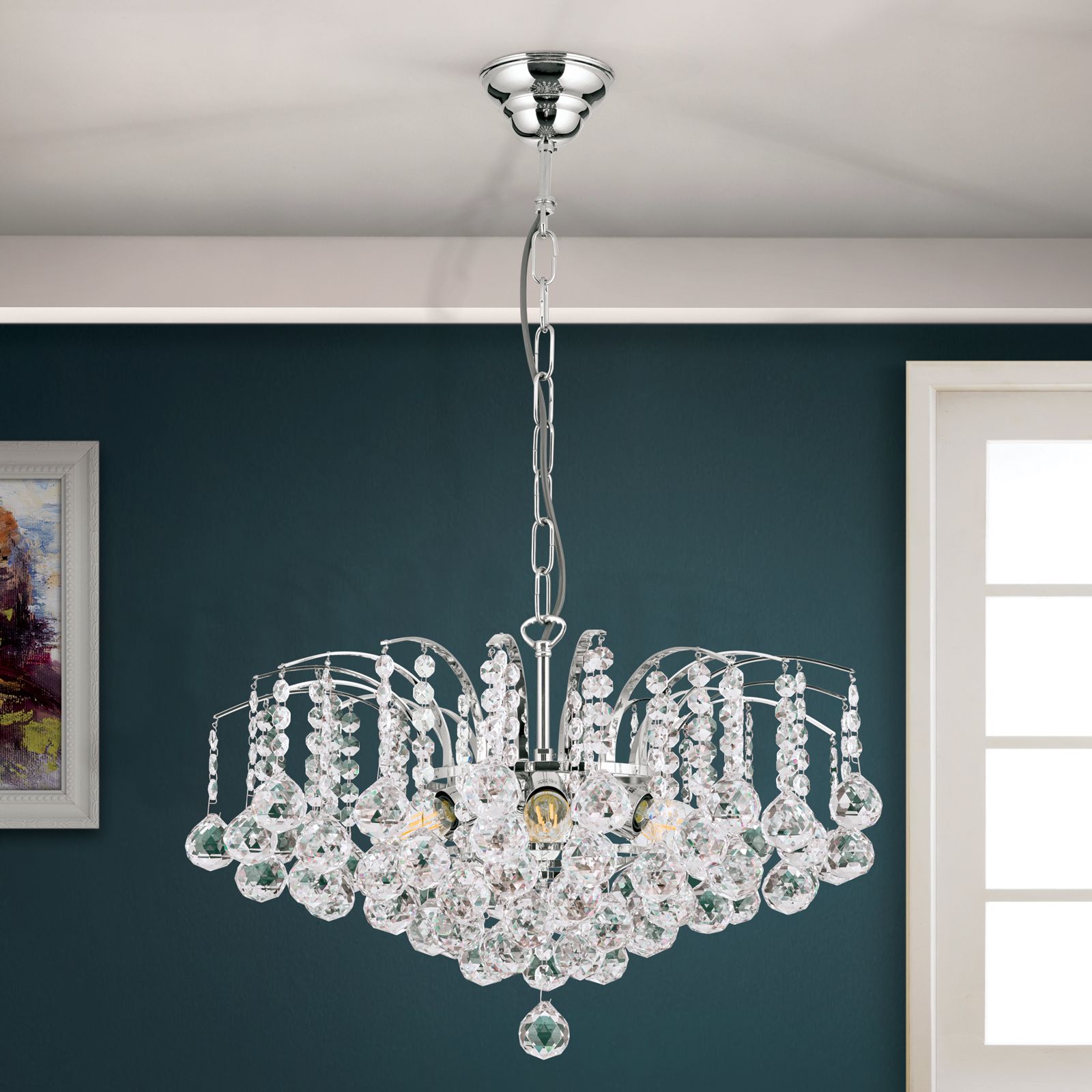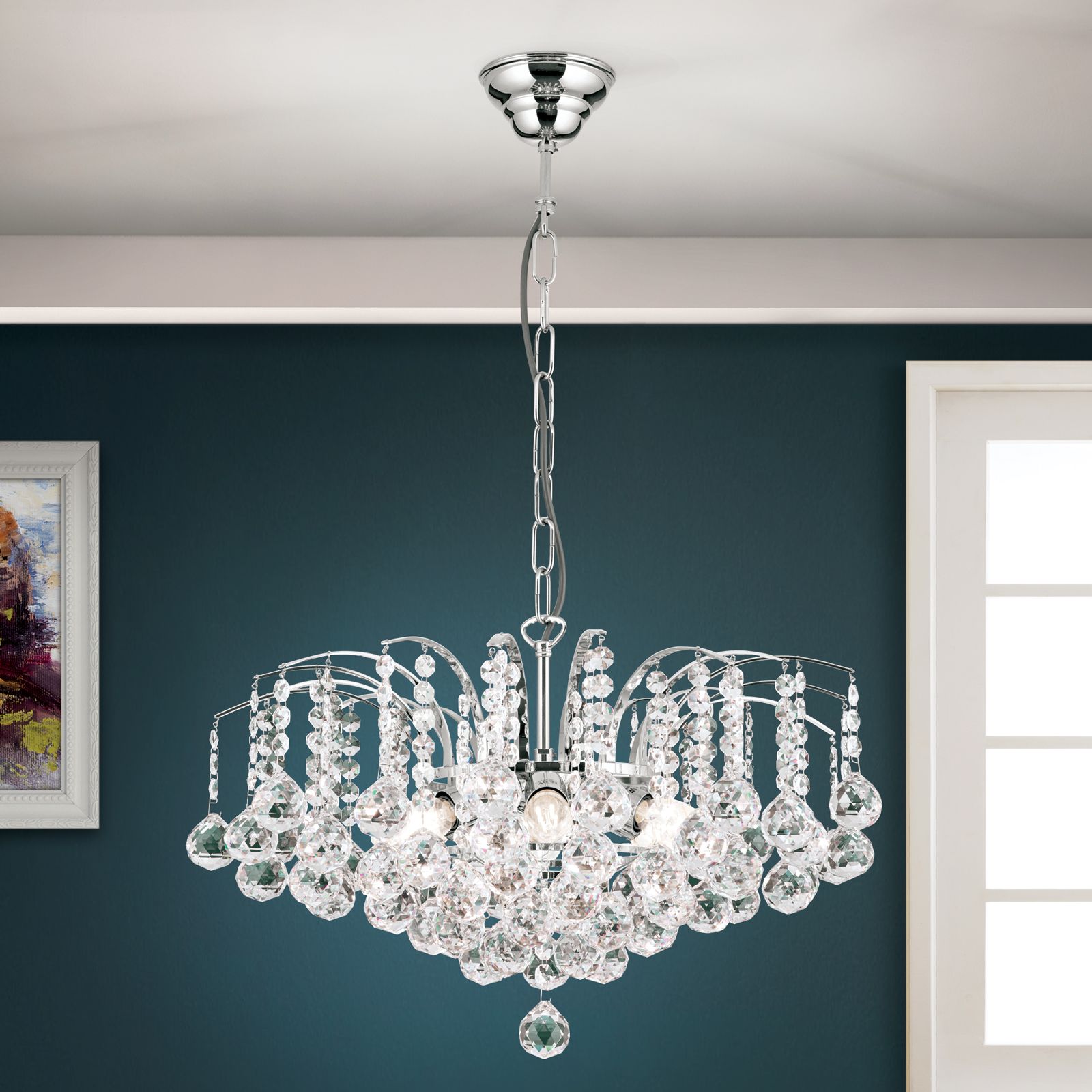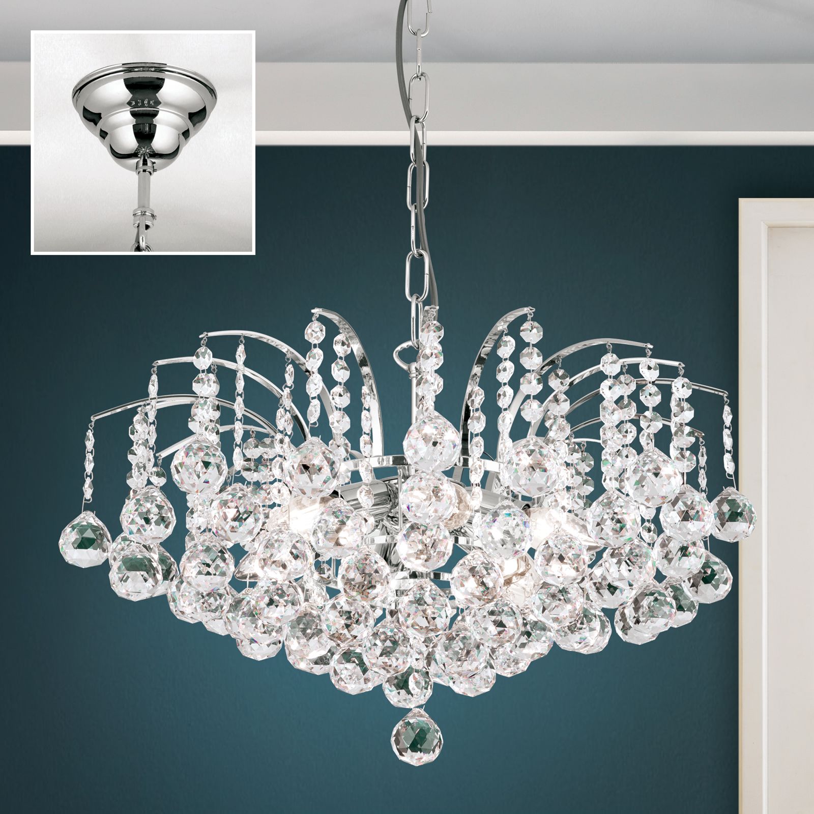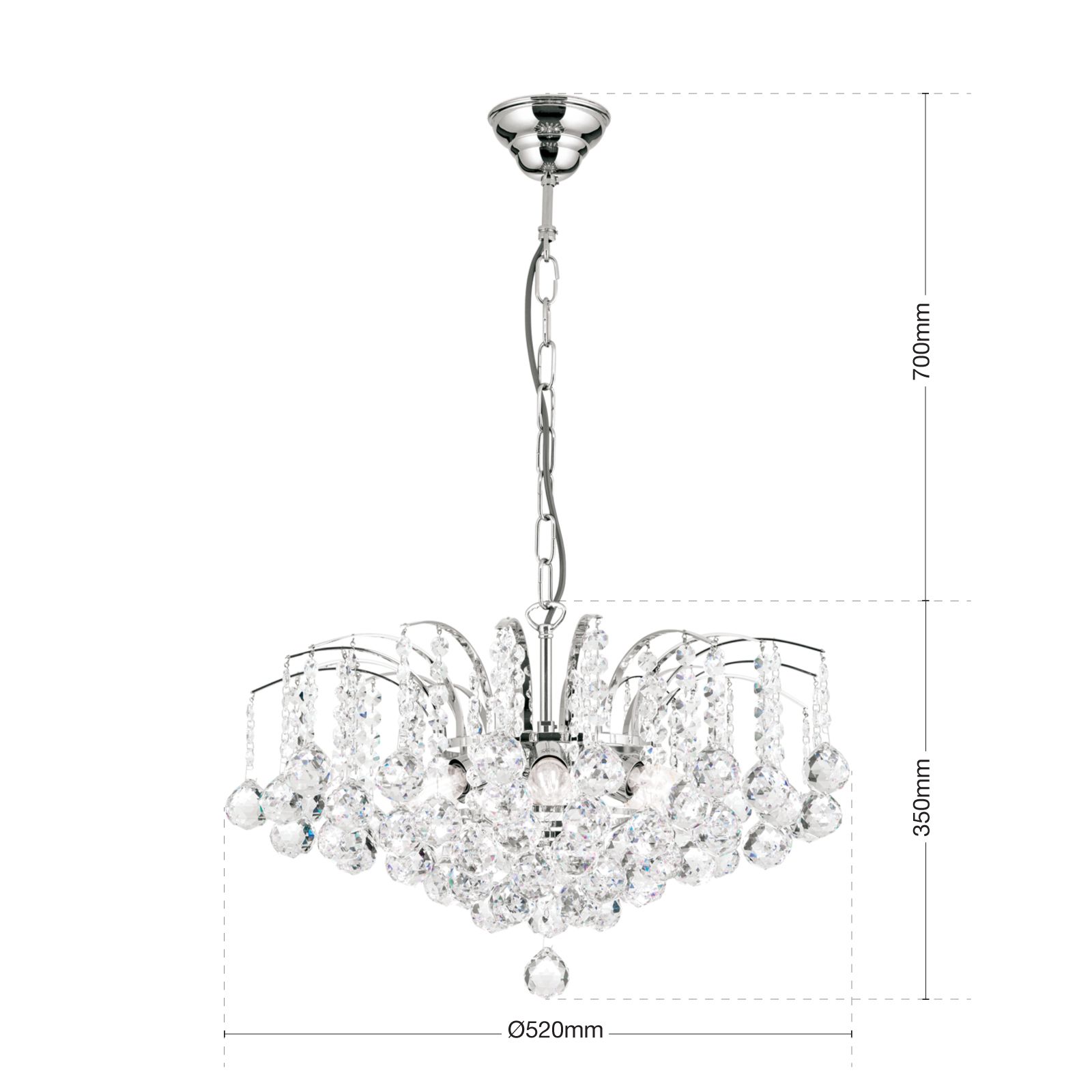 With a diameter of 52 centimetres, the chandelier is suited as a exquisite luminaire above dining tables giving the room a solemnly elegant atmosphere. A finish in gold or chrome refines the brass body combined with clear crystal hangings. The dimmable chandelier is equipped with 6 E14 sockets and can be fitted with a 40 watts maximum per socket. The chain suspension has a length of 70 centimetres and can be shortened as needed.
