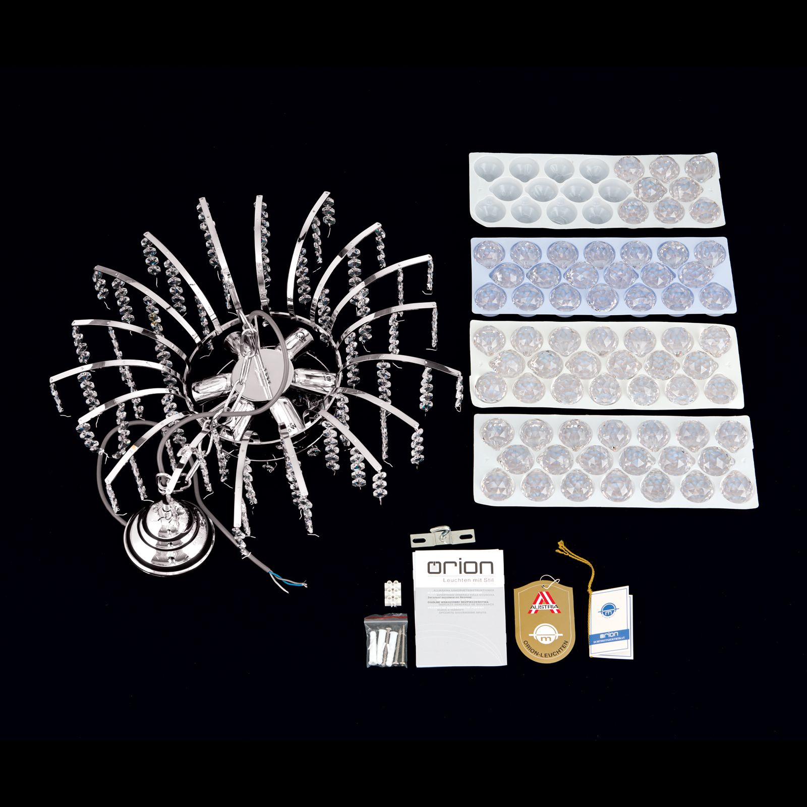 Magnificent chandelier decorations from the house of Asfour adorn the 6-flame chandelier from the KRISTALL KLASSISCH series. Like a fan, the brass frame unfolds in delicate stays that carry chains of fine knobs and crystal balls. When light hits them, they develop a vivid light and colour play that is almost impossible to resist.