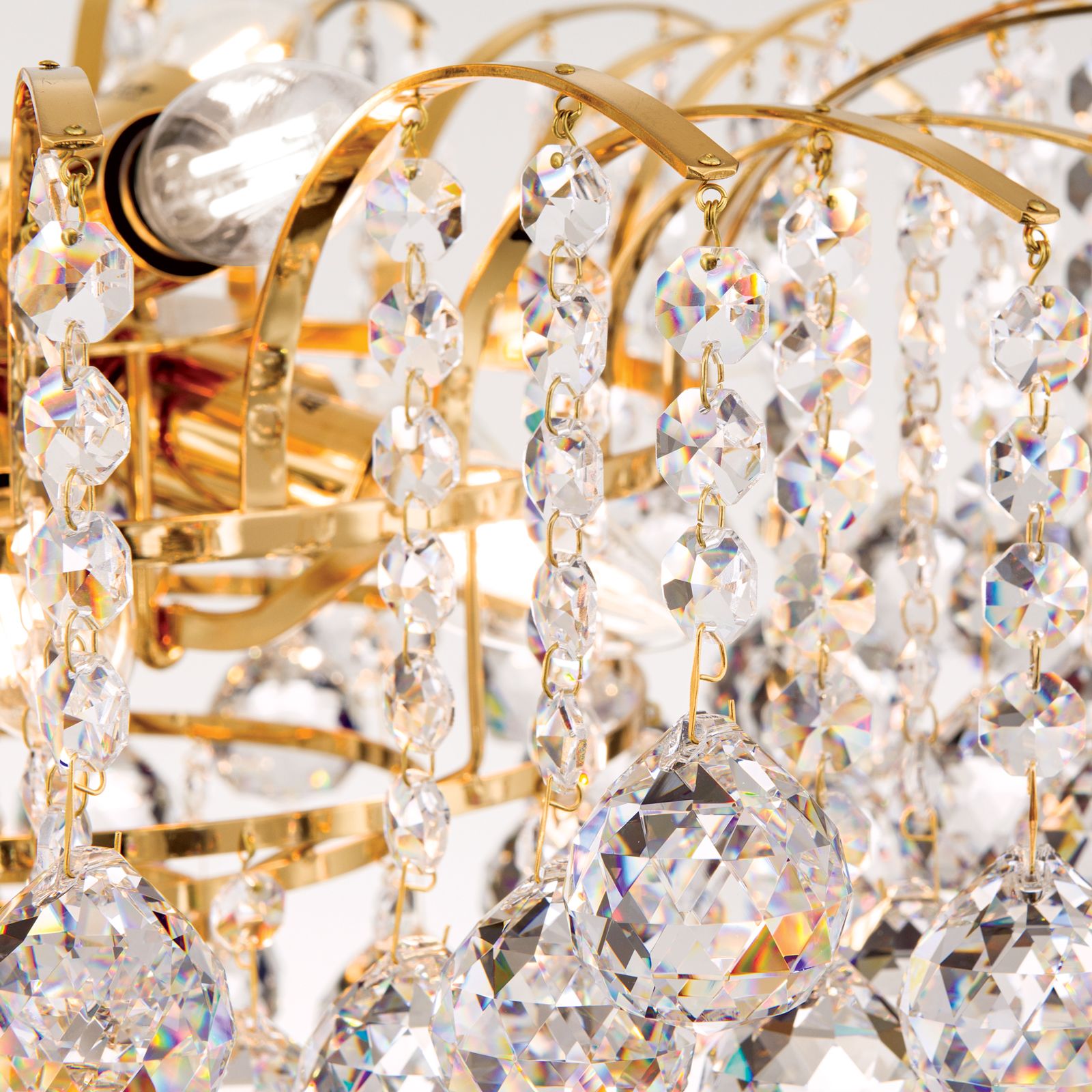 Festive tables shine in noble splendour under magnificent crystal chandeliers: the 9-flames chandelier from the KRISTALL KLASSISCH series is made for this. Delicate brass says unfold into the room in fan shape carrying richly studded crystal chains of fine connectors and spheres. They refract the light in many ways, which is then reflected by the shining struts to unfold a lively play of light and colour. This gives dining rooms a solemnly elegant touch or enchants bedrooms with the crystal cascades giving off sparkling light refractions.