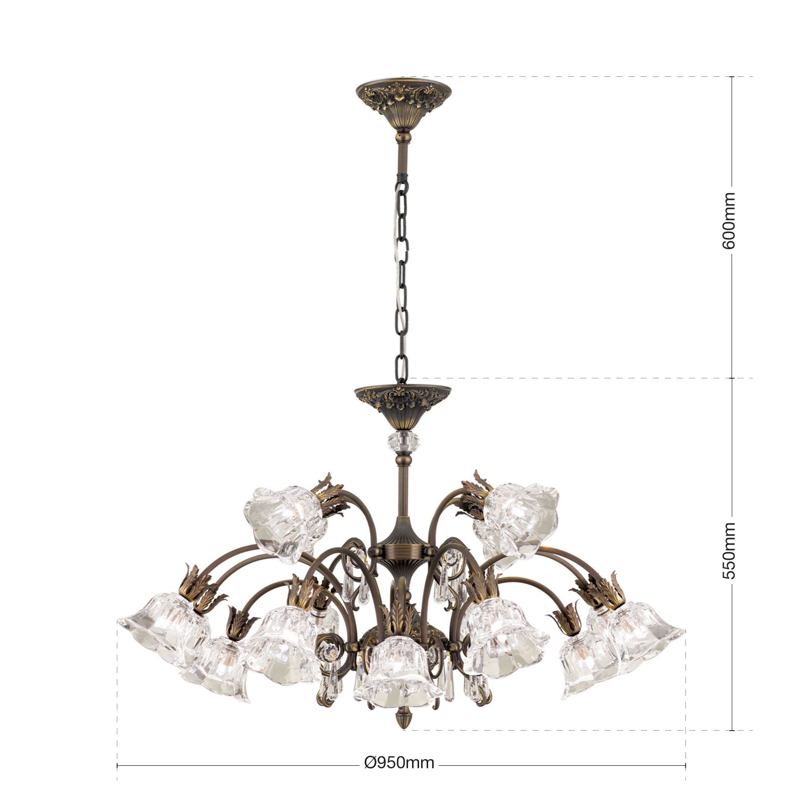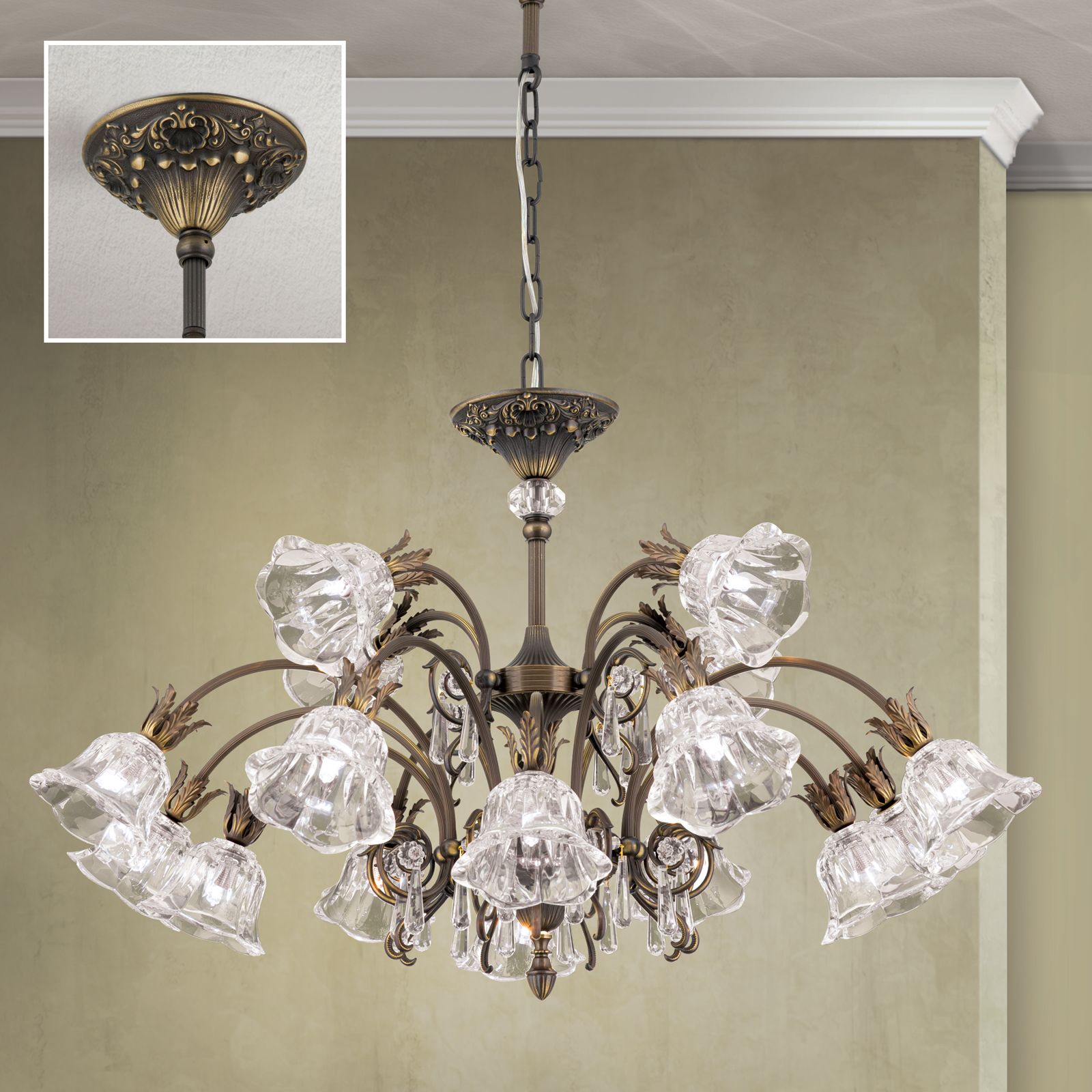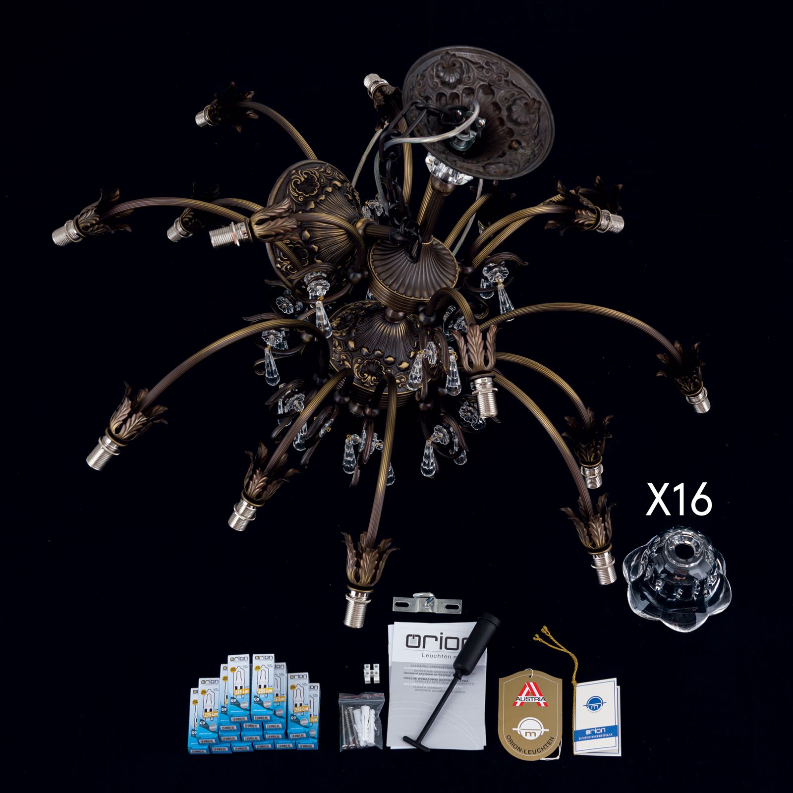 The chandelier is equipped with an impressive 16 G9 holders, which can be fitted with a maximum of 40 watts. A dimmer can be used to create individual lighting conditions. The chandelier is available in hand-shaded antique patina, antique silver and gold.