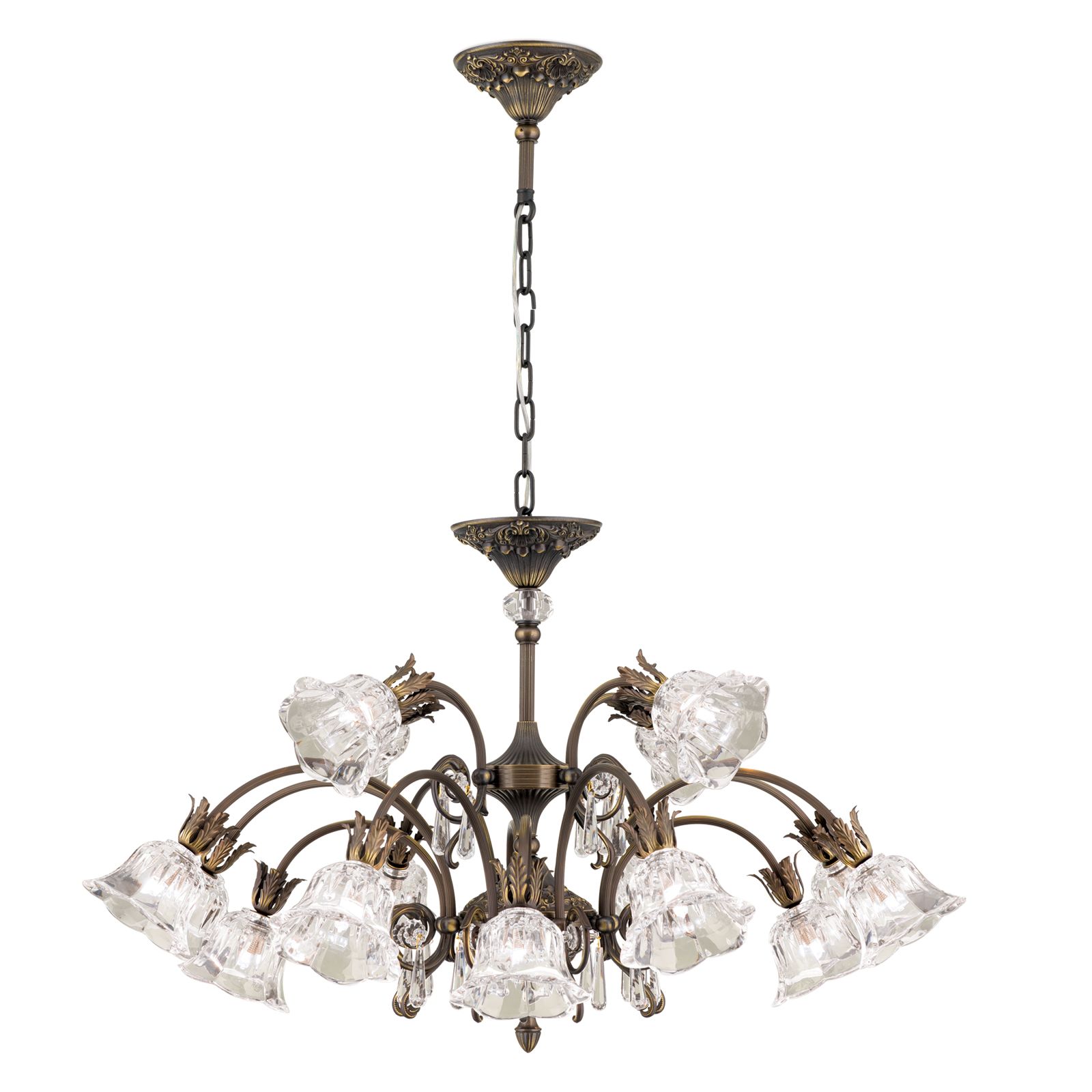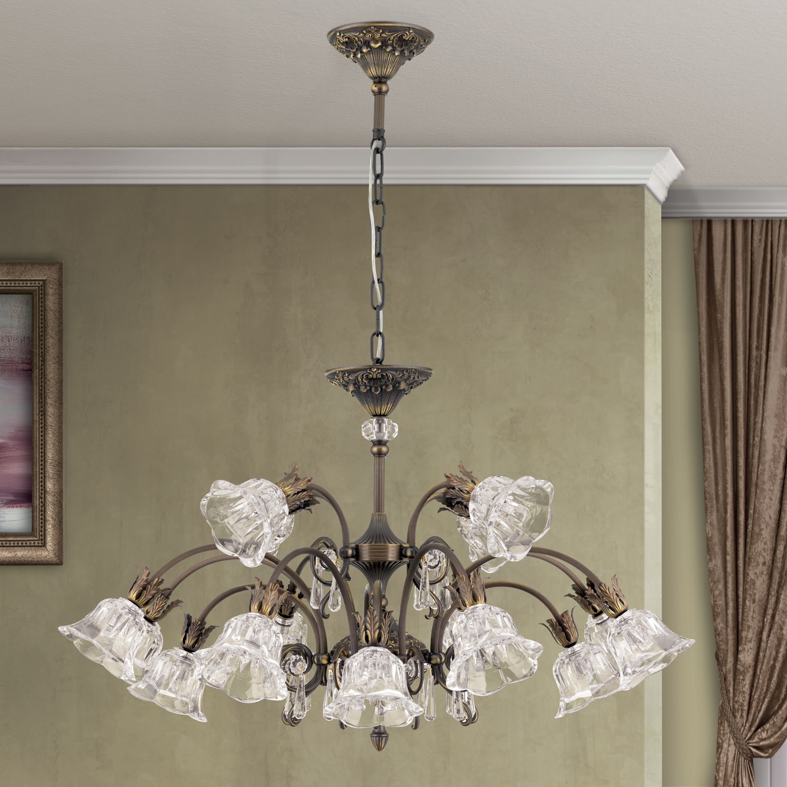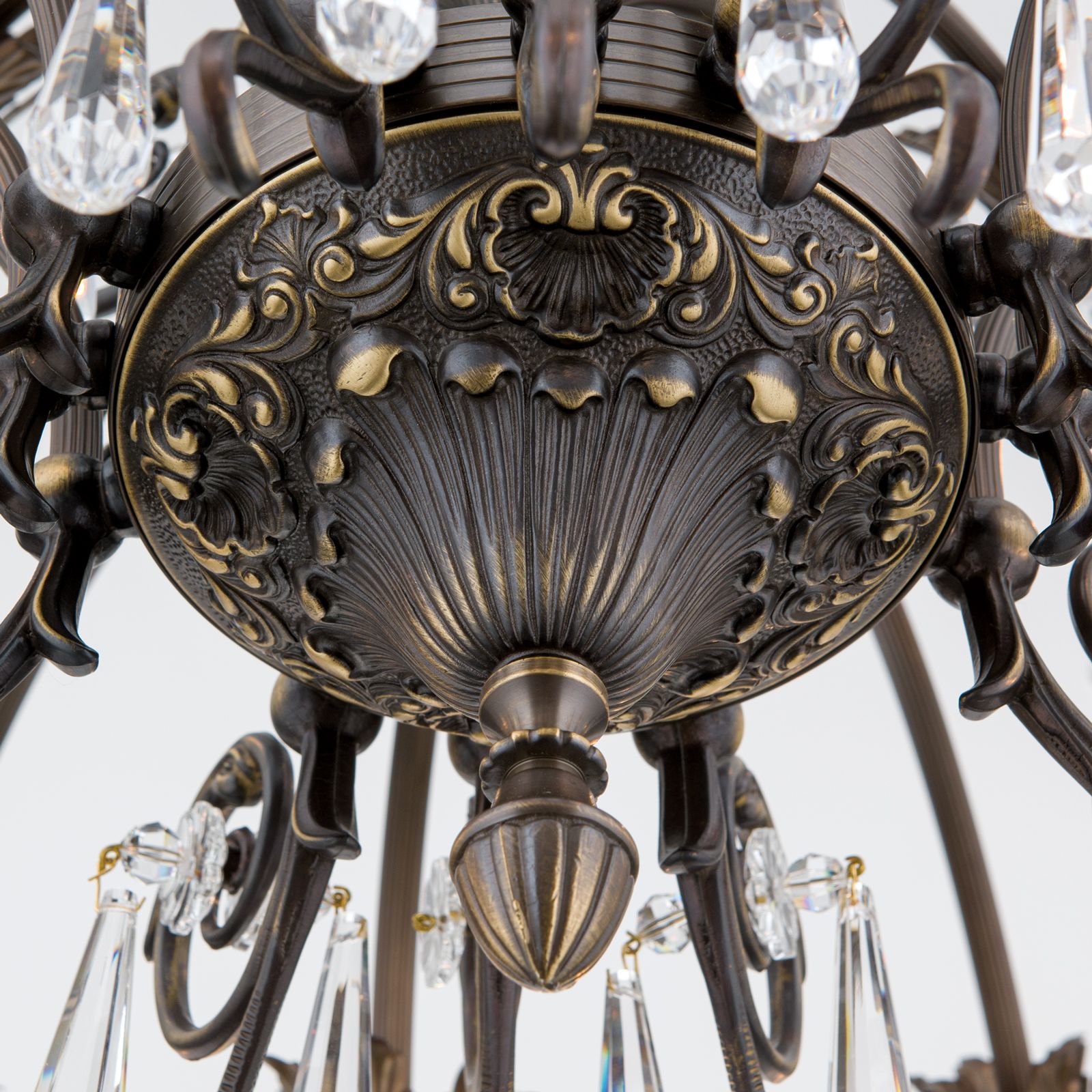 The chandelier is equipped with an impressive 16 G9 holders, which can be fitted with a maximum of 40 watts. A dimmer can be used to create individual lighting conditions. The chandelier is available in hand-shaded antique patina, antique silver and gold.