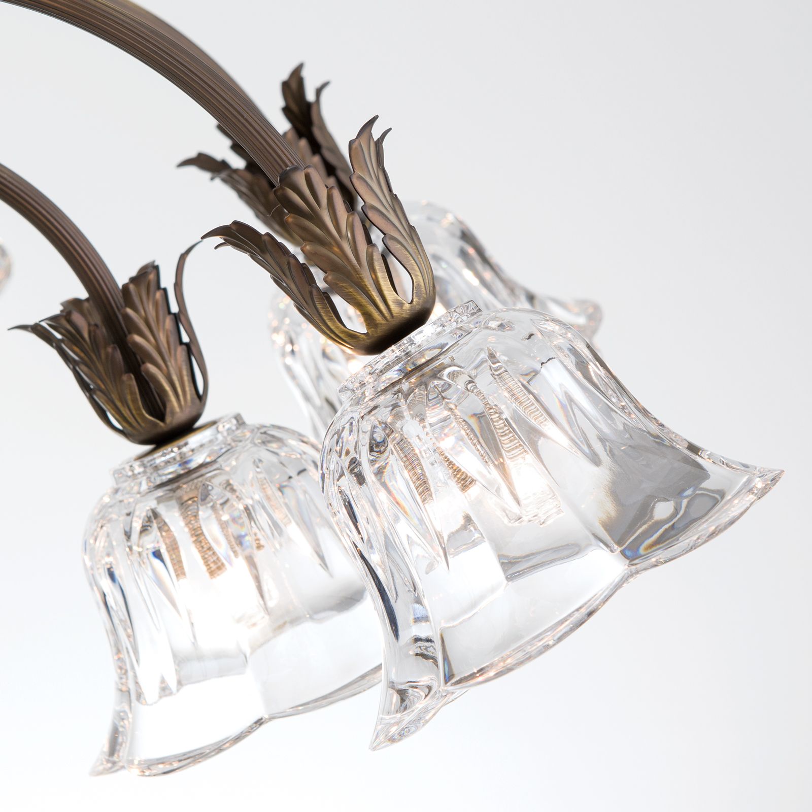 The lovingly designed details extend from the ceiling rose to the crystal shades. The light frame is made of solid brass. The ornately decorated column carries 16 fluted arms with their crystal shades, which curve downwards at a sweeping angle, allowing the light to be widely diffused and thus contribute to the basic illumination of a room. The acanthus leaves attached to the transparent crystal shades beautifully round off the appearance of a flower. Even more extravagance is provided by the numerous droplet-shaped 1A full-cut chandelier crystals.