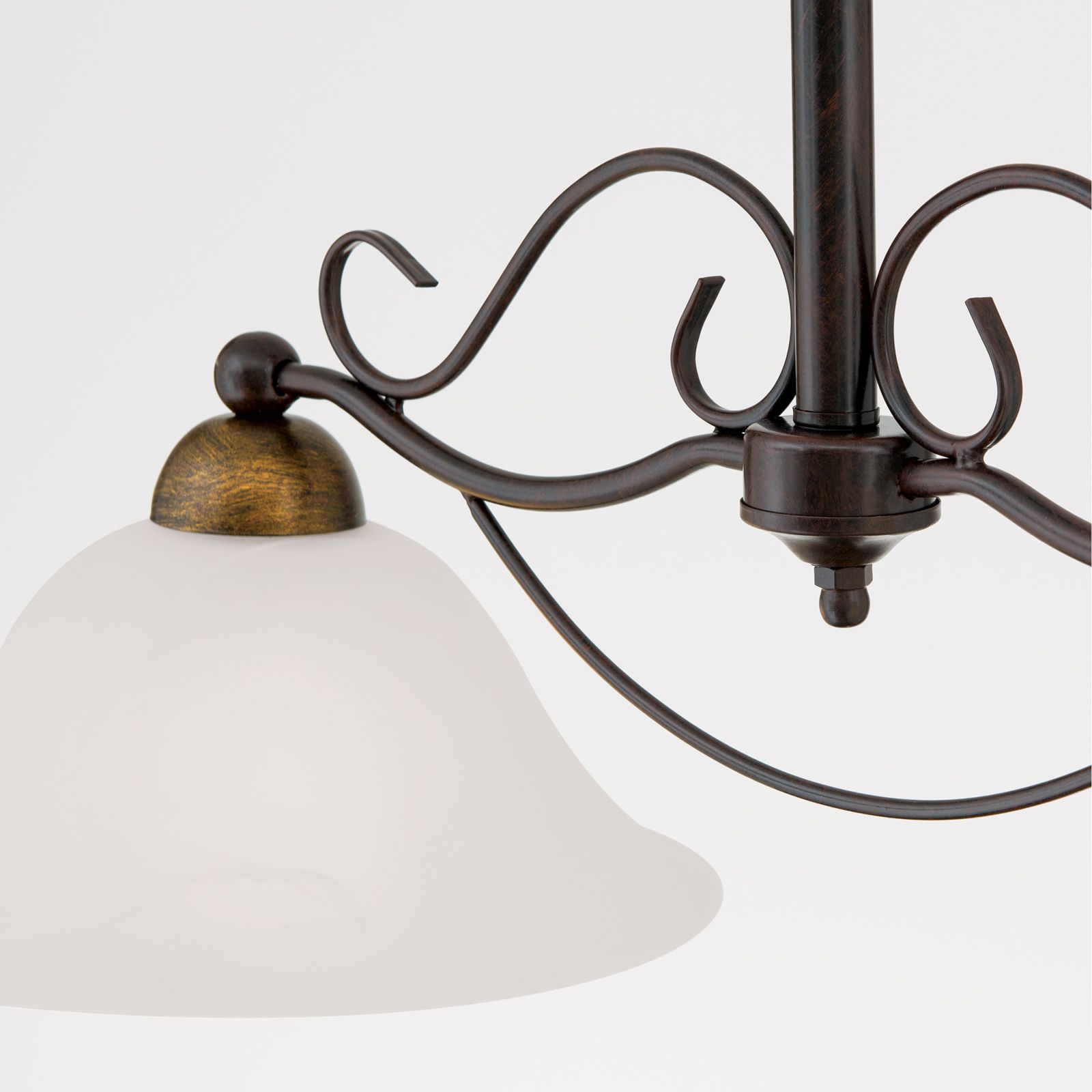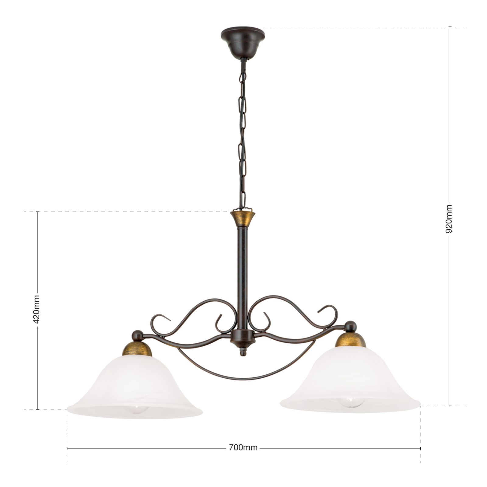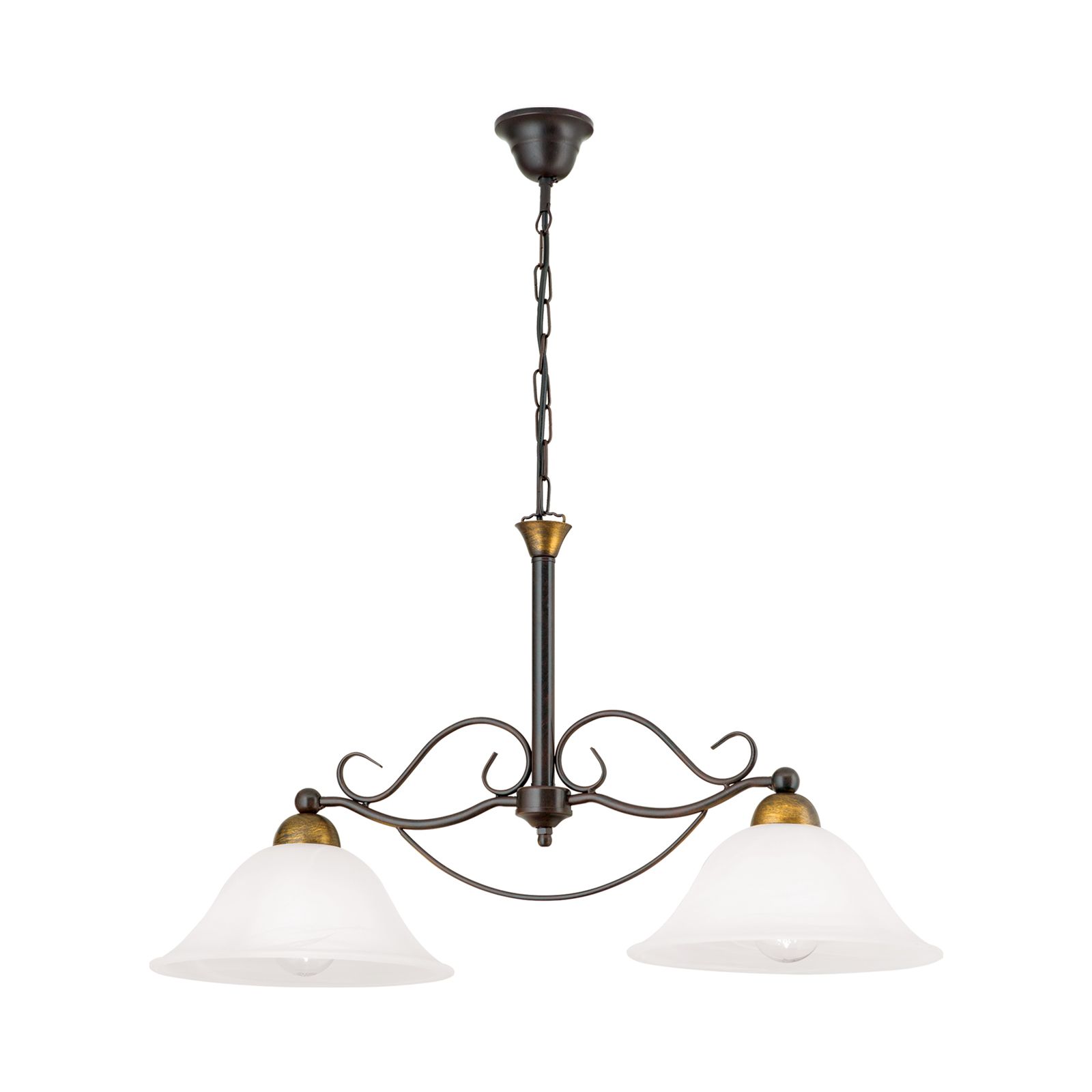Two-flame chandelier LUDO comes with rustic charm. Playful elements decorate its robust steel frame refined with antique gold finish. The opal matt glass shades resemble spring flowers with their wide-open bell shape, are located on two stays. This way, the bulb tip remains clearly visible adding to that certain timeless playfulness. Matt LED bulbs with E27 sockets are the best fit since they shine glare-free away from the satin lampshades.