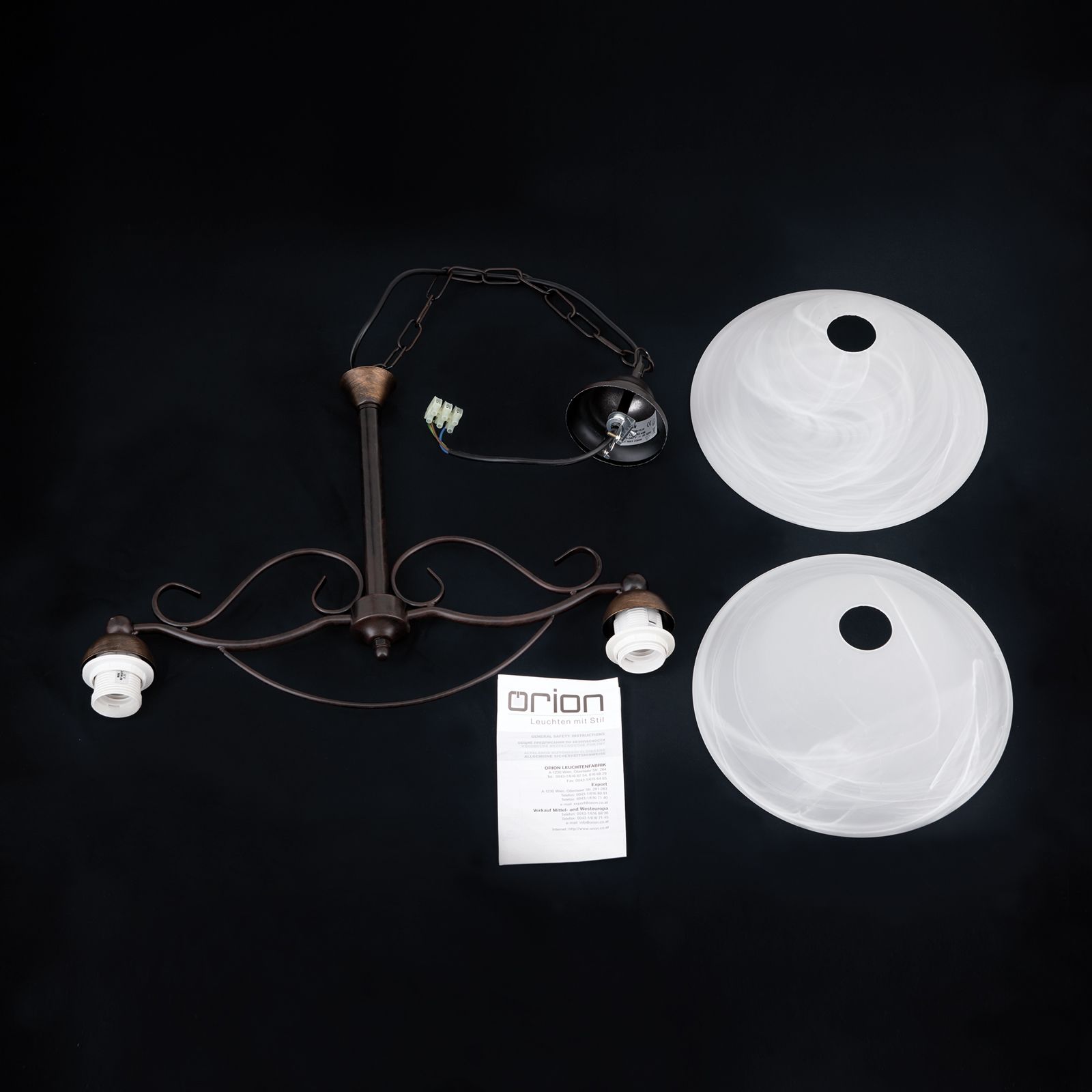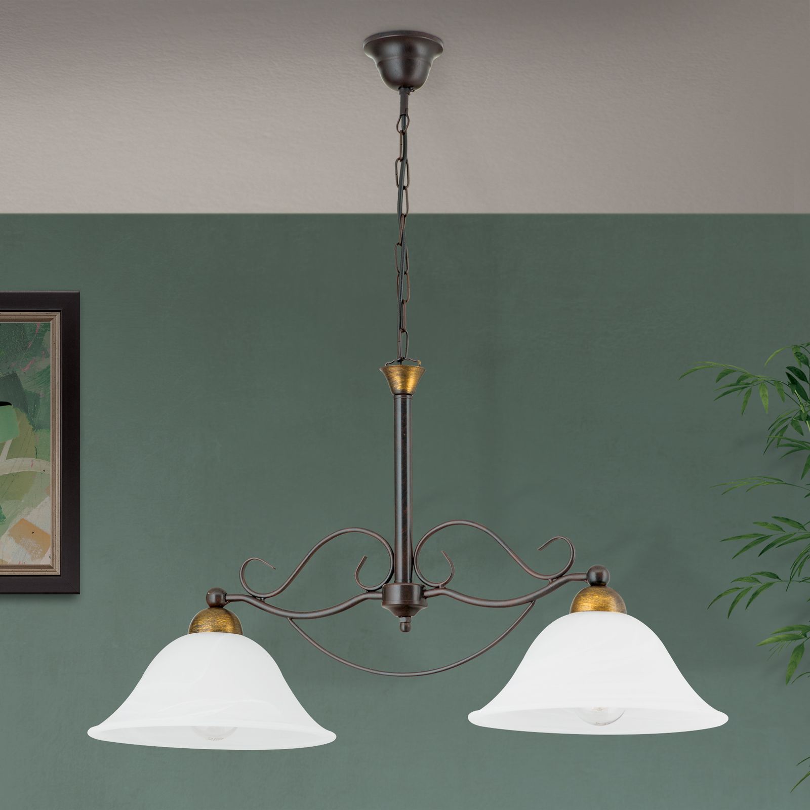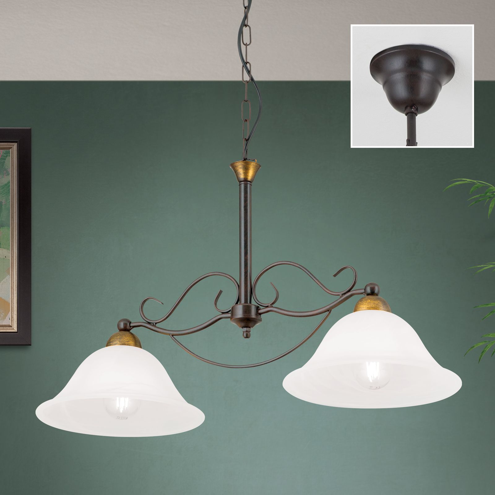 Two-flame chandelier LUDO comes with rustic charm. Playful elements decorate its robust steel frame refined with antique gold finish. The opal matt glass shades resemble spring flowers with their wide-open bell shape, are located on two stays. This way, the bulb tip remains clearly visible adding to that certain timeless playfulness. Matt LED bulbs with E27 sockets are the best fit since they shine glare-free away from the satin lampshades.
