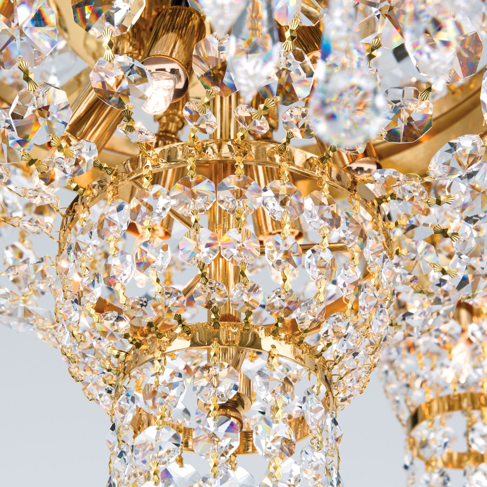 When looking at chandelier ORIENTAL, one feels transported into a fairy tale from 1001 nights. The elaborate design of the 24 carat gold-plated solid brass frame fitted with SCHÖLER CRYSTAL® chandelier crystal has a playful and dreamy effect. On entering a living room or large entrance area, the chandelier automatically becomes a captivating eye-catcher.