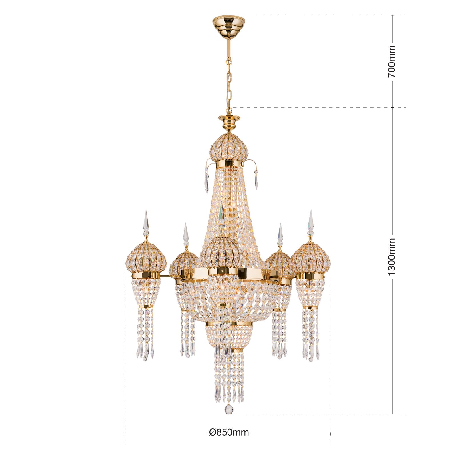 The magnificent crystal chandeliers from the ORIENTAL series are reminiscent of 1001 nights fairy tales exuding plenty of oriental flair. With its magnificent exterior and considerable height of 130 cm with diameter of 85 cm, this chandelier is suited for rooms with high ceilings. With its elaborate referencing of oriental architecture, it instantly turns into the fabulously shining sensation in any living room or entrance area.