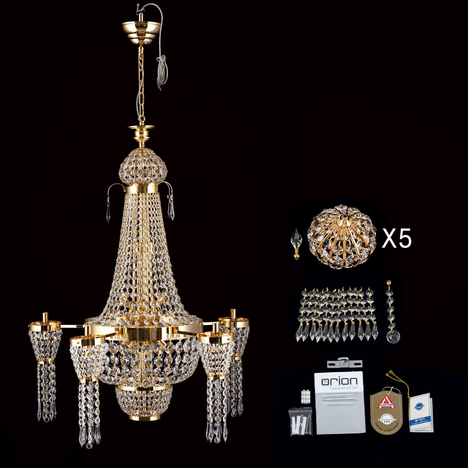 The countless SCHÖLER CRYSTAL® crystals in various cuts adorn the main light as well as the connected five smaller lights and are complemented by 24-carat gold-plated frame rings. Extra polish is provided by crystal bulbs located on the small side chandeliers' crystal dome.