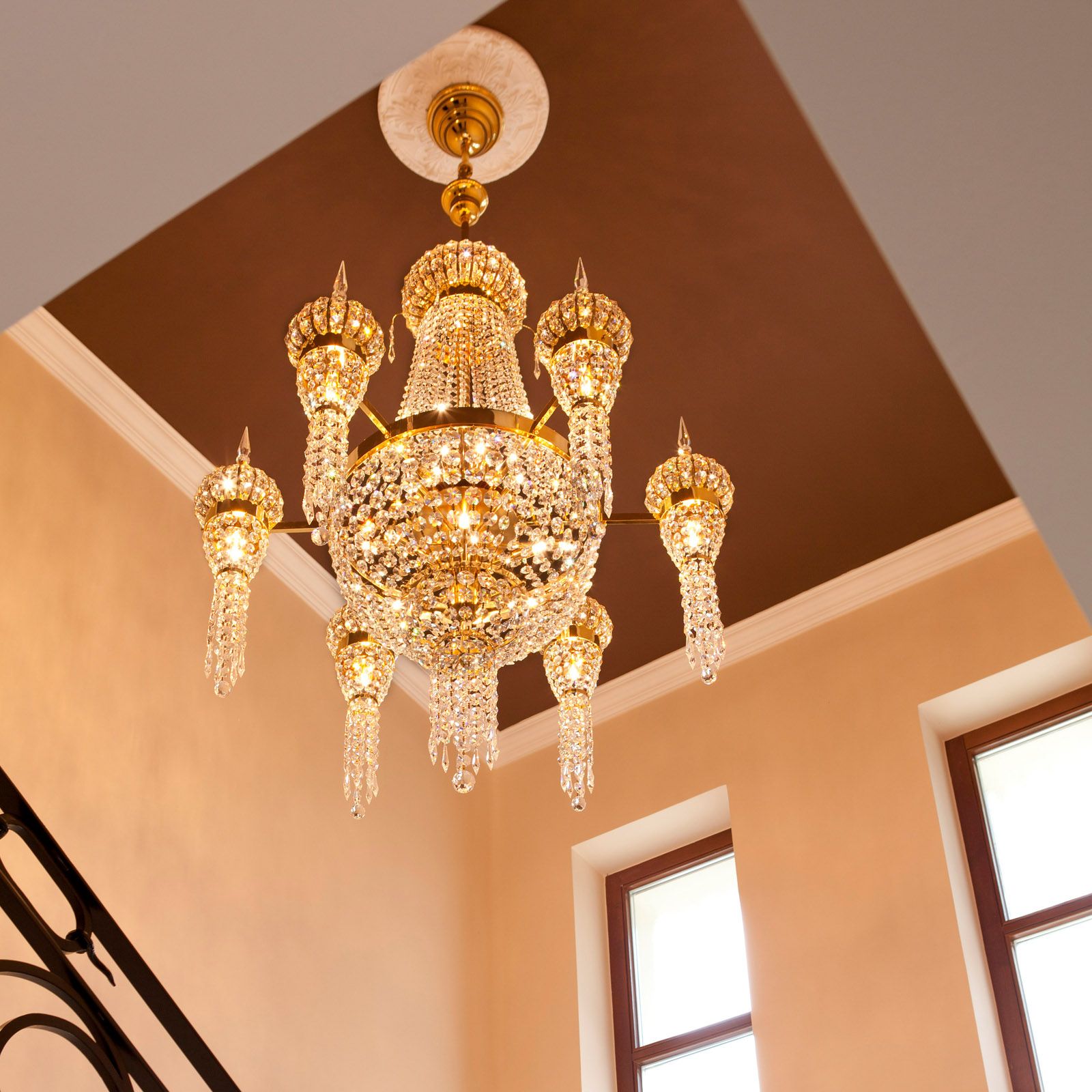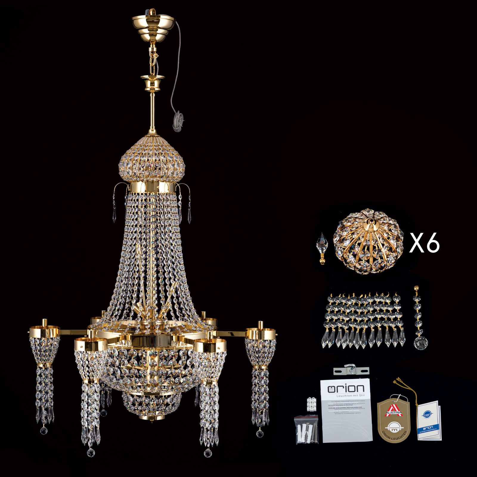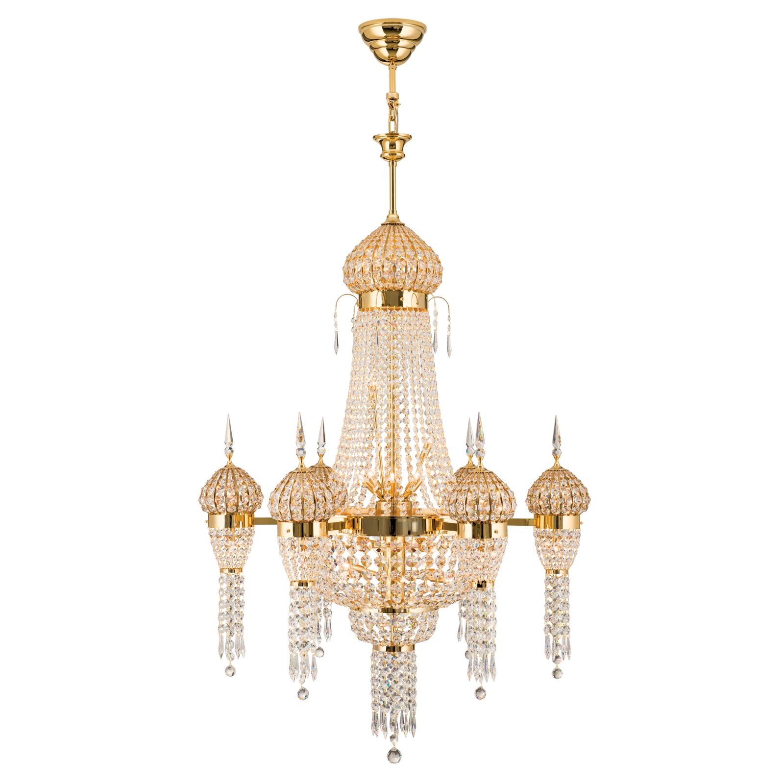 This impressive crystal chandelier's main feature are domes formed out of SCHÖLER CRYSTAL® octagons and 24 carat gold-plated solid brass parts, reminiscent of magnificent oriental buildings. The creative design makes it look playful and skillfully spreads oriental flair. With an impressive height of 160 cm, it is suited for rooms with a height of 4 metres or more.