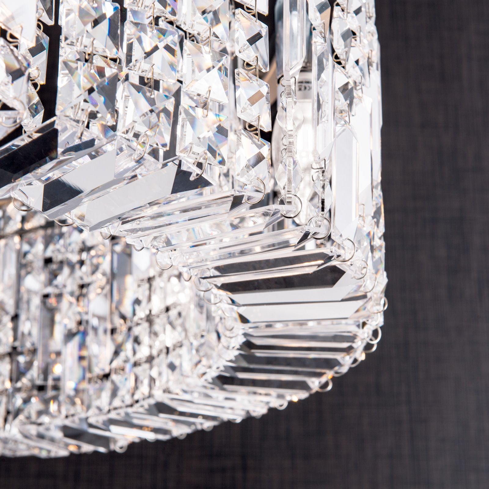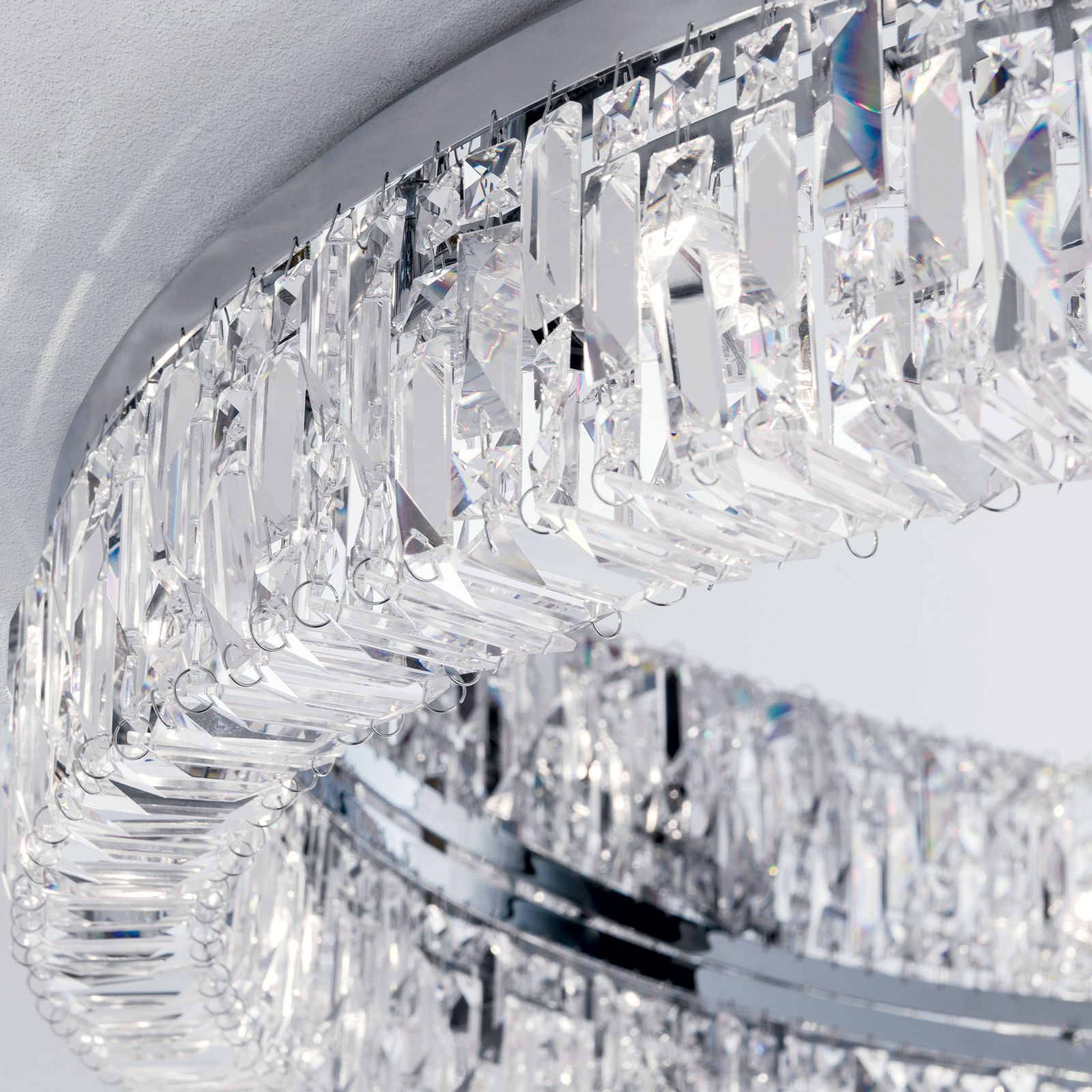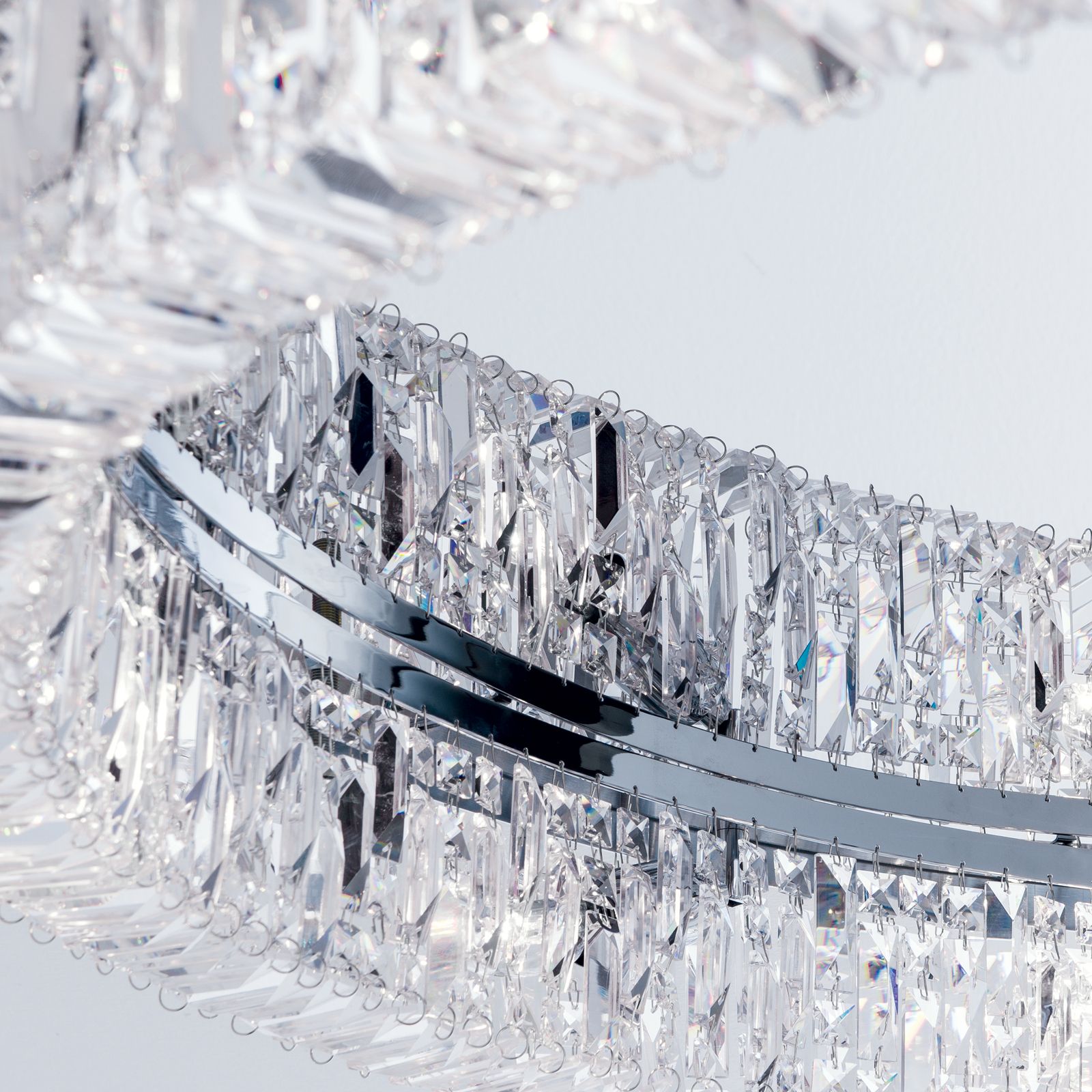 Chandelier RING captivates with its clear geometric shape and modern chandelier crystal. Mounted above dining tables or in living rooms, it beautifully illuminates the desired area simultaneously providing splendid light reflections enhanced by its mirrored interior. The chandelier with a diameter of 110 cm consists of a round chrome-plated brass frame on which individual clear crystal prisms are chained together. Like a sparkling curtain, it surrounds 12 light bulbs with E14 bases. Even when switched off, the high-quality SCHÖLER CRYSTAL® crystals are fascinating, making the chandelier a special home accessory. The total height is 30-160 cm with a suspension of 150 cm. This item is available in chrome and gold and is dimmable.