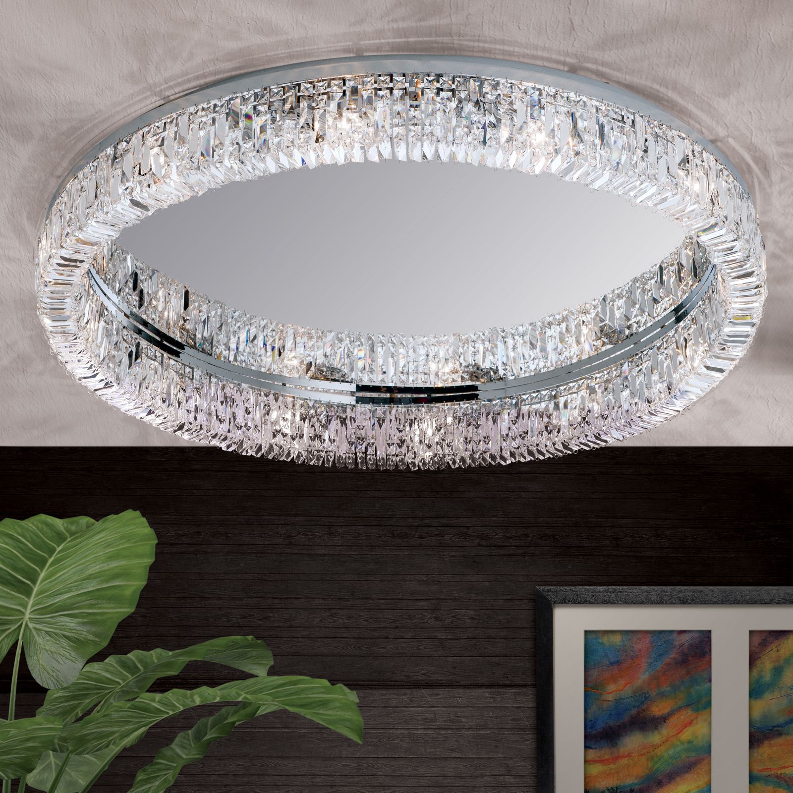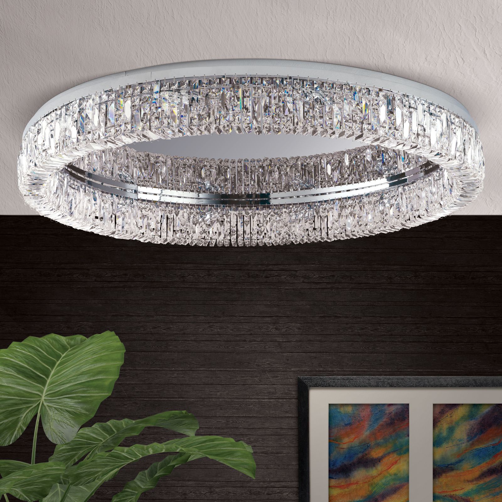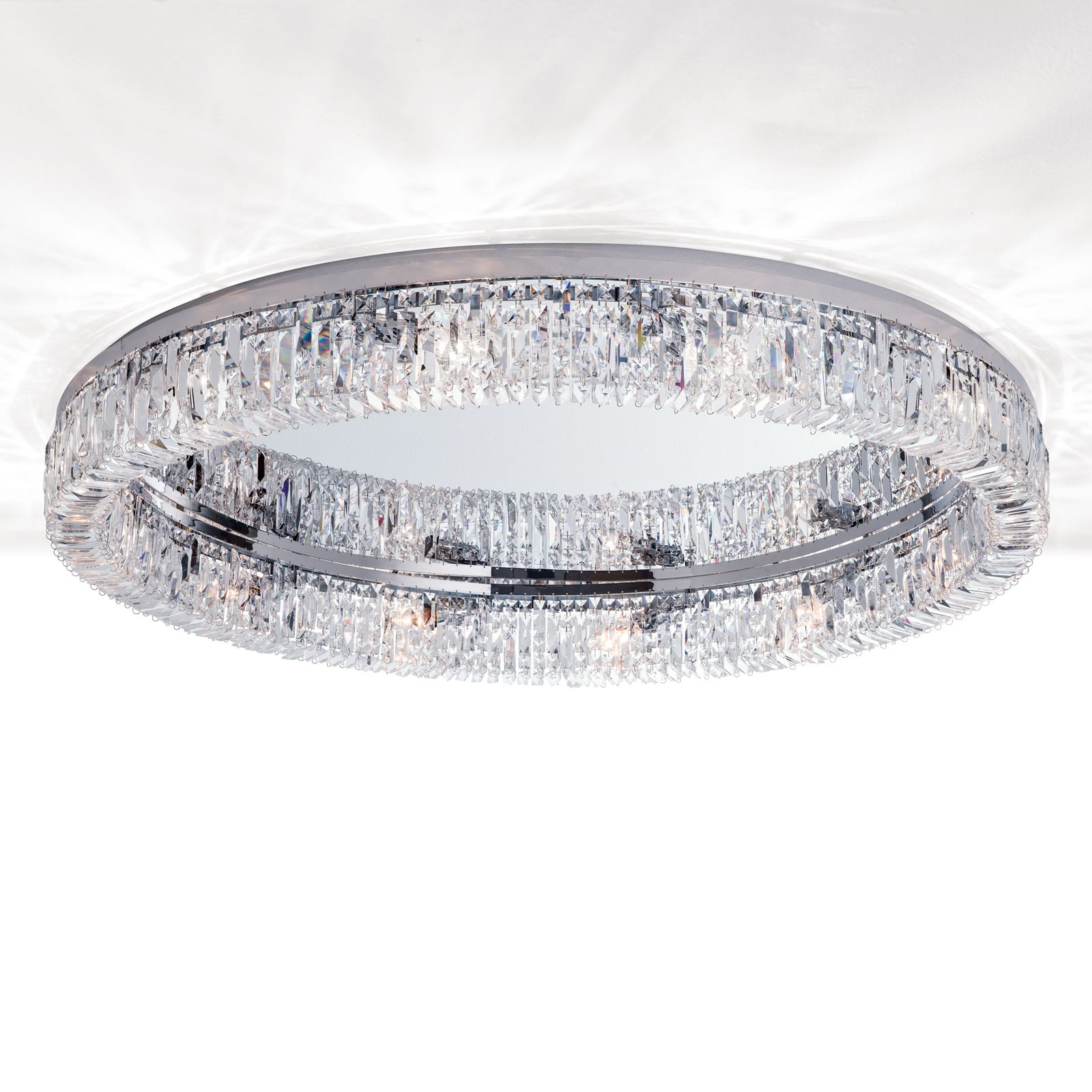 Chandelier RING captivates with its clear geometric shape and modern chandelier crystal. Mounted above dining tables or in living rooms, it beautifully illuminates the desired area simultaneously providing splendid light reflections enhanced by its mirrored interior. The chandelier with a diameter of 110 cm consists of a round chrome-plated brass frame on which individual clear crystal prisms are chained together. Like a sparkling curtain, it surrounds 12 light bulbs with E14 bases. Even when switched off, the high-quality SCHÖLER CRYSTAL® crystals are fascinating, making the chandelier a special home accessory. The total height is 30-160 cm with a suspension of 150 cm. This item is available in chrome and gold and is dimmable.