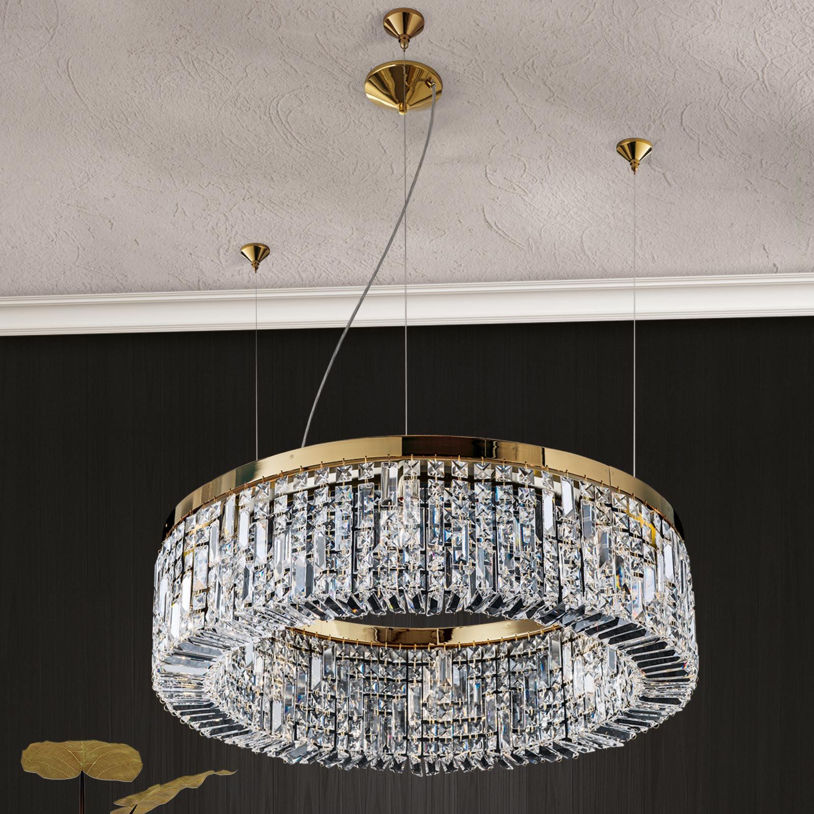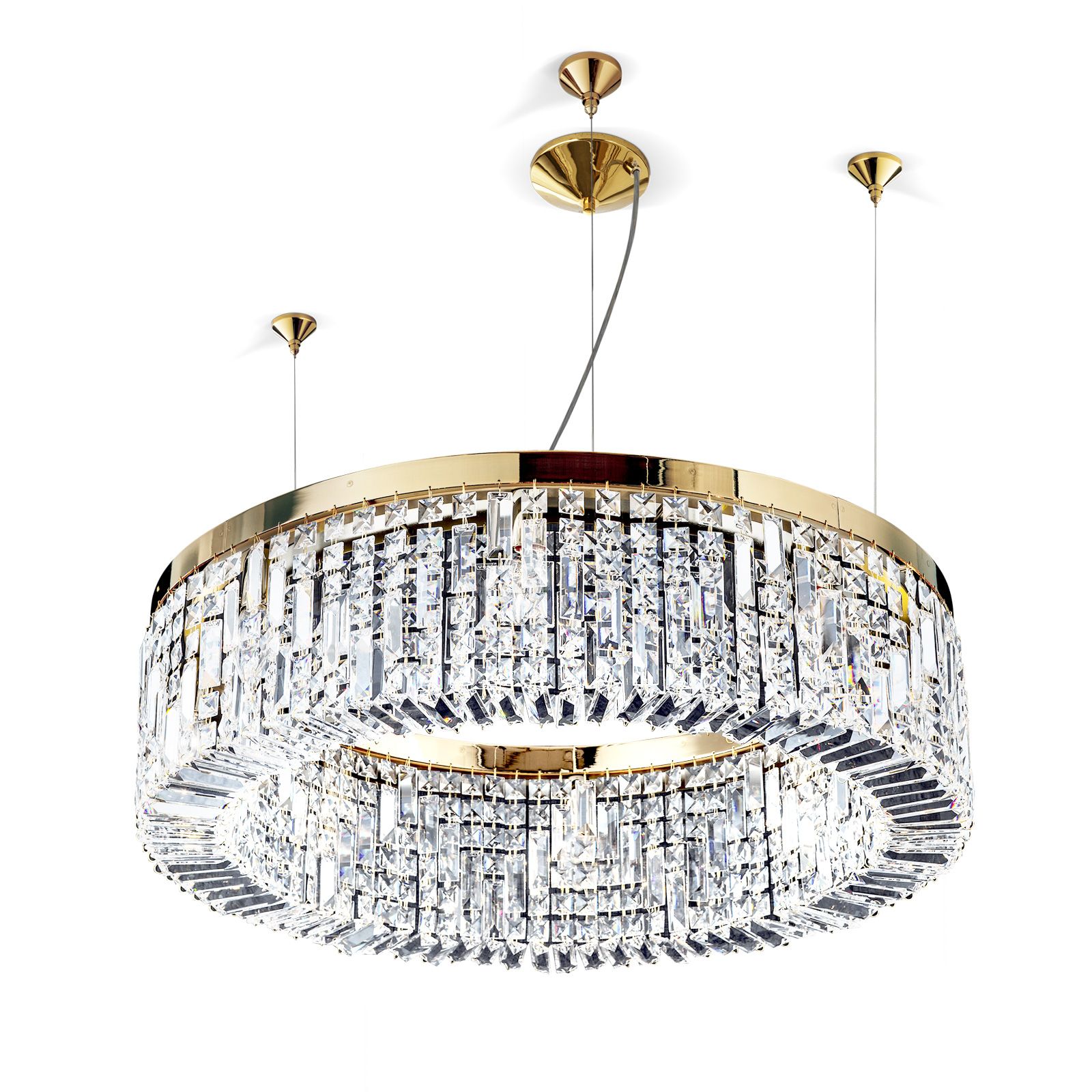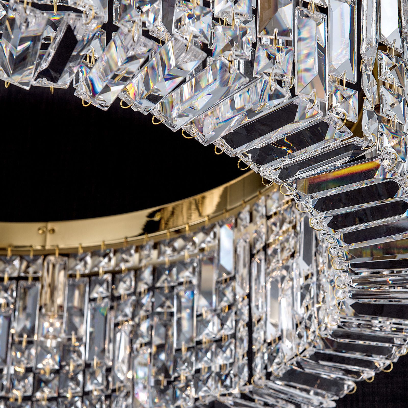 The extravagant chandelier from the RING series is a true gem that integrated well into both classical and modern interiors. In dining and living rooms, it illuminates the consigned area. Numerous clear Asfour crystals in prism form are attached to a round brass frame giving off unique lighting effects. The shiny finish intensifies the shapely crystals' sparkle providing special light reflections not only when switched on. 8 illuminants are installed behind the chandelier's crystal and can be fitted with 40 watts maximum. A dimmer can regulate light brightness to favourably influence the atmosphere. The chandelier RING has a total height of 30-160 cm with a suspension of 150 cm and a diameter of 80 cm. It is available in chrome and gold.