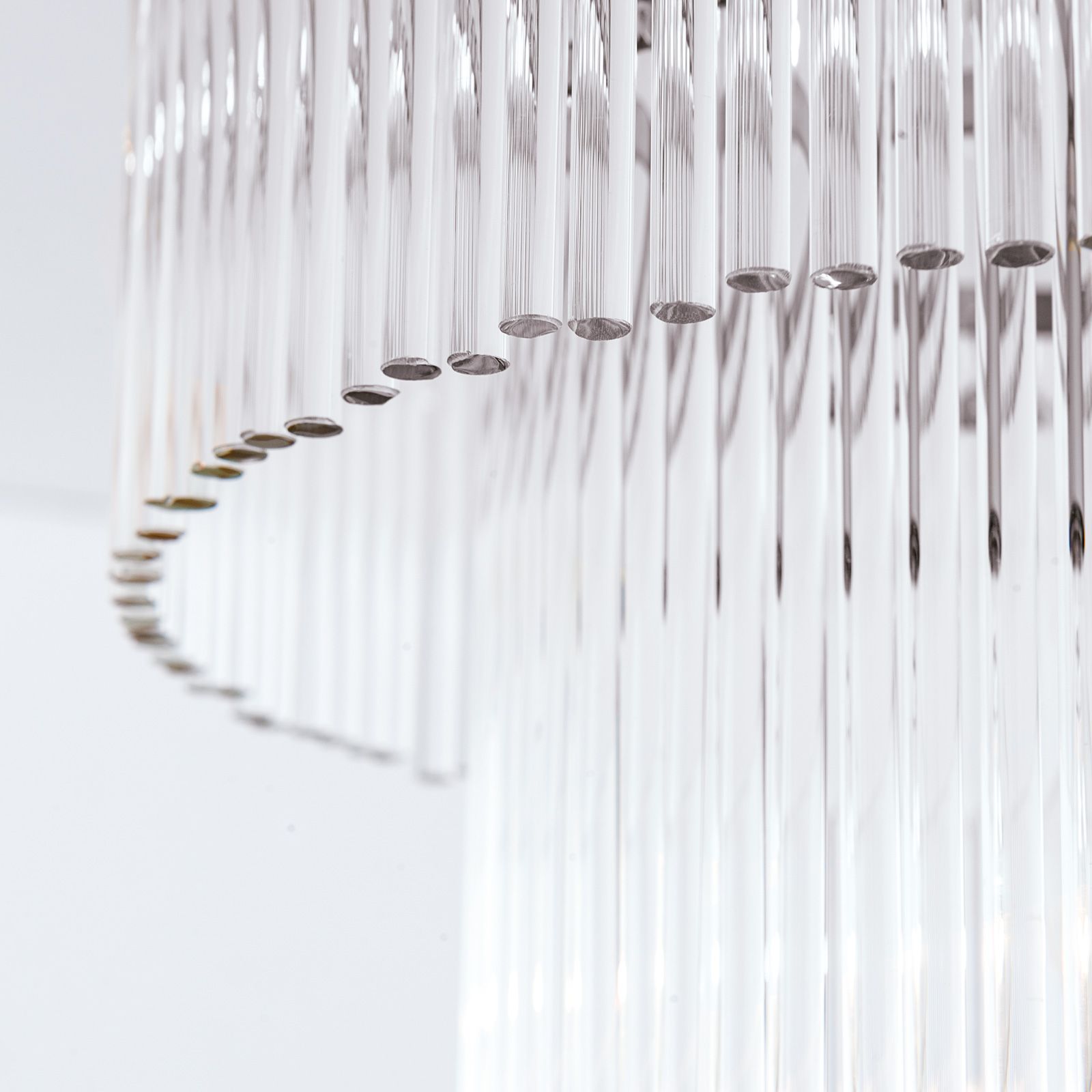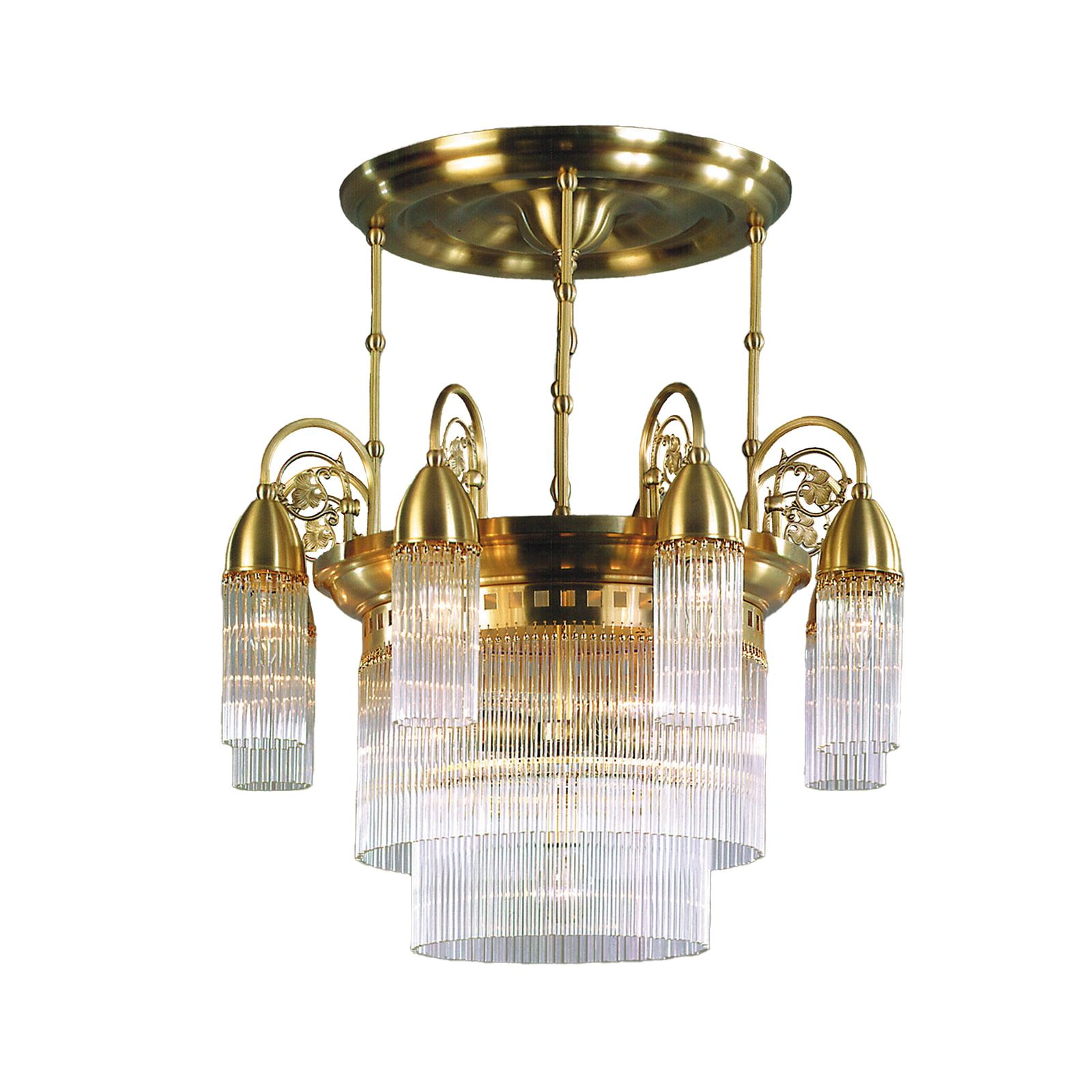 STÄBCHENSERIE (chandelier series) is dedicated to the trend of Art Nouveau oriented towards modern objectivity. The 9-flames chandelier from this collection reflects this style exemplarily. A simple ring-shaped arrangement of outer flames and two inner circles of glass rods form the geometric light structure. The glass rods subtly create a closed body around the lamps while maintaining a transparent lightness. Light radiates compactly to the sides and downwards, ensuring uniform illumination of large living or reception rooms with furnishings ranging from Baroque to Art Nouveau. Eight E14 sockets with 40 watts maximum each and four E27 sockets with 60 watts maximum each are fitted.